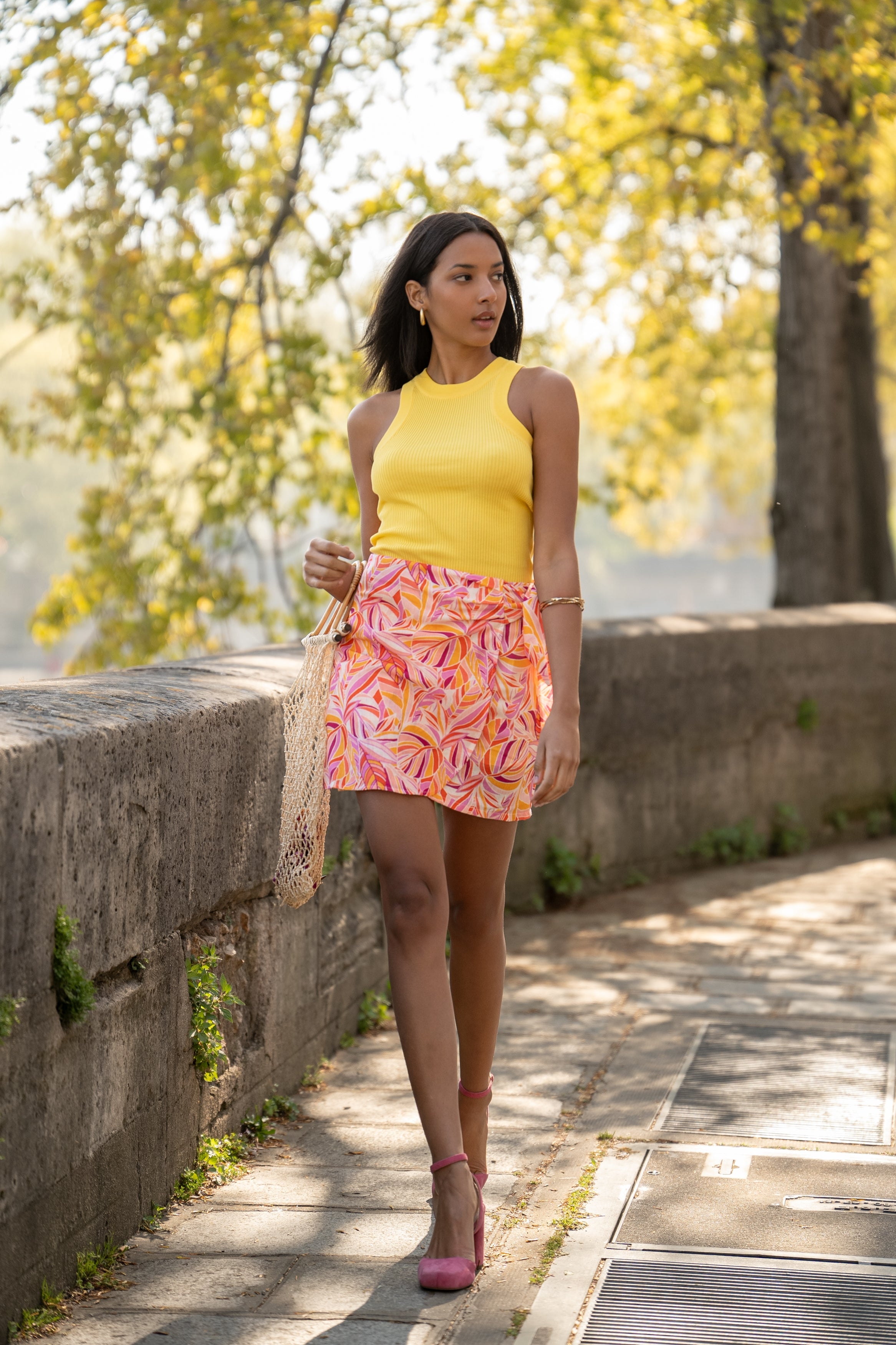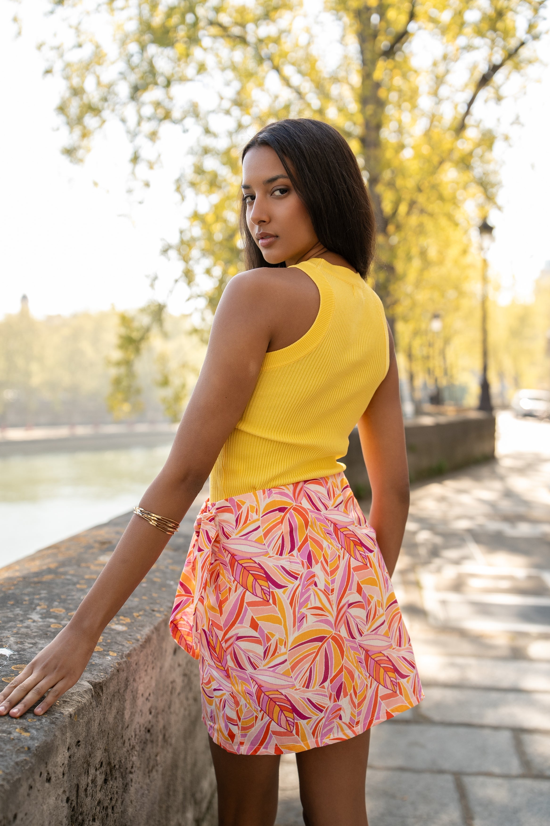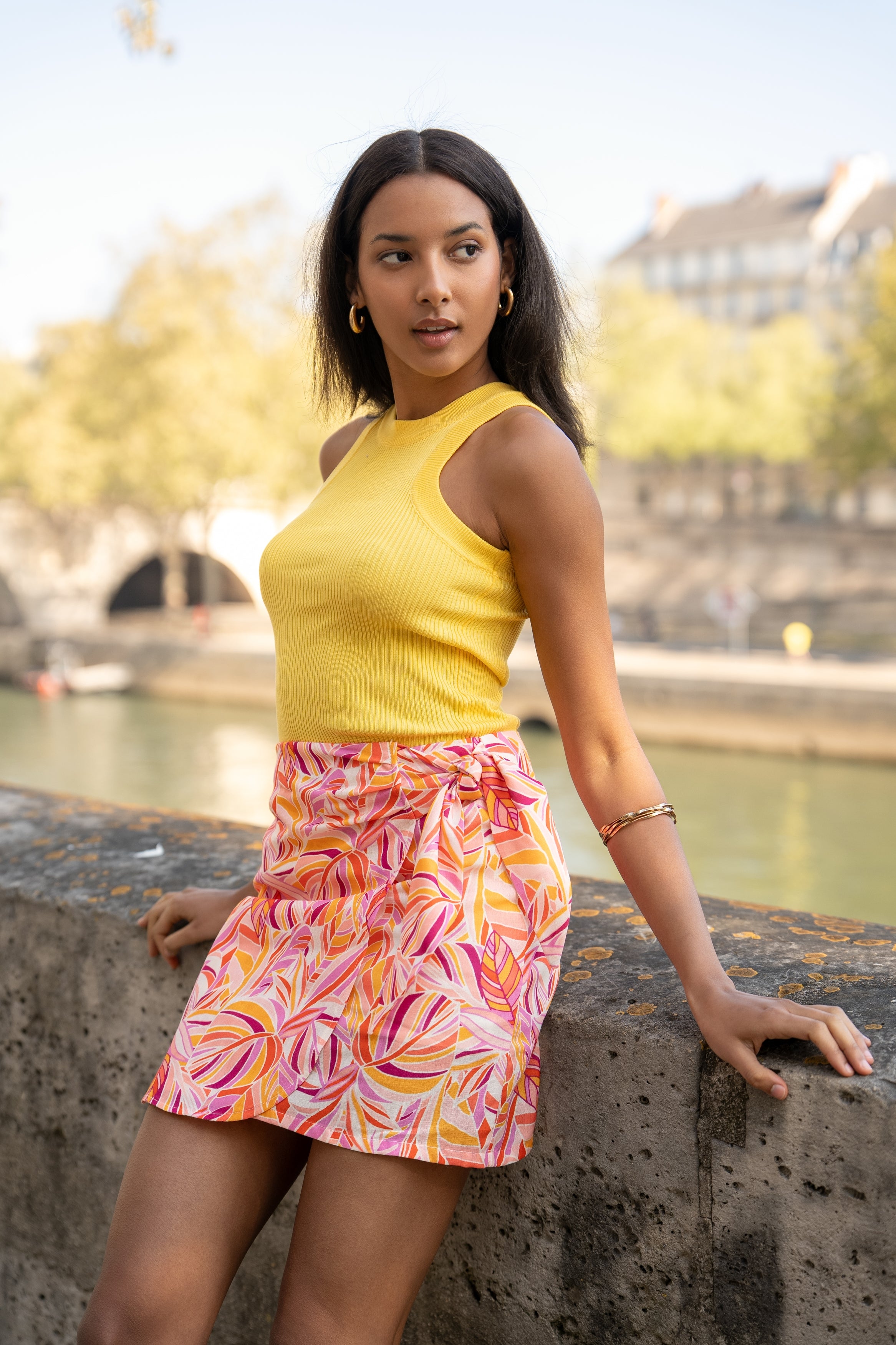 La jupe nouée Hana apporte une touche de couleur et de vitalité avec son imprimé tropical. On la porte avec un top ou une chemise, pour un look aussi adapté aux vacances qu'à la ville.