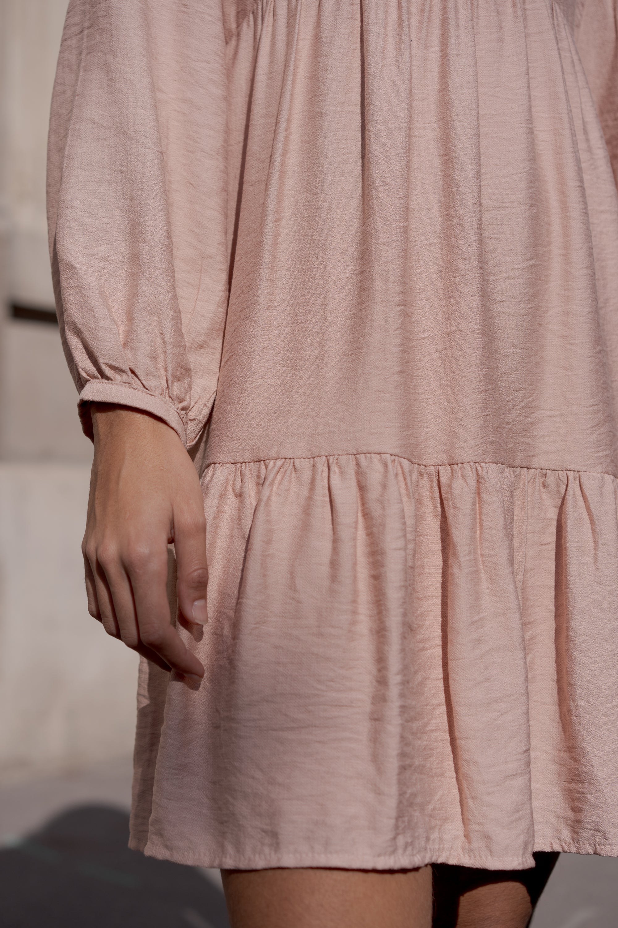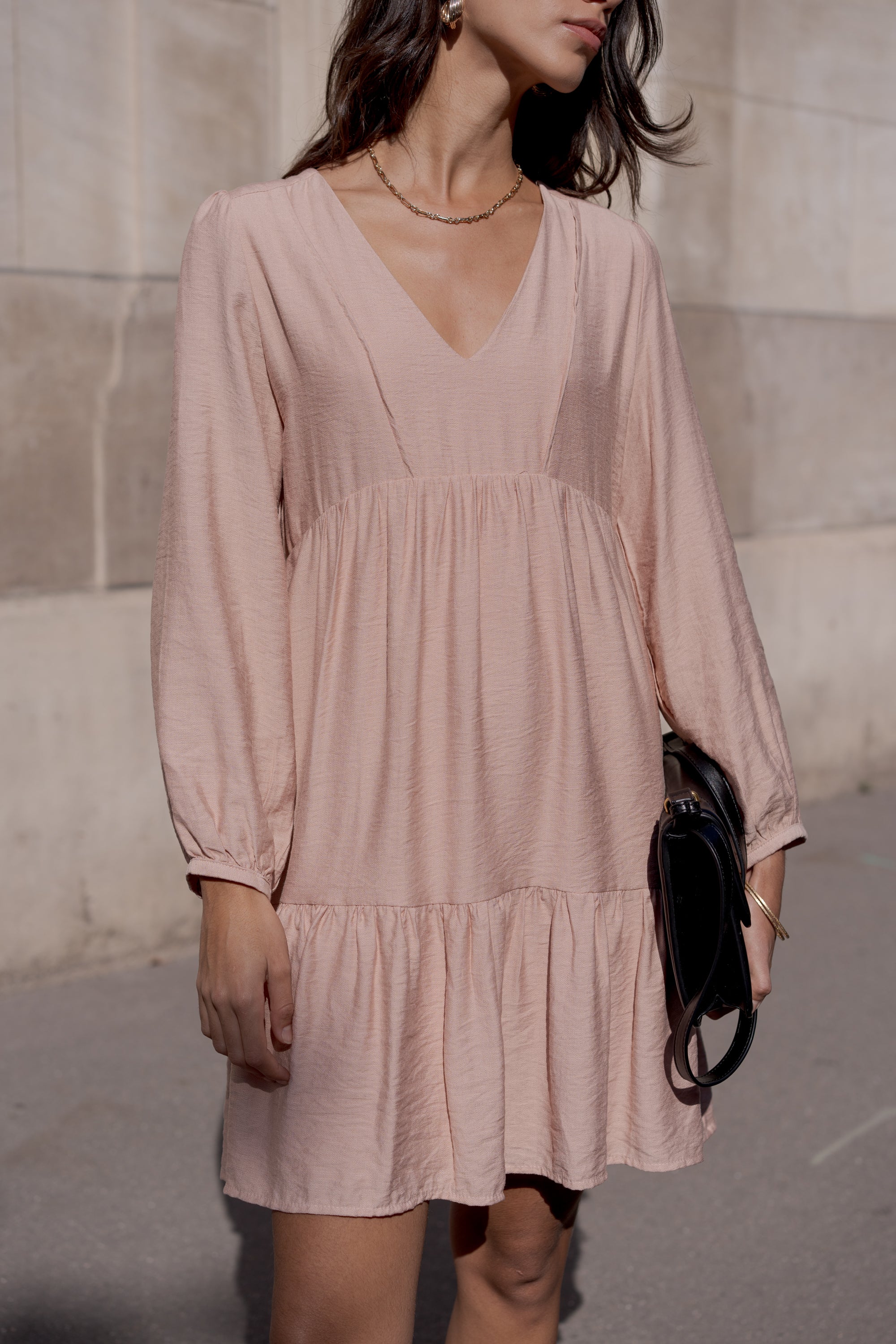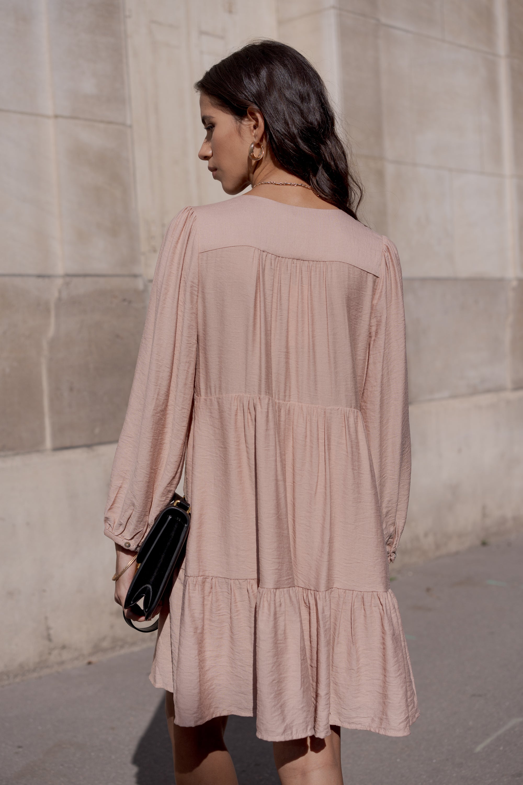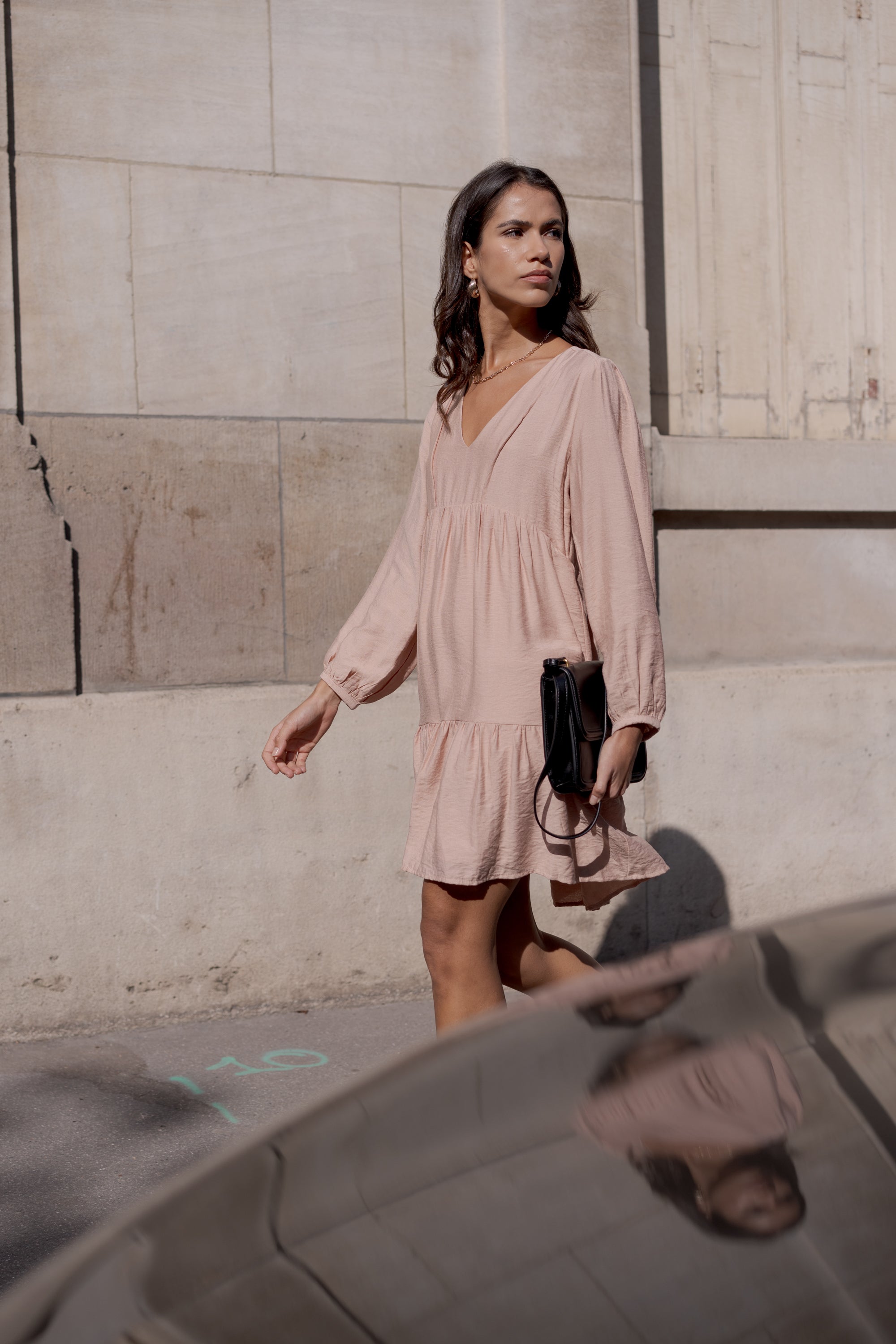 La robe à manches longues Noélie incarne le style bohème avec sa coupe droite flatteuse et son col en V élégant.