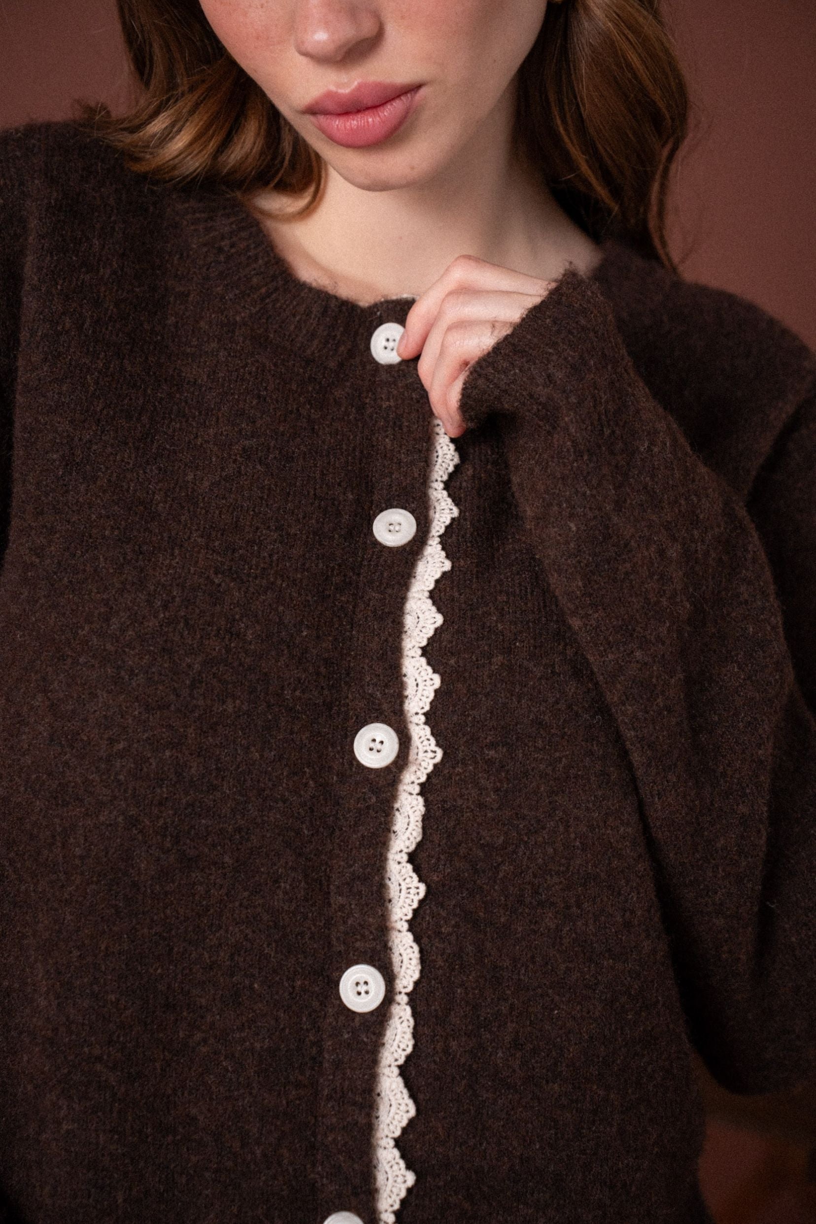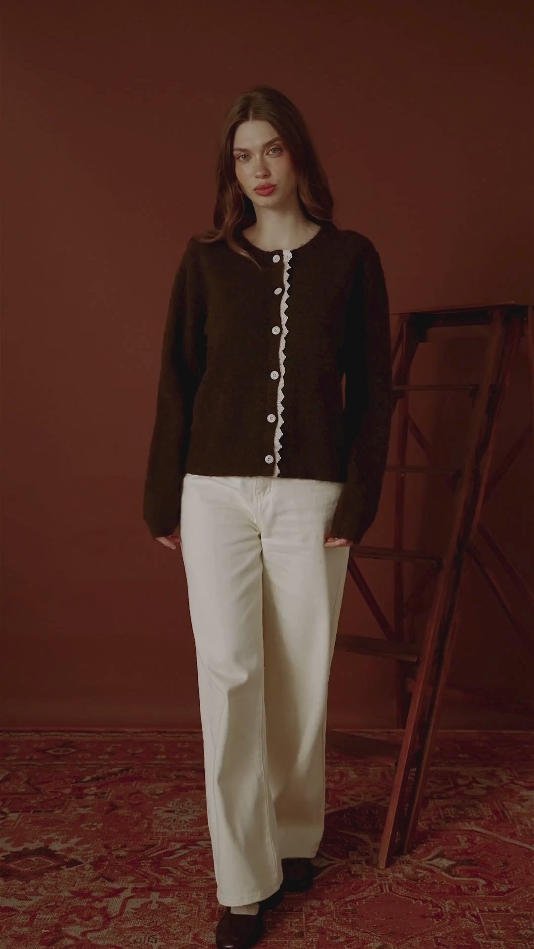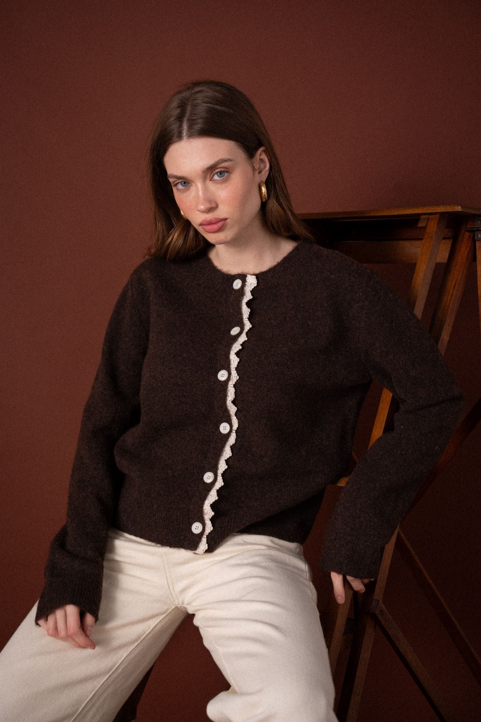 Sa bordure festonnée et ses jolis boutons contrastés soulignent un esprit délicat et travaillé. Avec sa coupe droite et son col rond intemporel, il se porte aussi facilement sur une chemise qu’à même la peau.