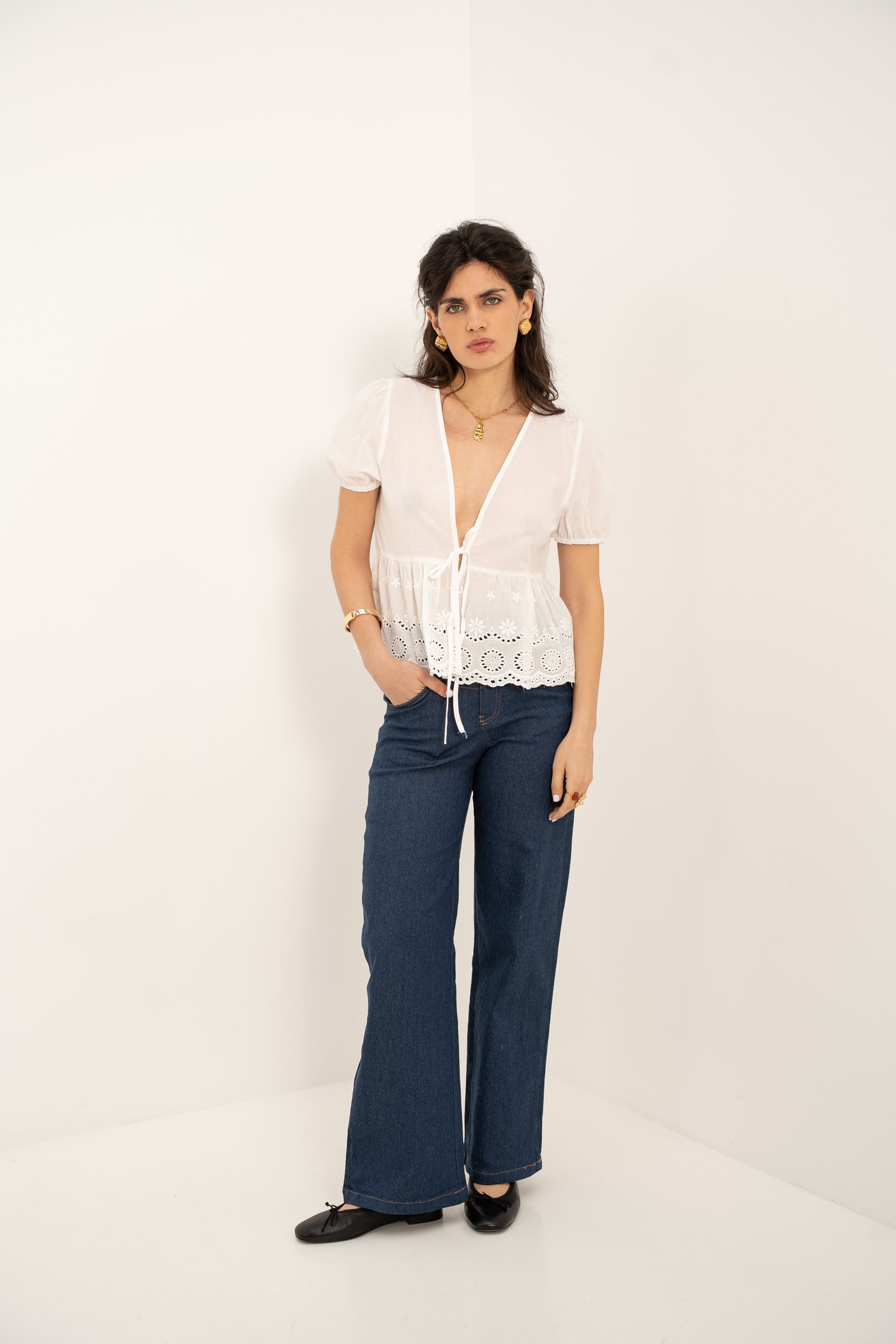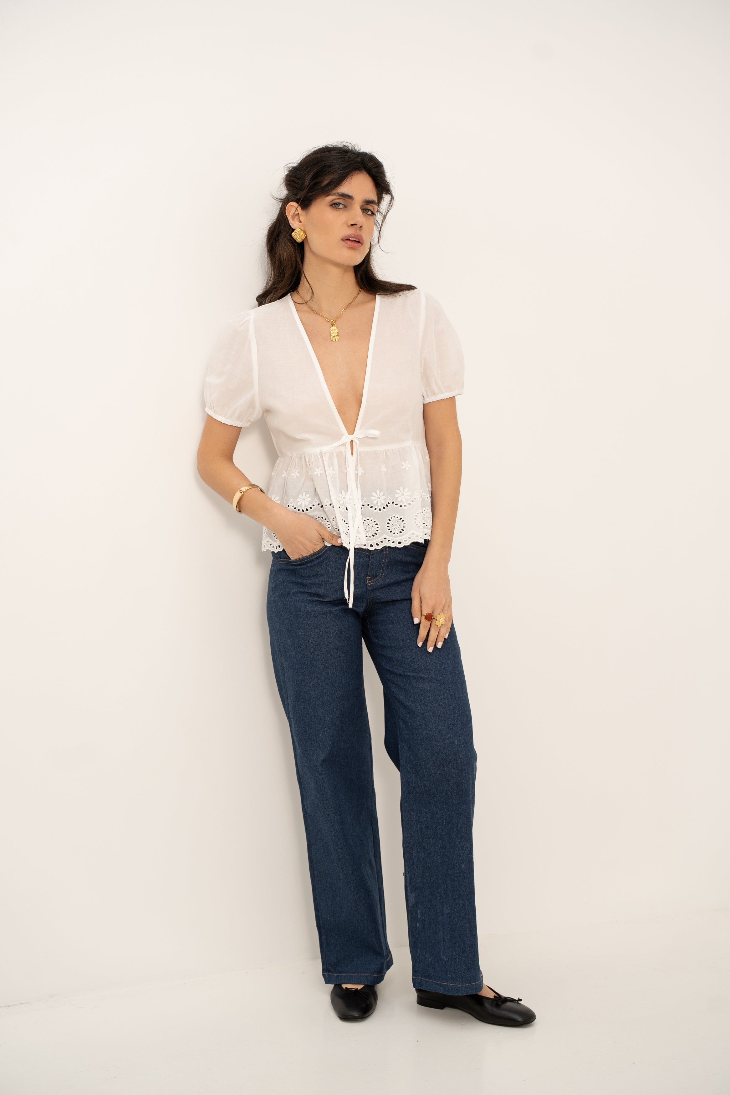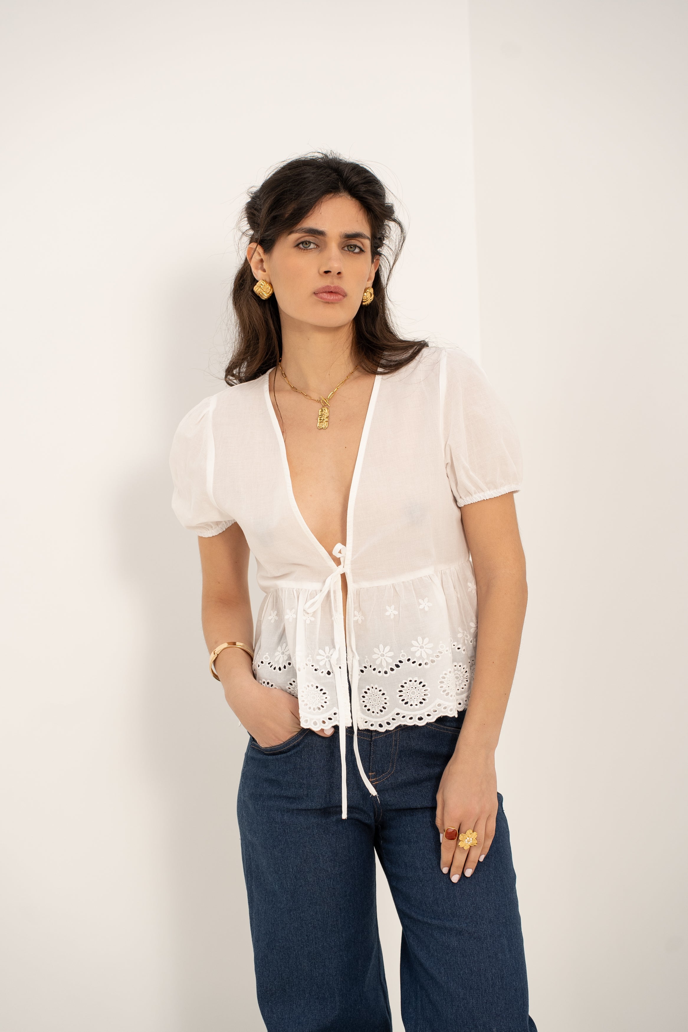 La blouse Léopoldine, à manches courtes, allie légèreté et élégance avec son tissu en coton doux et agréable. Elle se ferme sur le devant avec un nœud délicat, accompagné d'un détail brodé subtil, ajoutant une touche de raffinement à cette pièce. Sa coupe fluide et aérée en fait un choix parfait pour les journées plus chaudes.