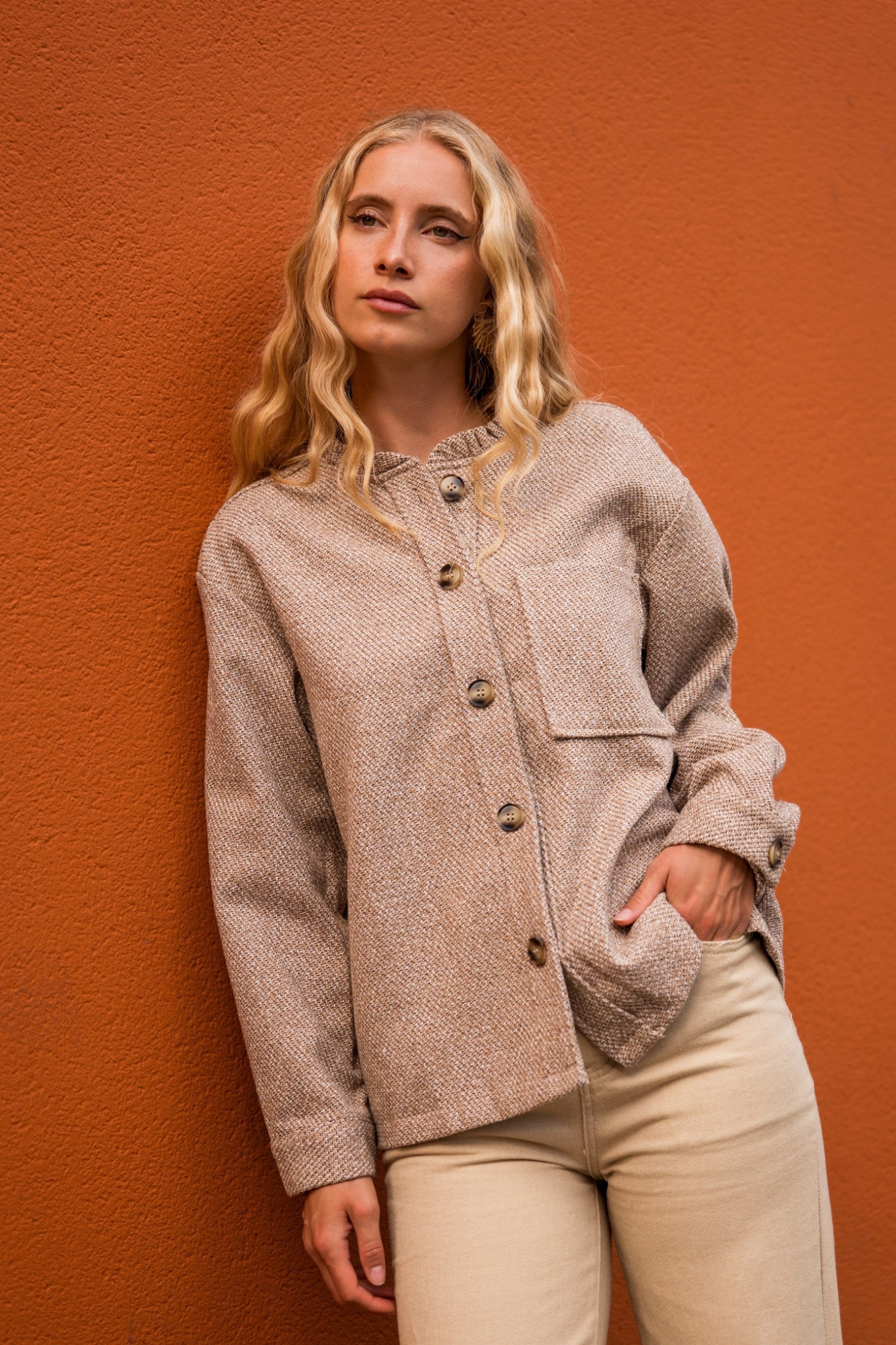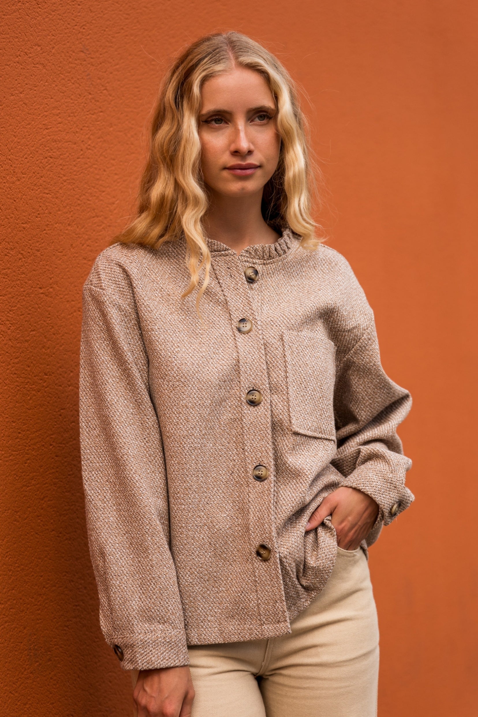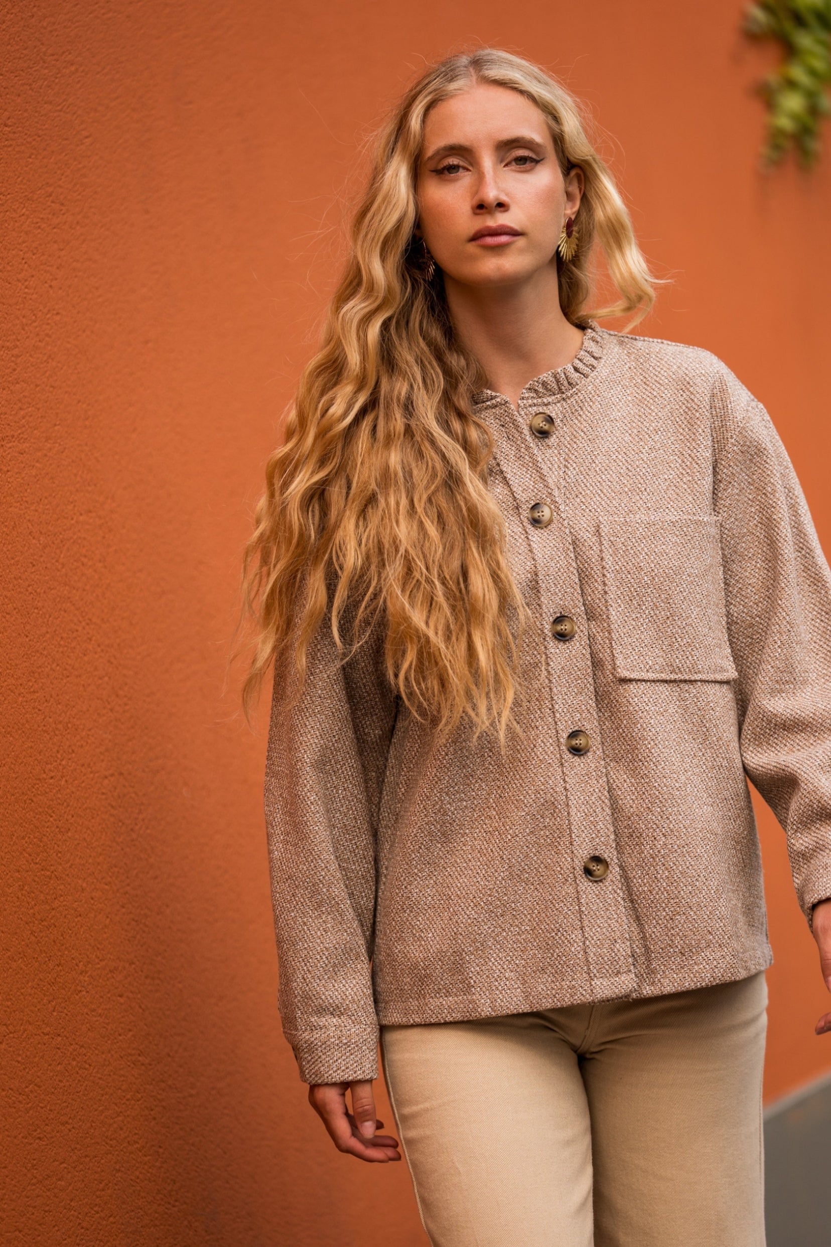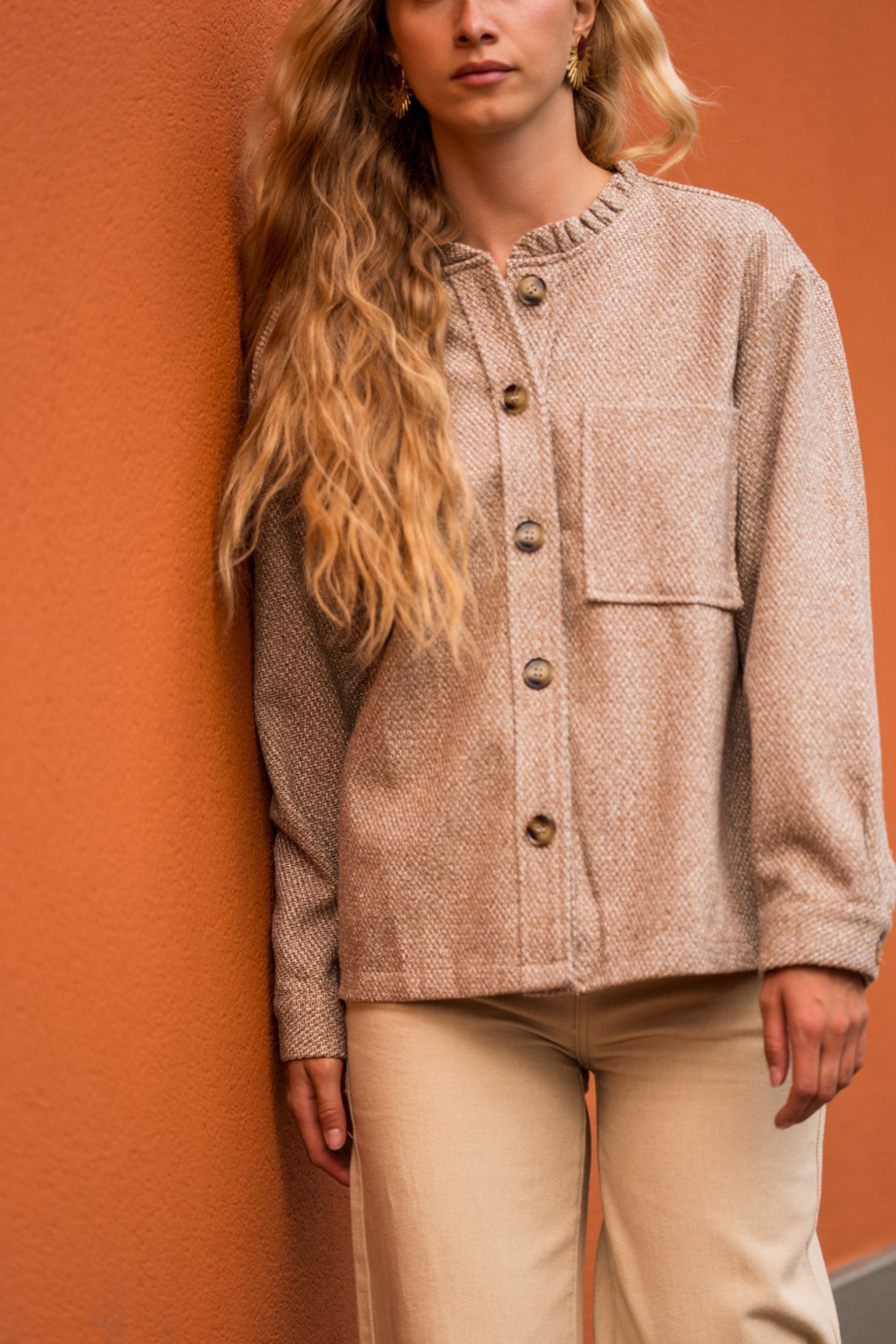 La blouse Oriane séduit par sa coupe droite et fluide, son col rond subtilement froncé et ses manches longues pensées pour le quotidien. Sa poche plaquée poitrine et son boutonnage apparent ajoutent une note de praticité tout en douceur.