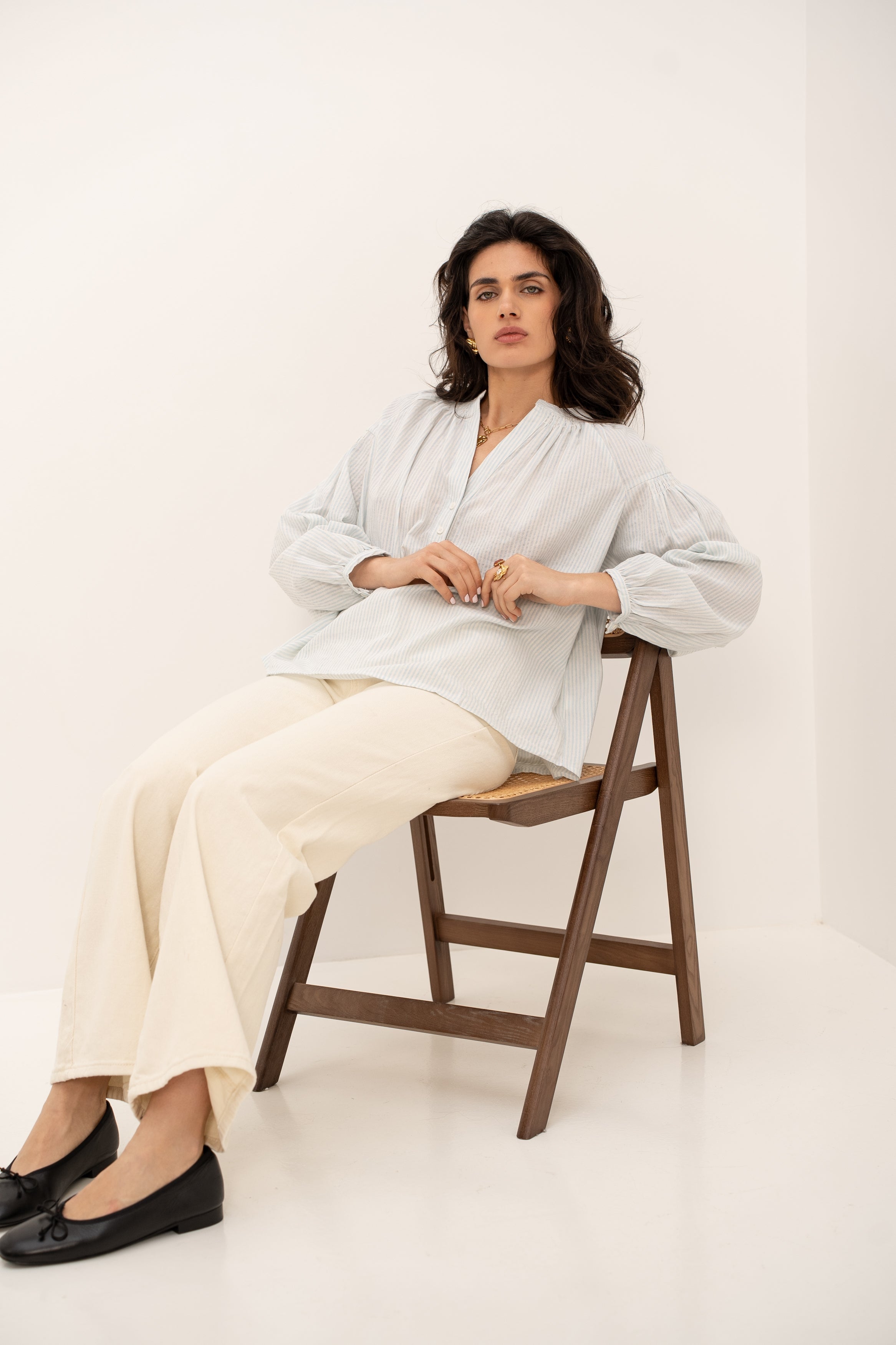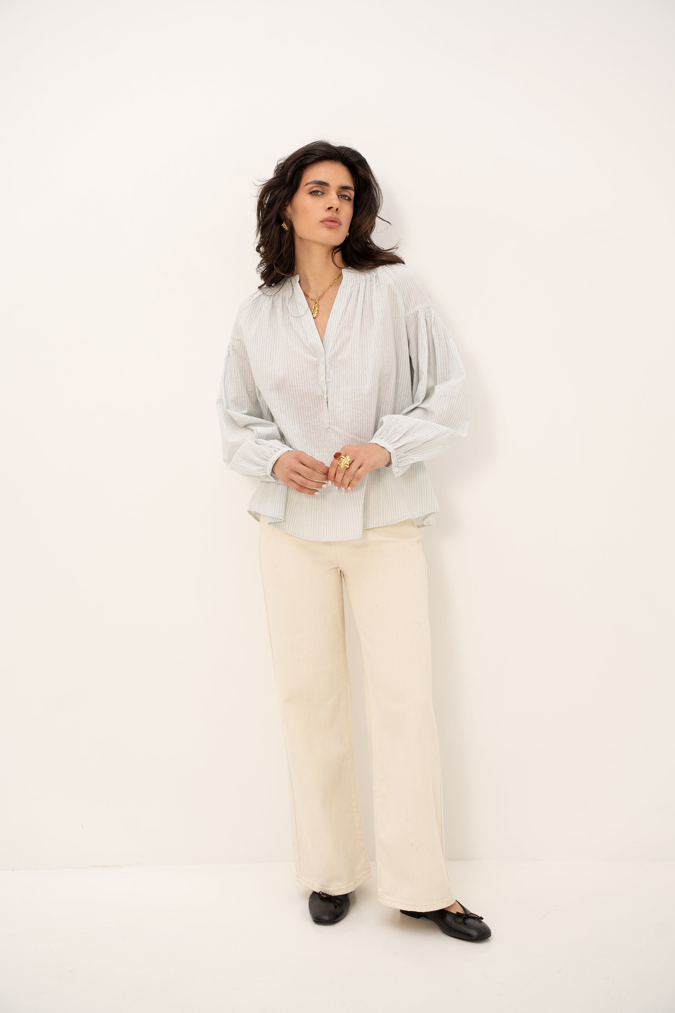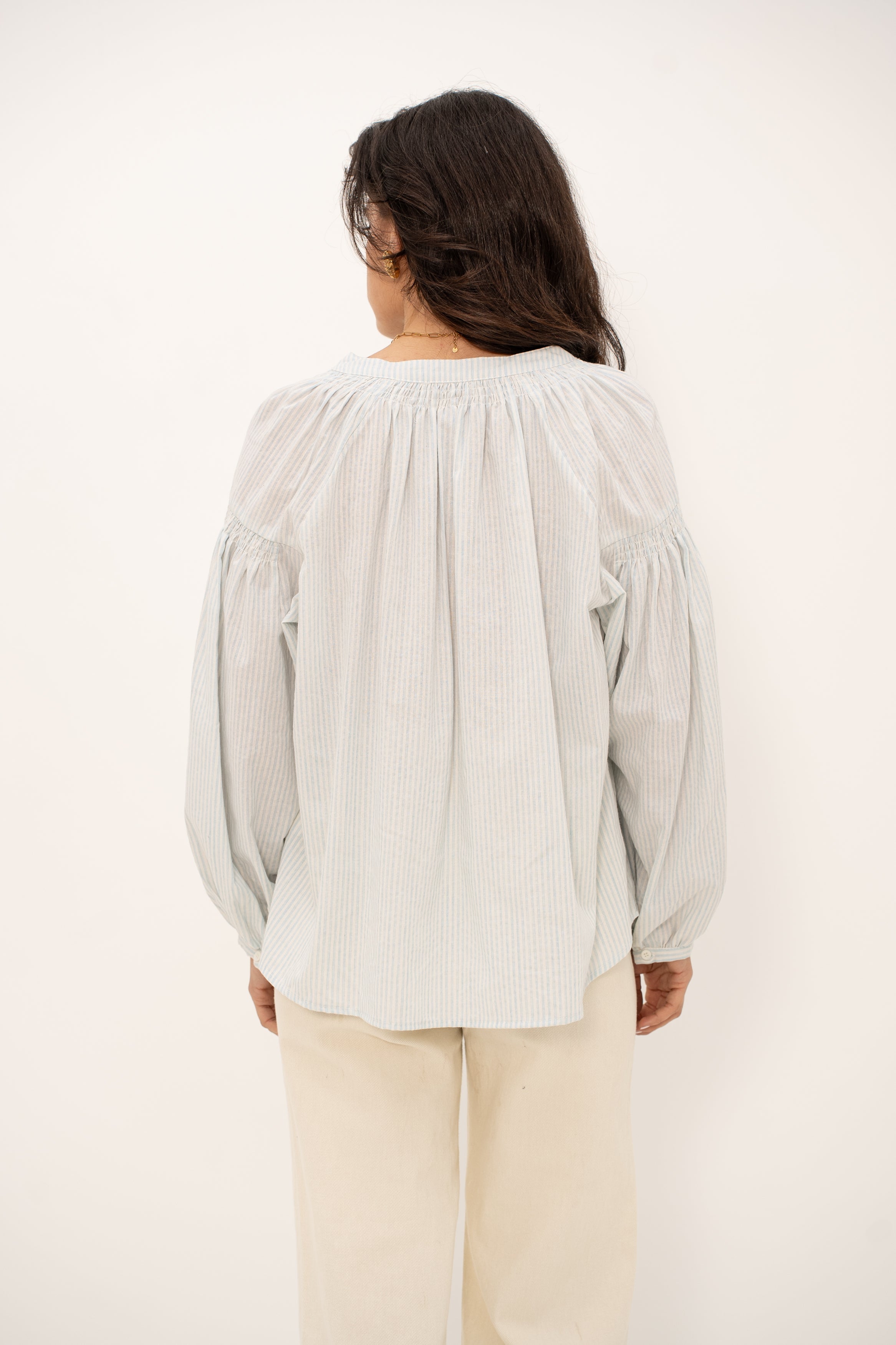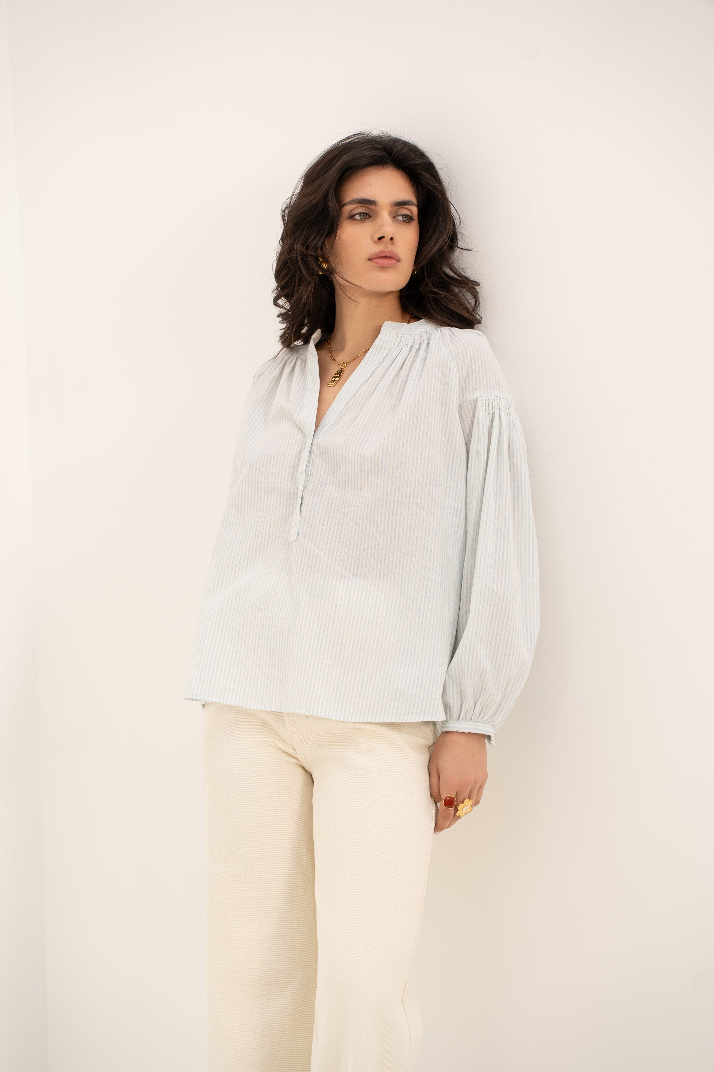 Les manches bouffantes, sa coupe oversize, et les fronces au col et aux poignets ajoutent une touche de romantisme à cette pièce déjà pleine de caractère. Les boutons sur les manches apportent une finition soignée, parfaite pour celles qui aiment allier confort et style.