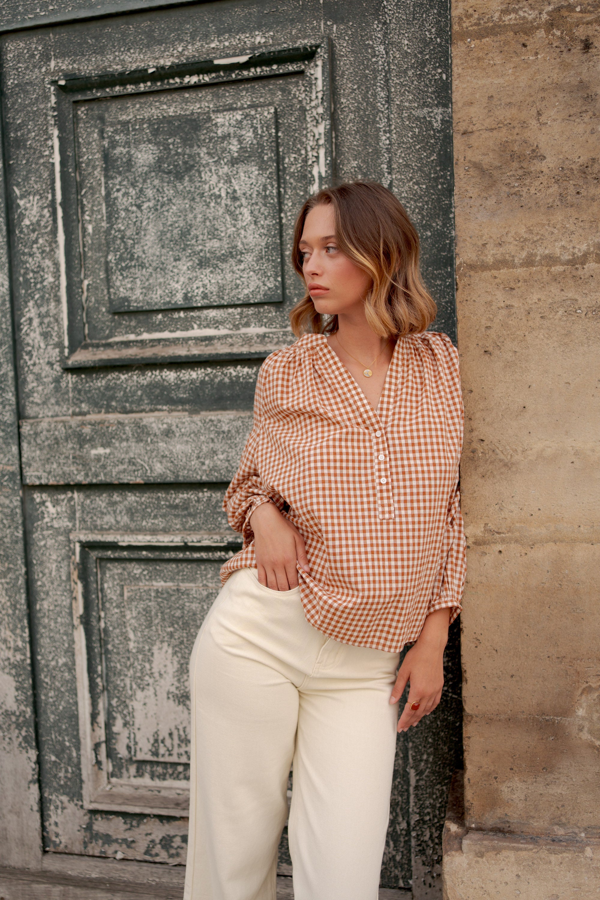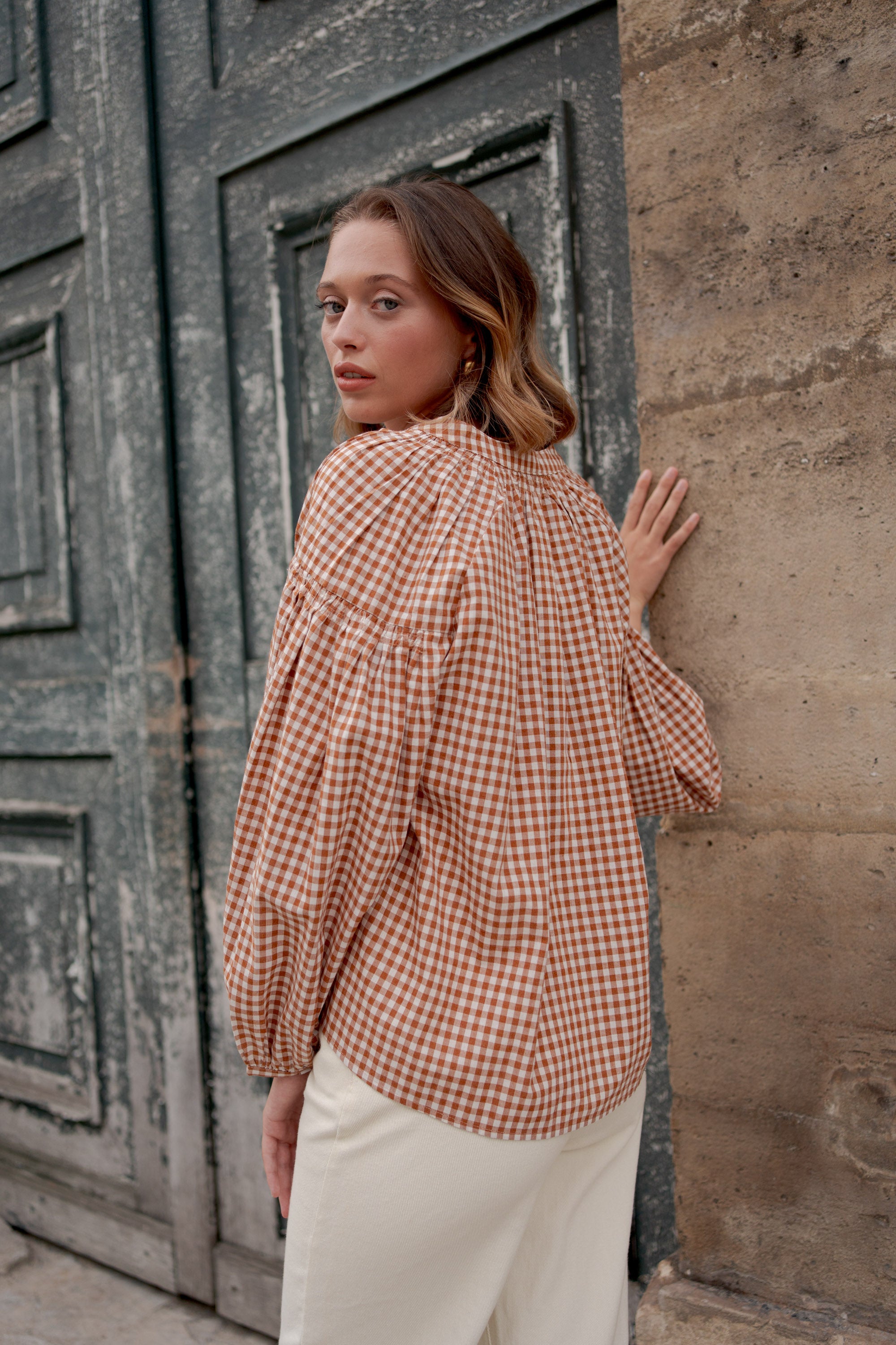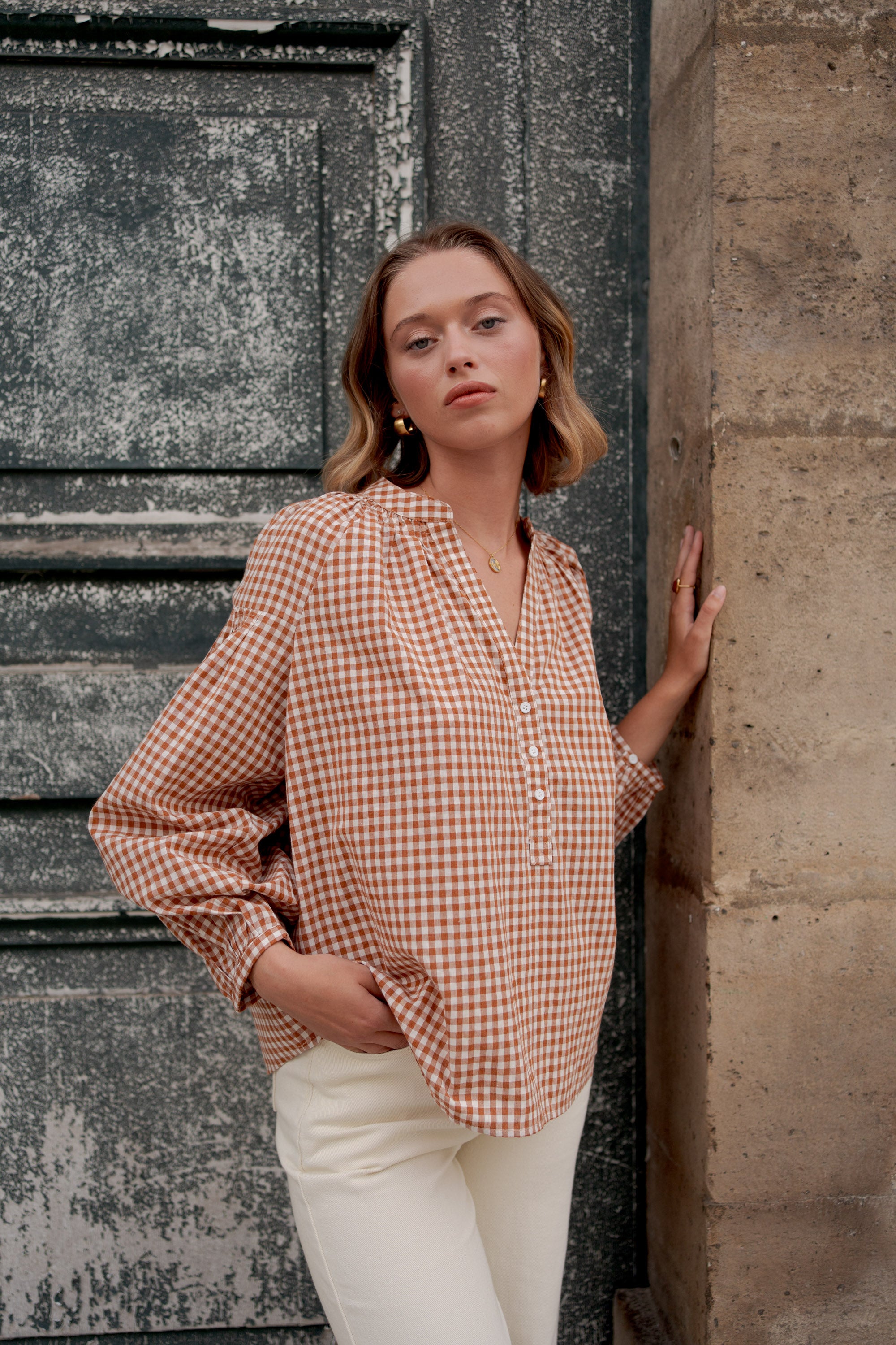 La blouse en coton Camille à carreaux vichy nous charme par son allure à la fois rétro et moderne.