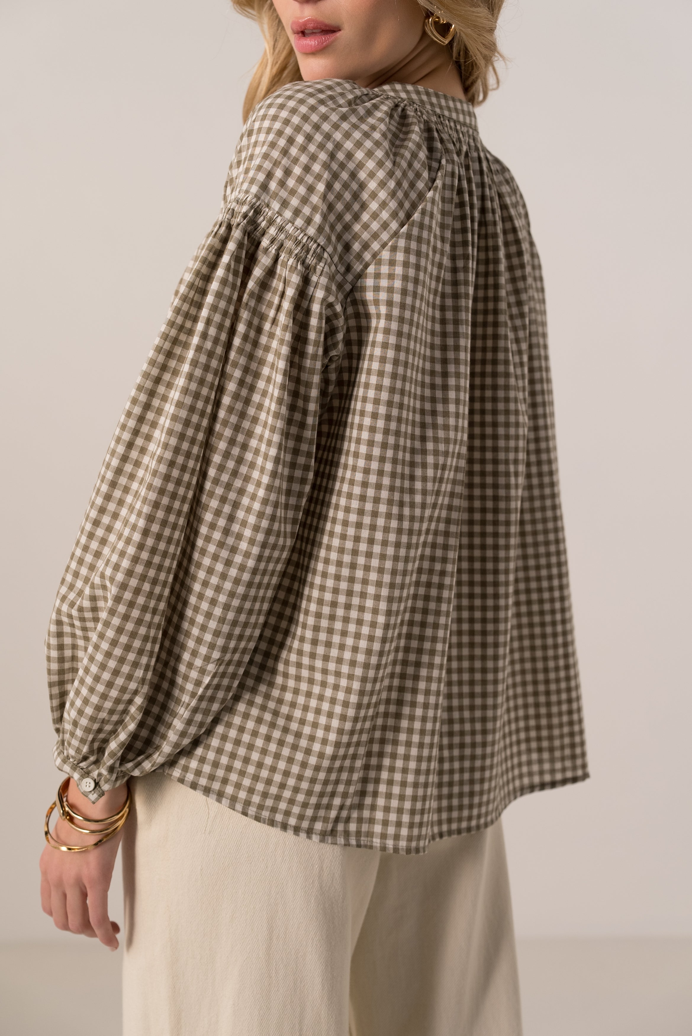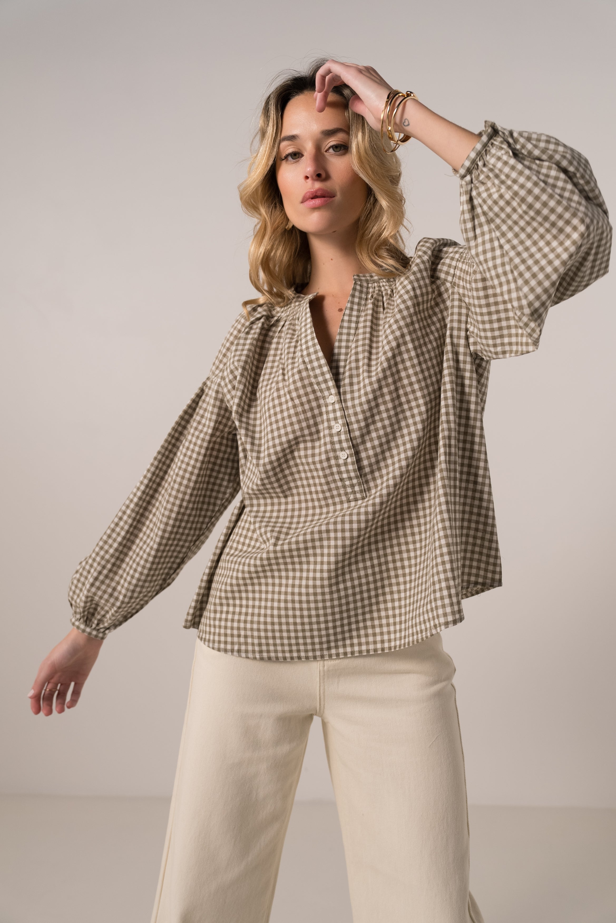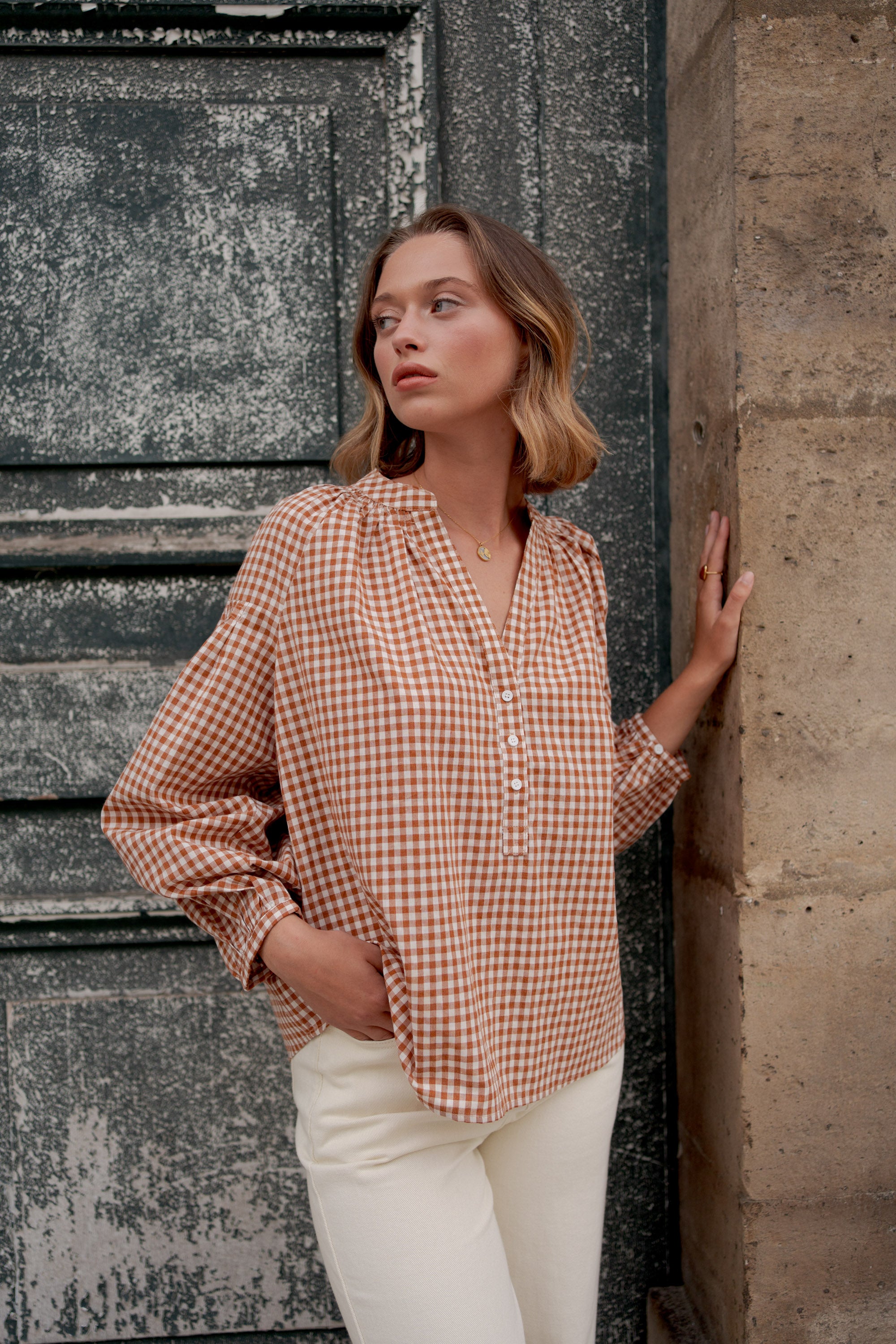 La blouse en coton Camille à carreaux vichy nous charme par son allure à la fois rétro et moderne.