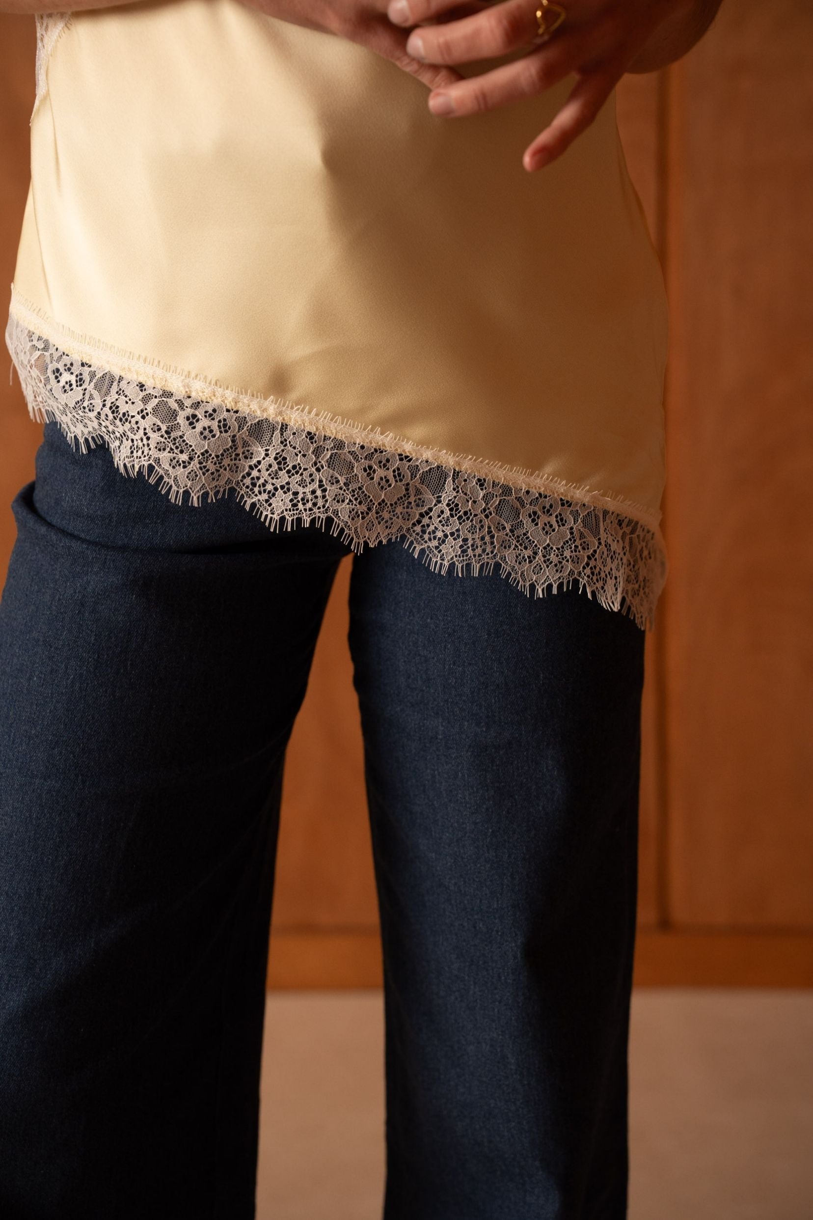 Le top Doria séduit par sa coupe fluide et asymétrique, qui crée un jeu de lignes élégant et moderne. Sa matière satinée capte la lumière avec douceur, tandis que la dentelle fine qui souligne le col et l’ourlet apporte une touche précieuse et féminine.