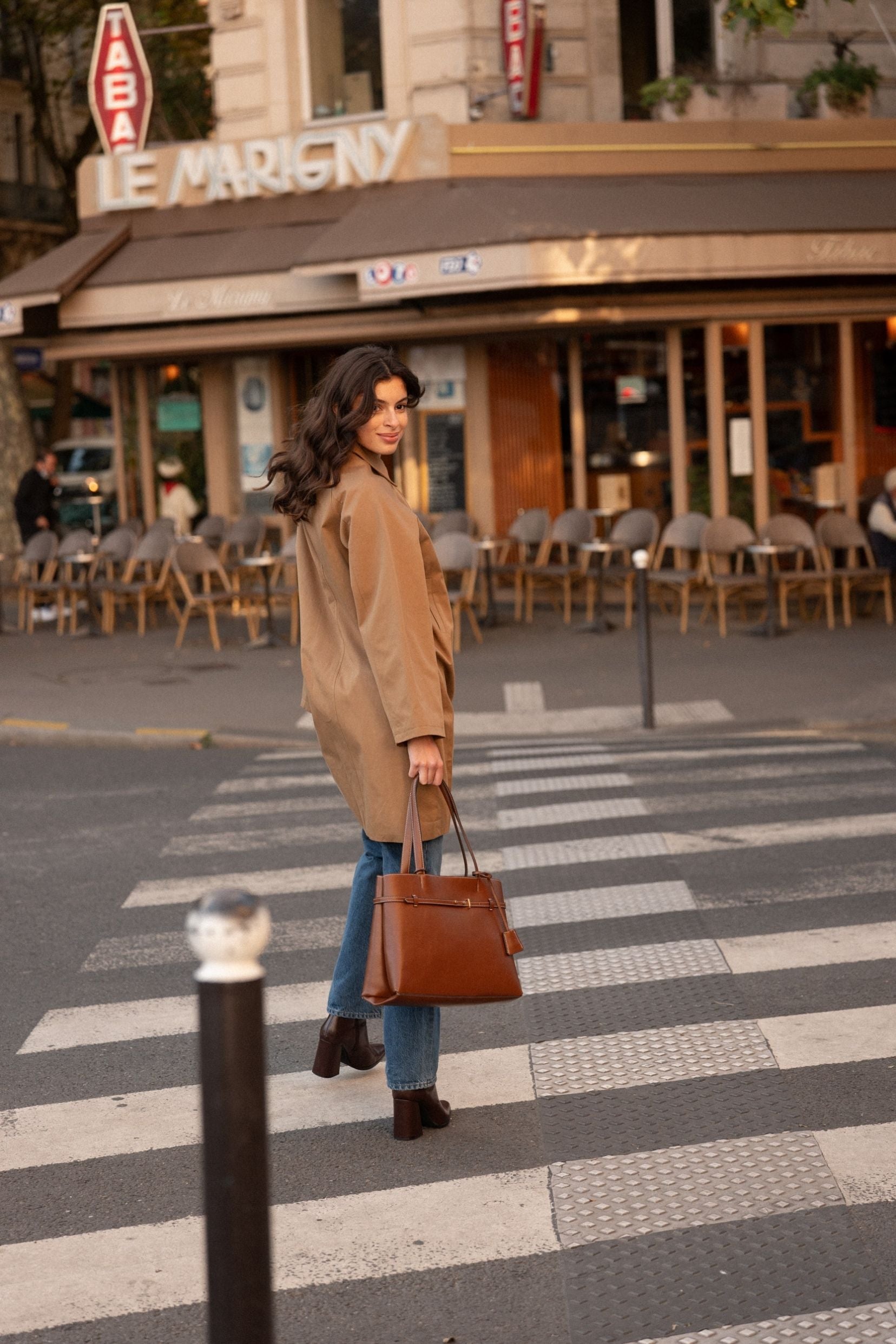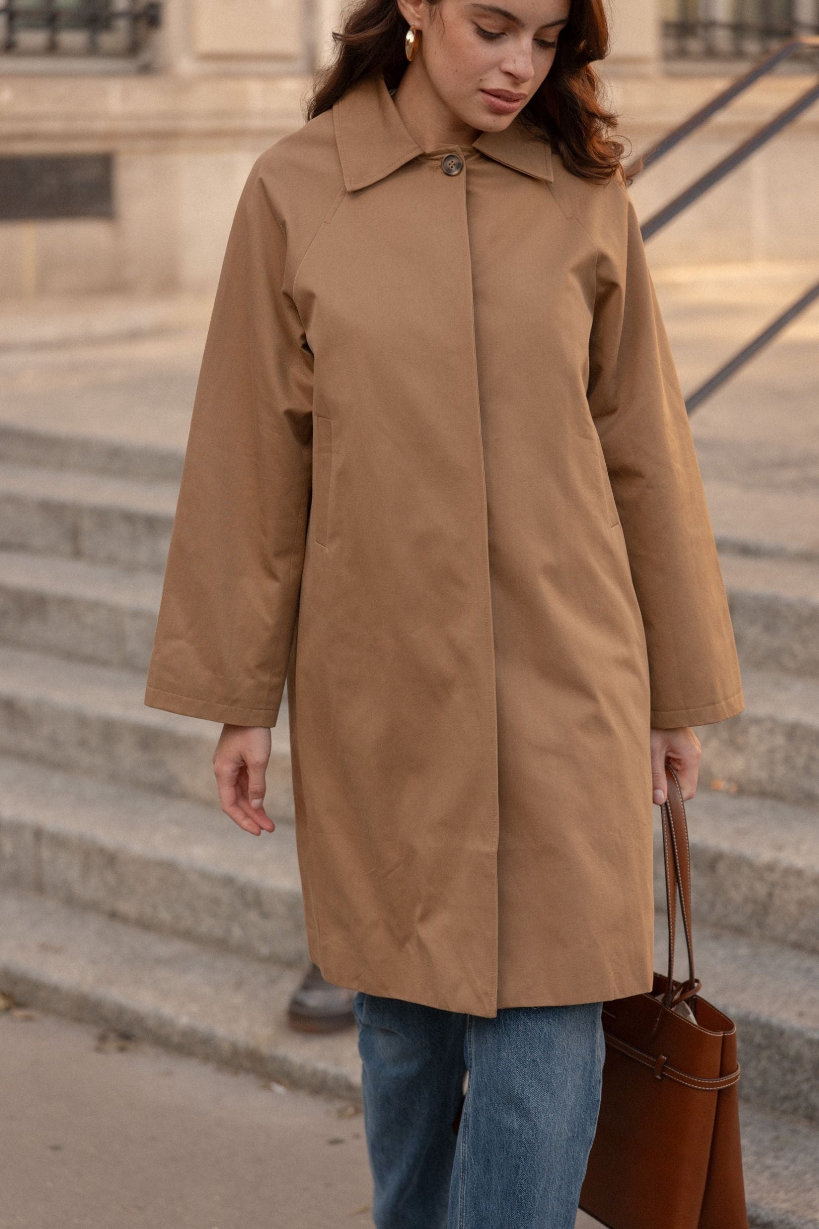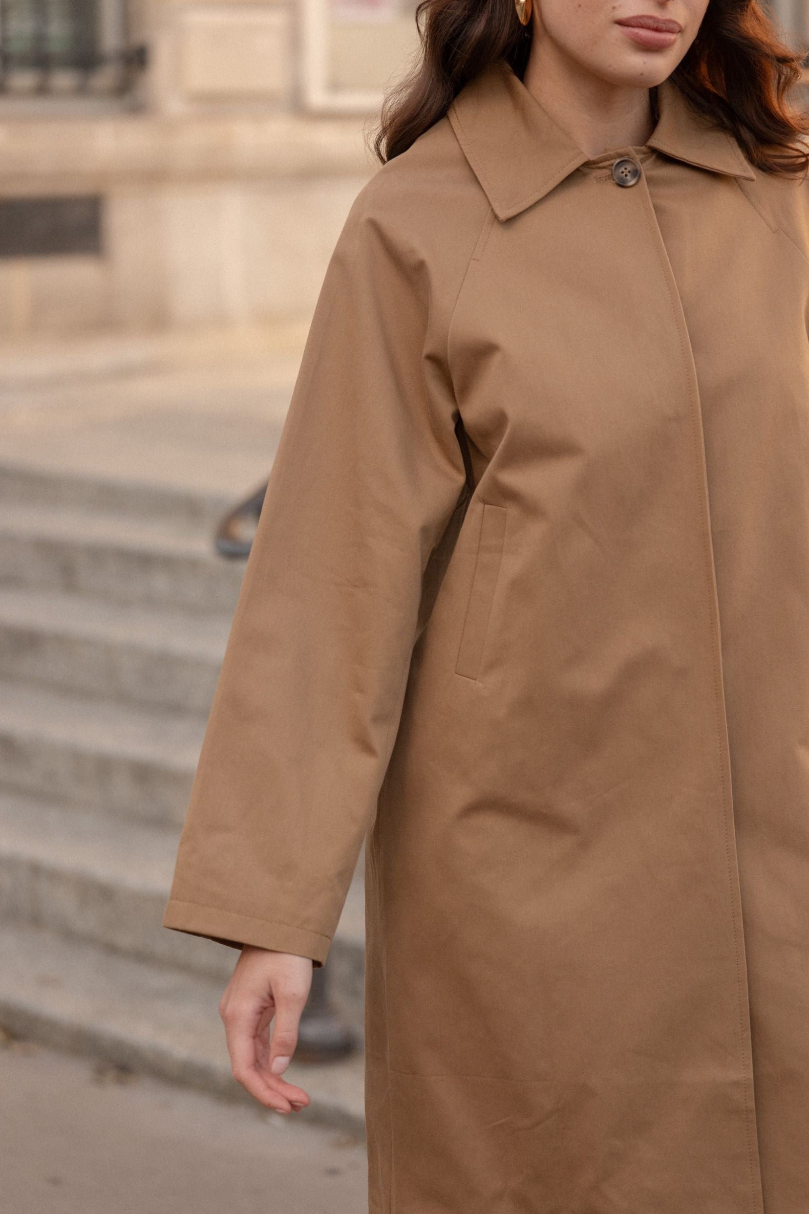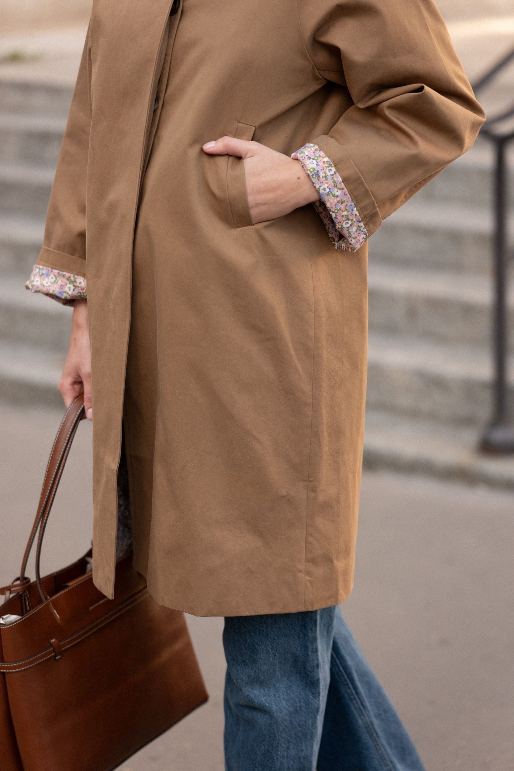 Ce manteau adopte une coupe droite et un col chemise sobre. Son design minimaliste est discrètement relevé par des revers imprimés aux poignets, détail raffiné qui apporte une note singulière. Une pièce intemporelle, pensée pour accompagner chaque saison.
