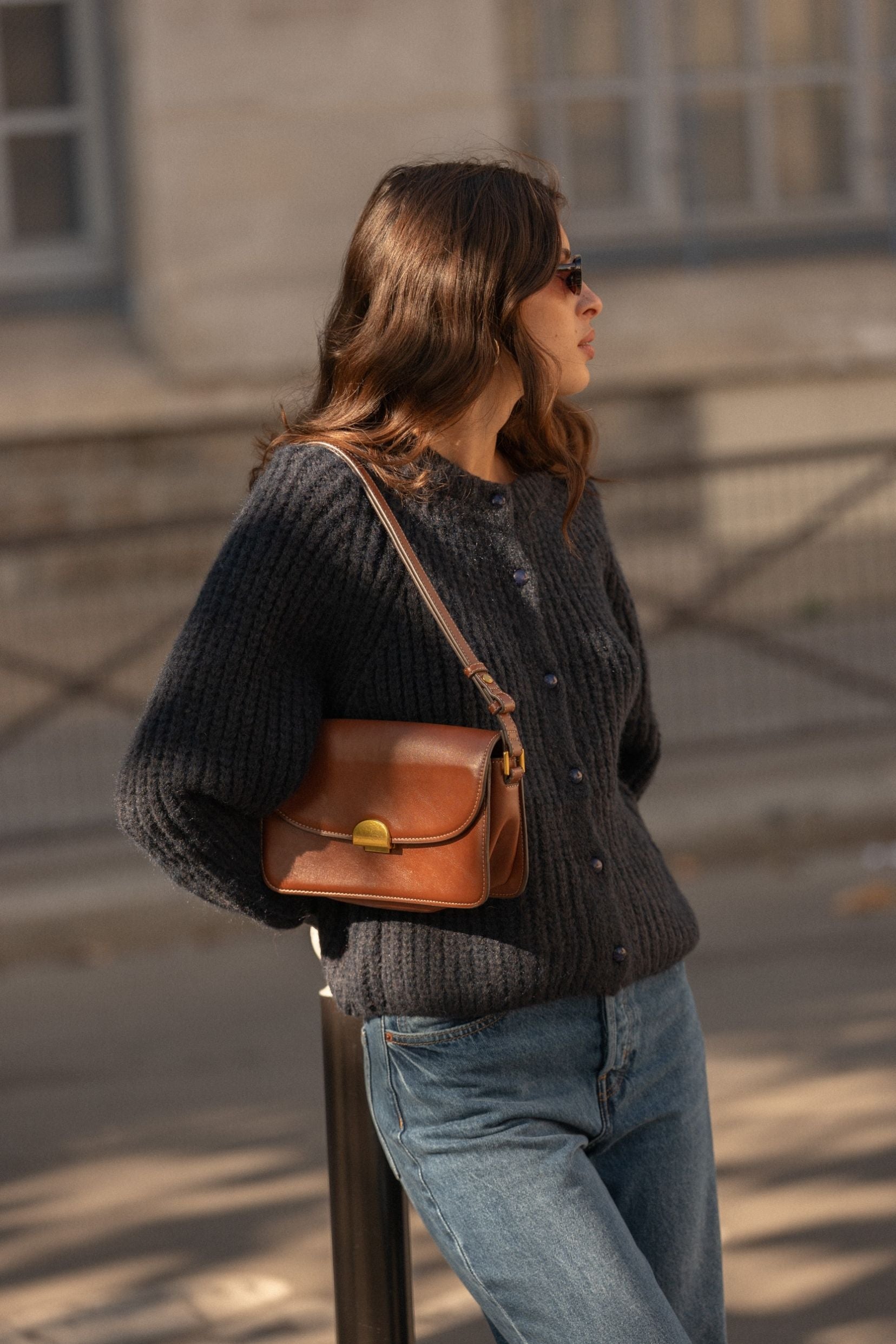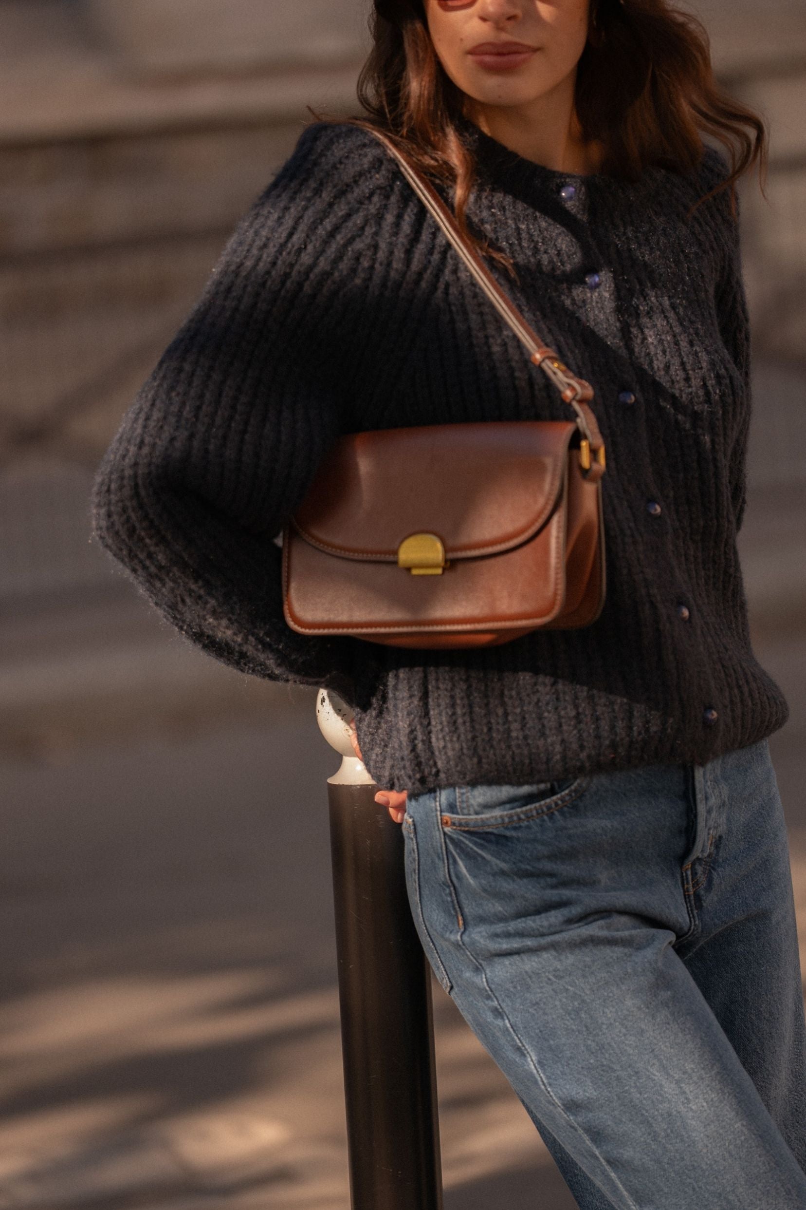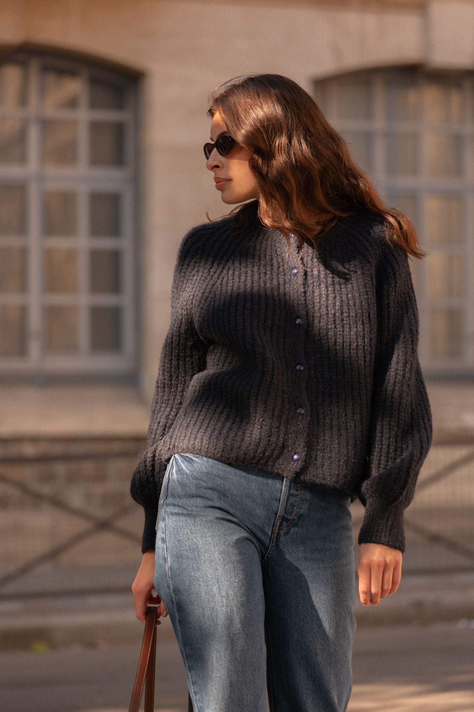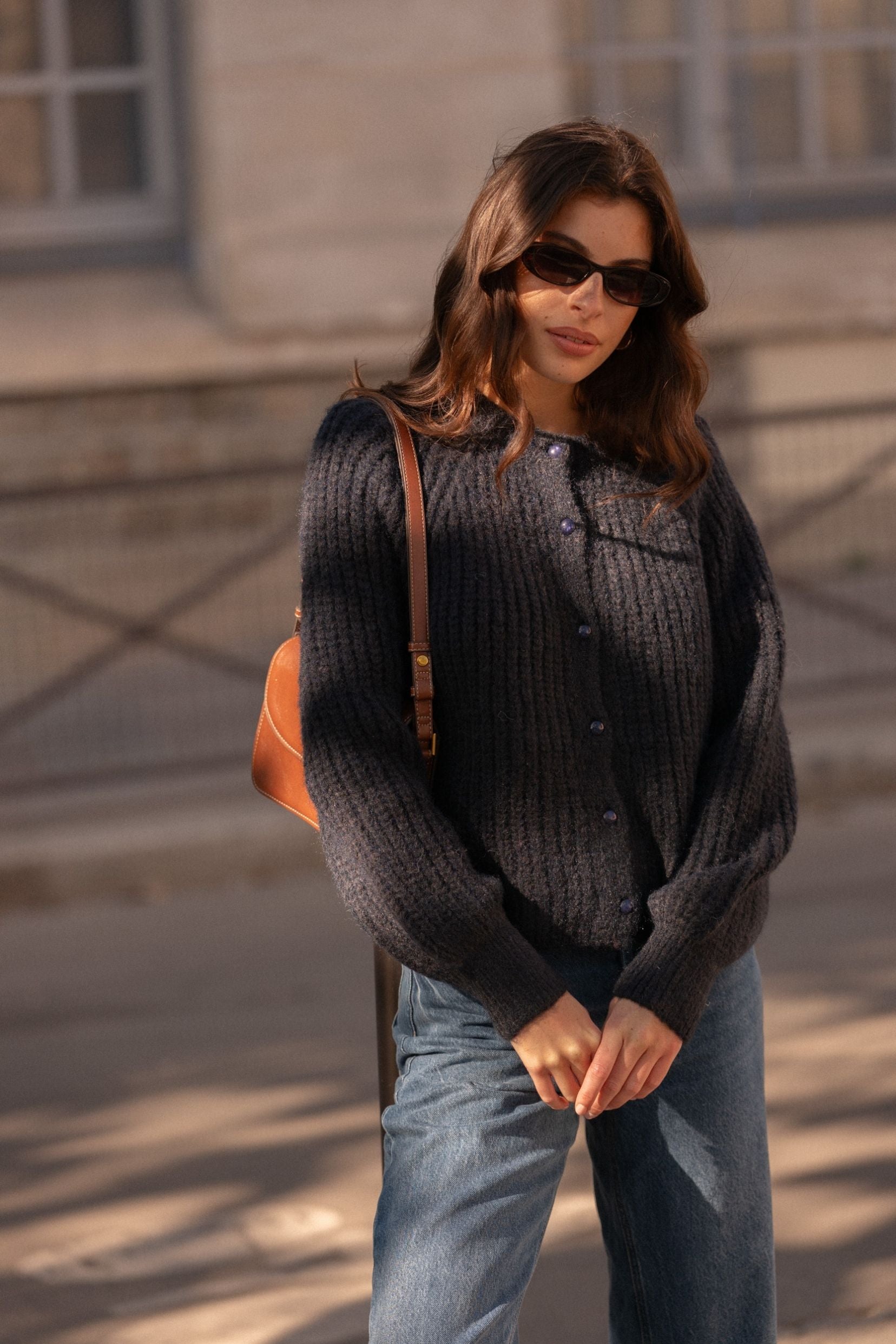 Ce cardigan à col rond se distingue par sa maille épaisse et ses manches légèrement ballon. Fermé par une rangée de boutons ton sur ton, il conjugue confort et allure dans une version sobre et intemporelle.