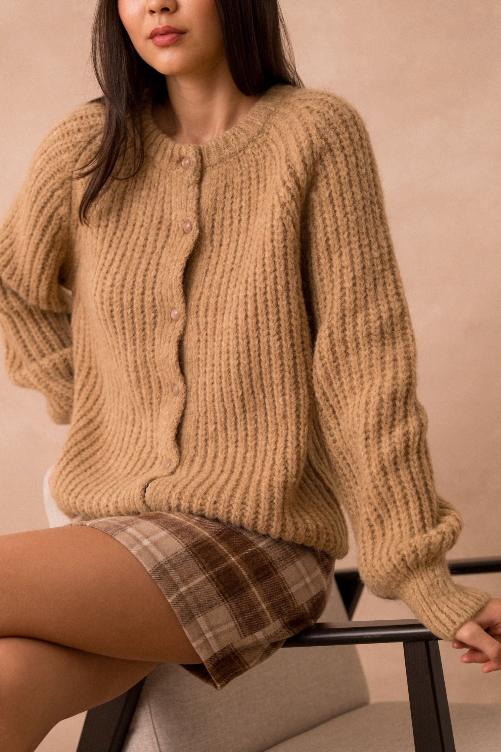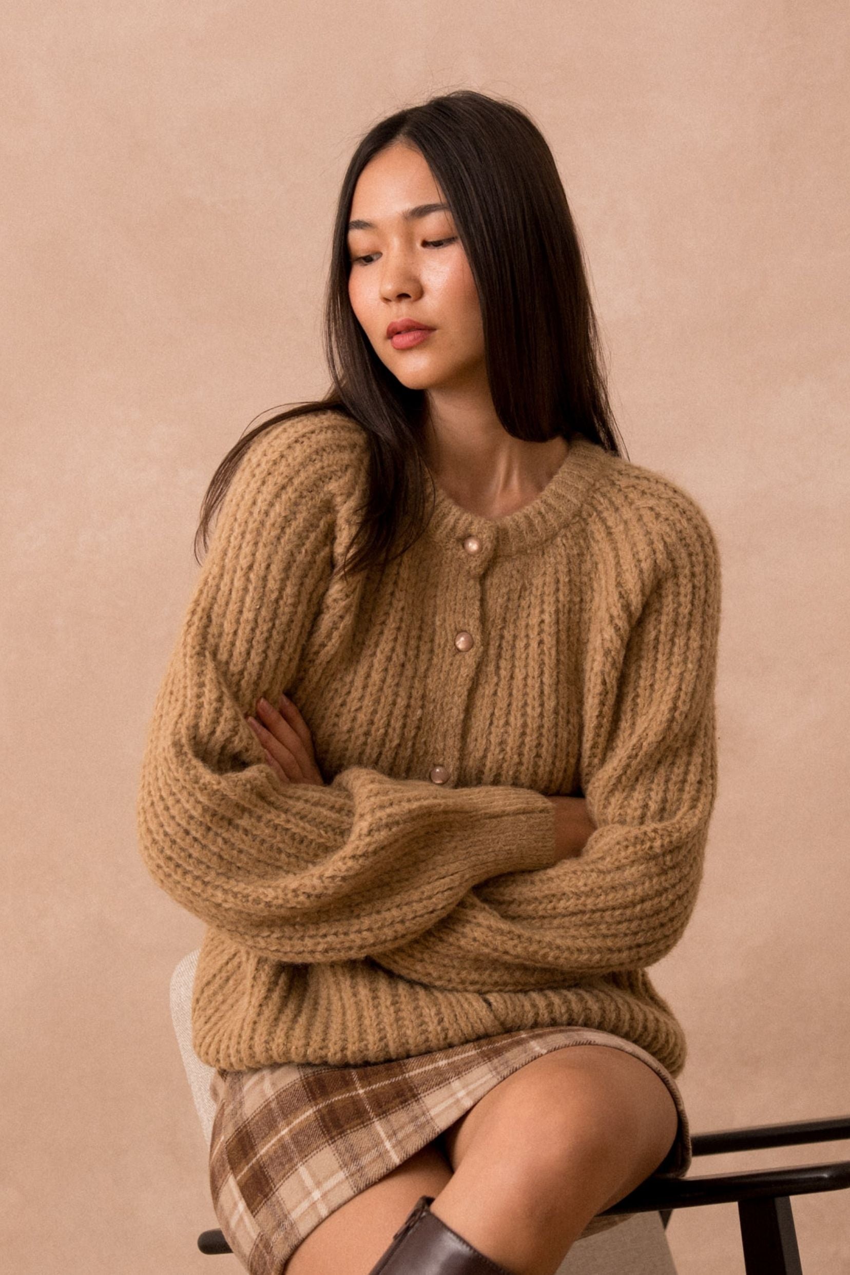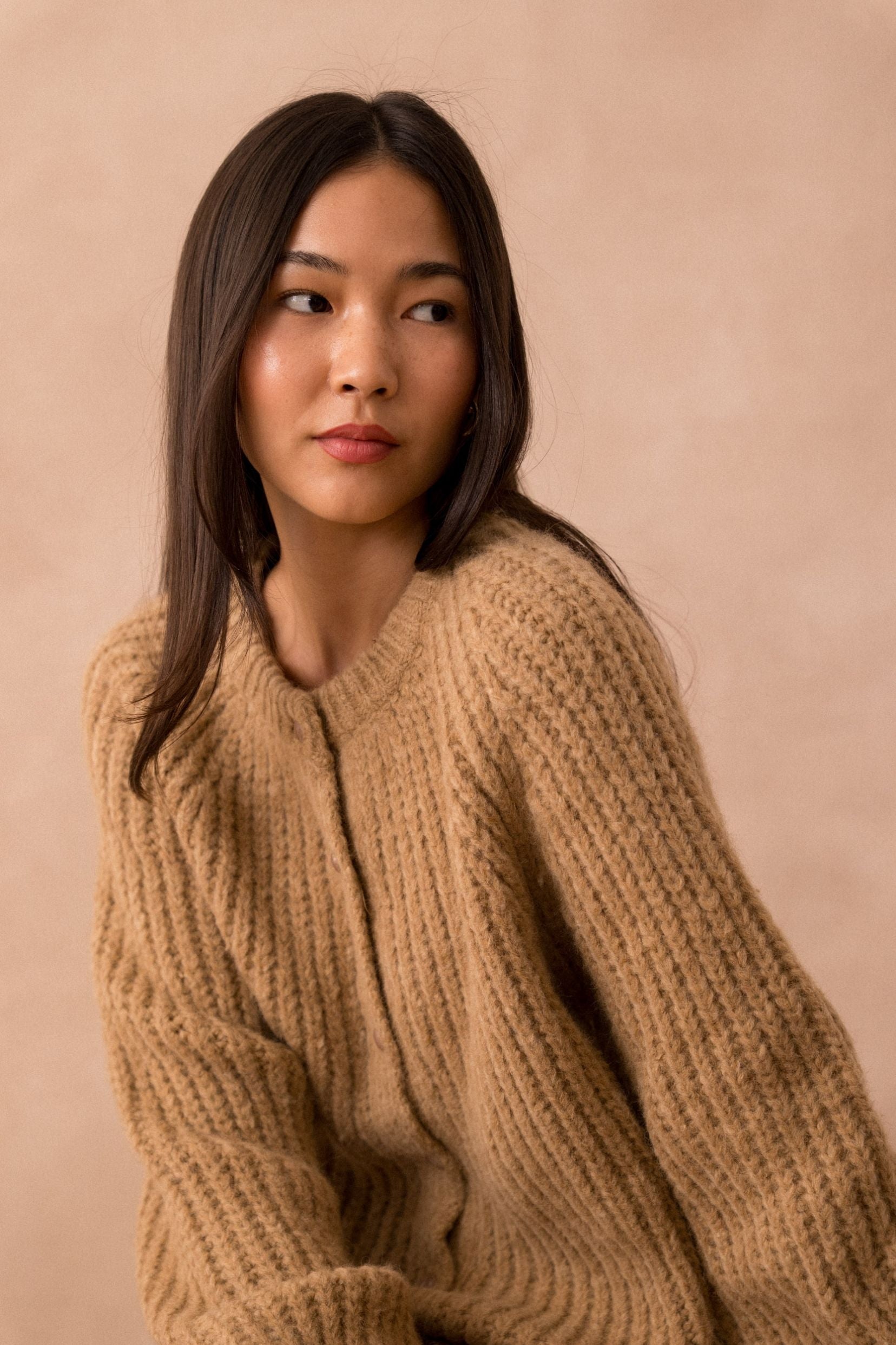 Ce cardigan à col rond se distingue par sa maille épaisse et ses manches légèrement ballon. Fermé par une rangée de boutons ton sur ton, il conjugue confort et allure dans une version sobre et intemporelle.