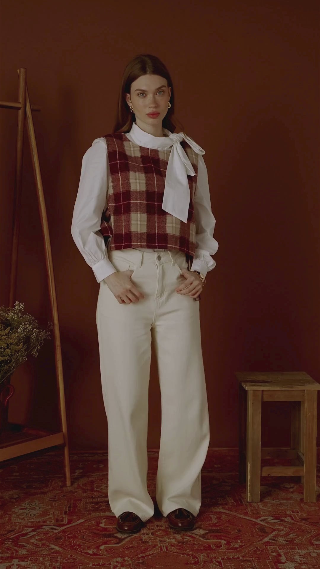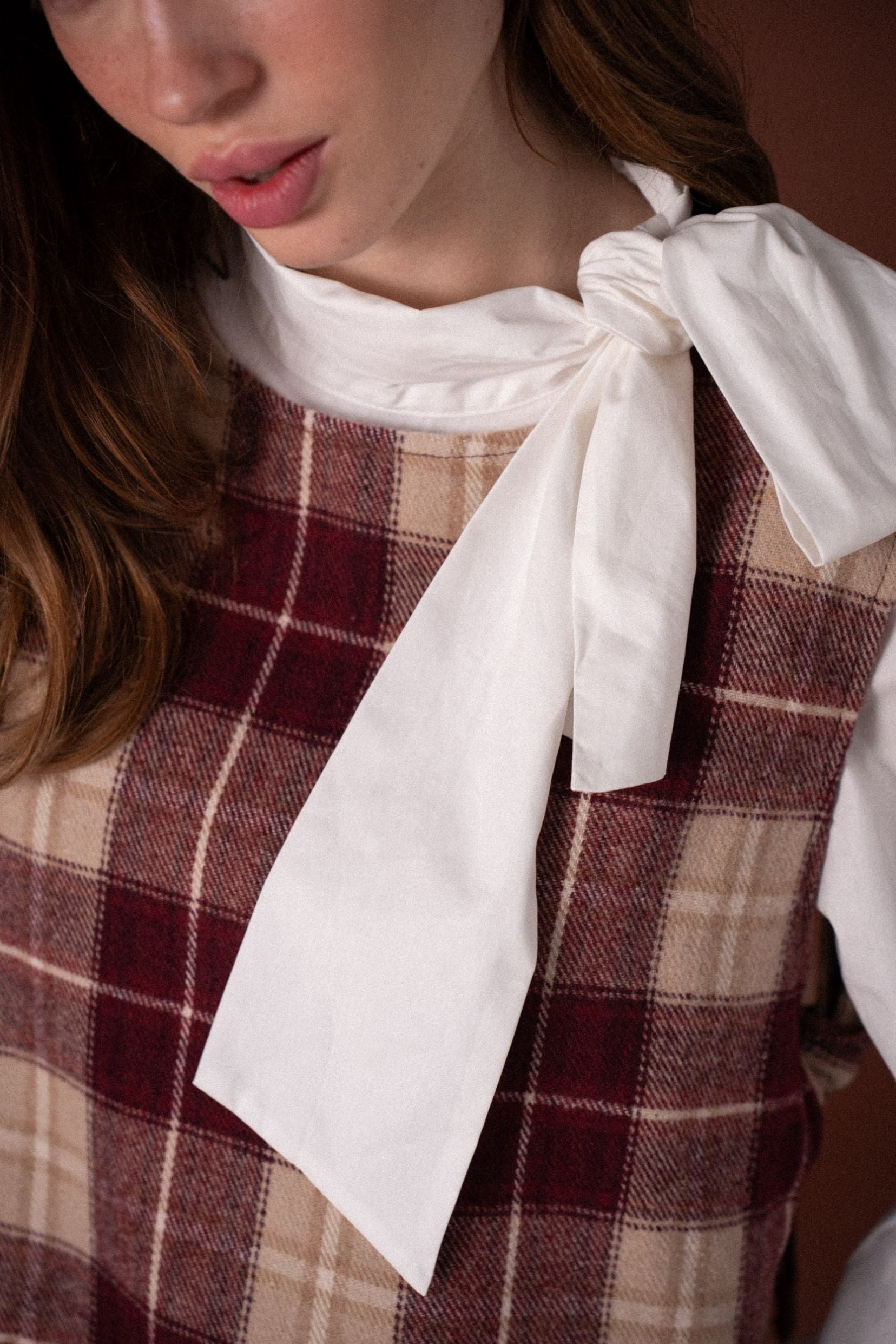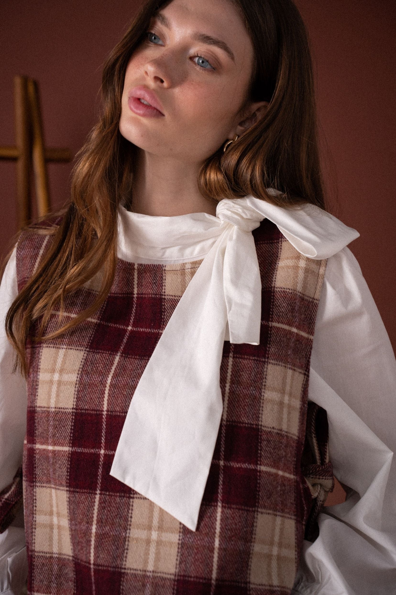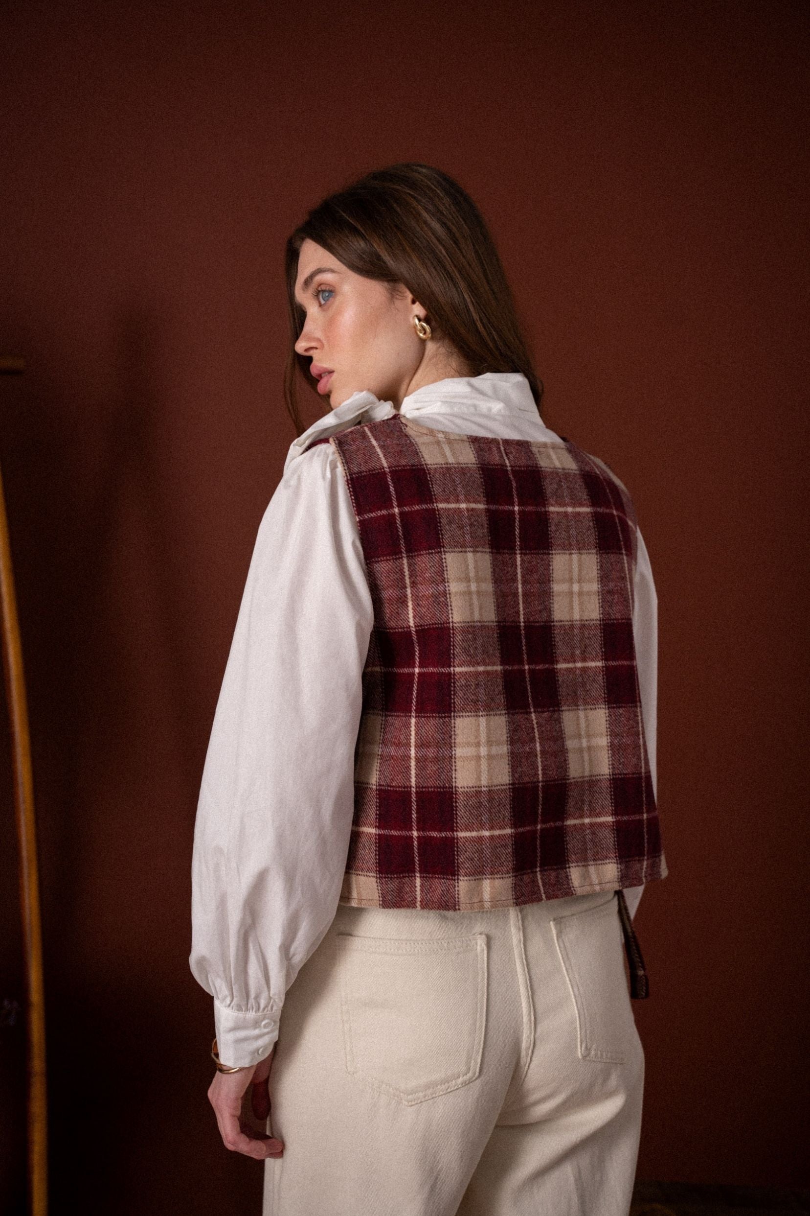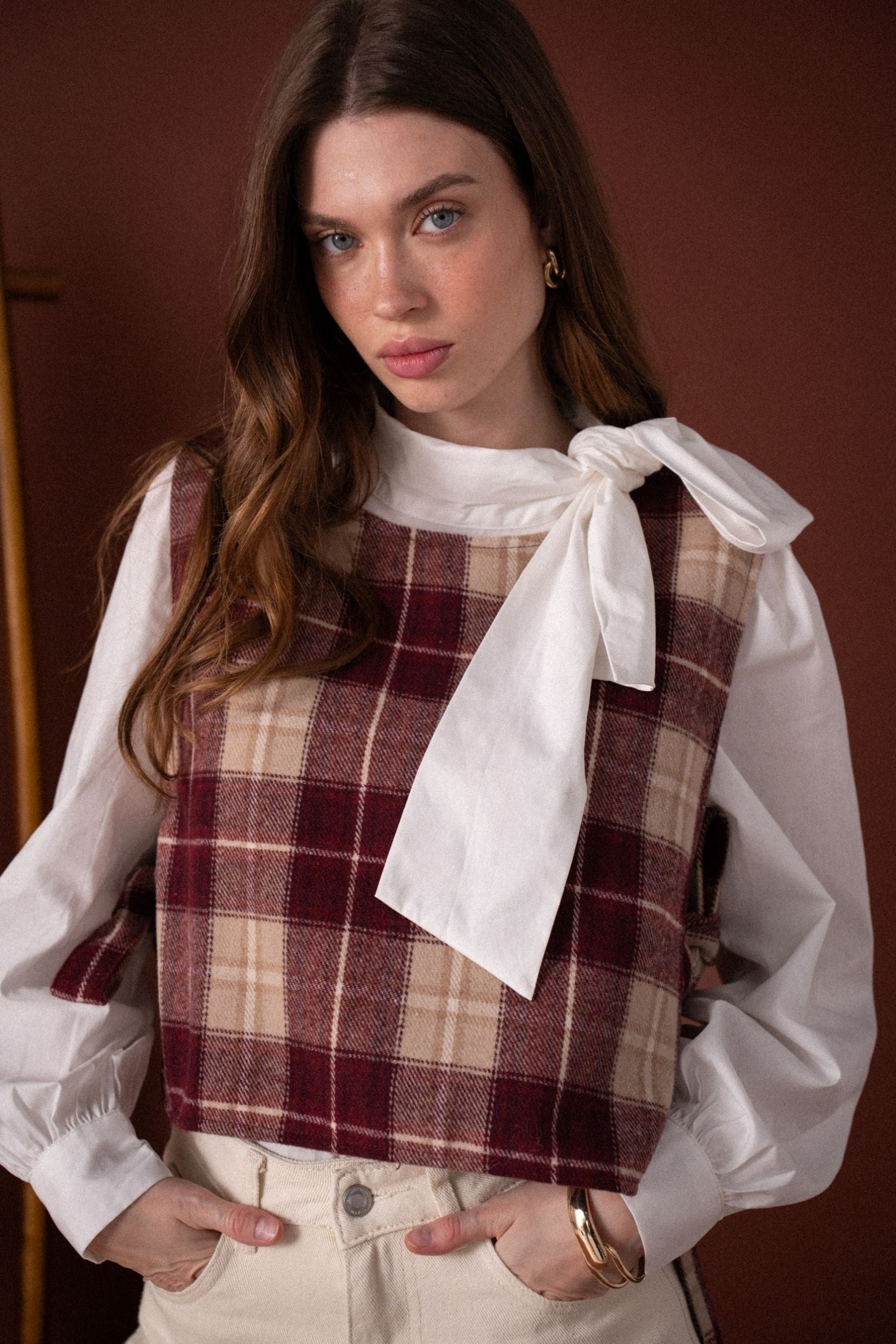 Ses carreaux bordeaux et beige rappellent les silhouettes rétro d’automne, tandis que sa coupe courte et structurée apporte une touche contemporaine. Ouvert sur les côtés et noué par de petits liens, il se superpose parfaitement sur une chemise ou une blouse à col lavallière.