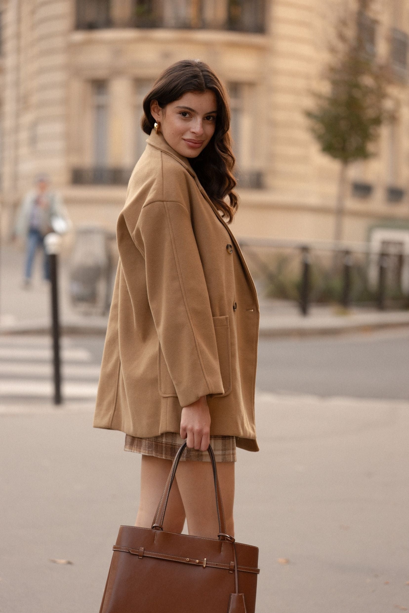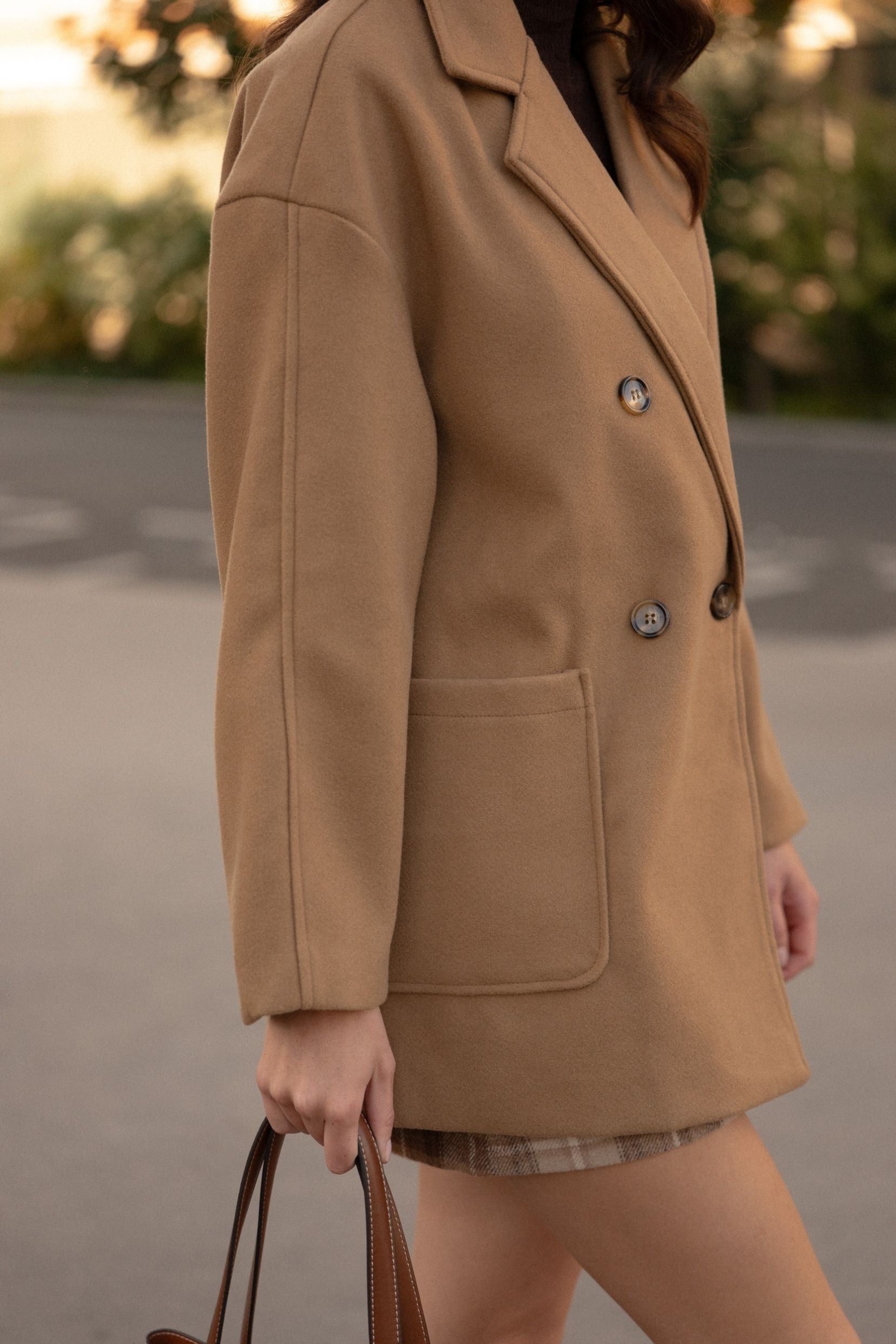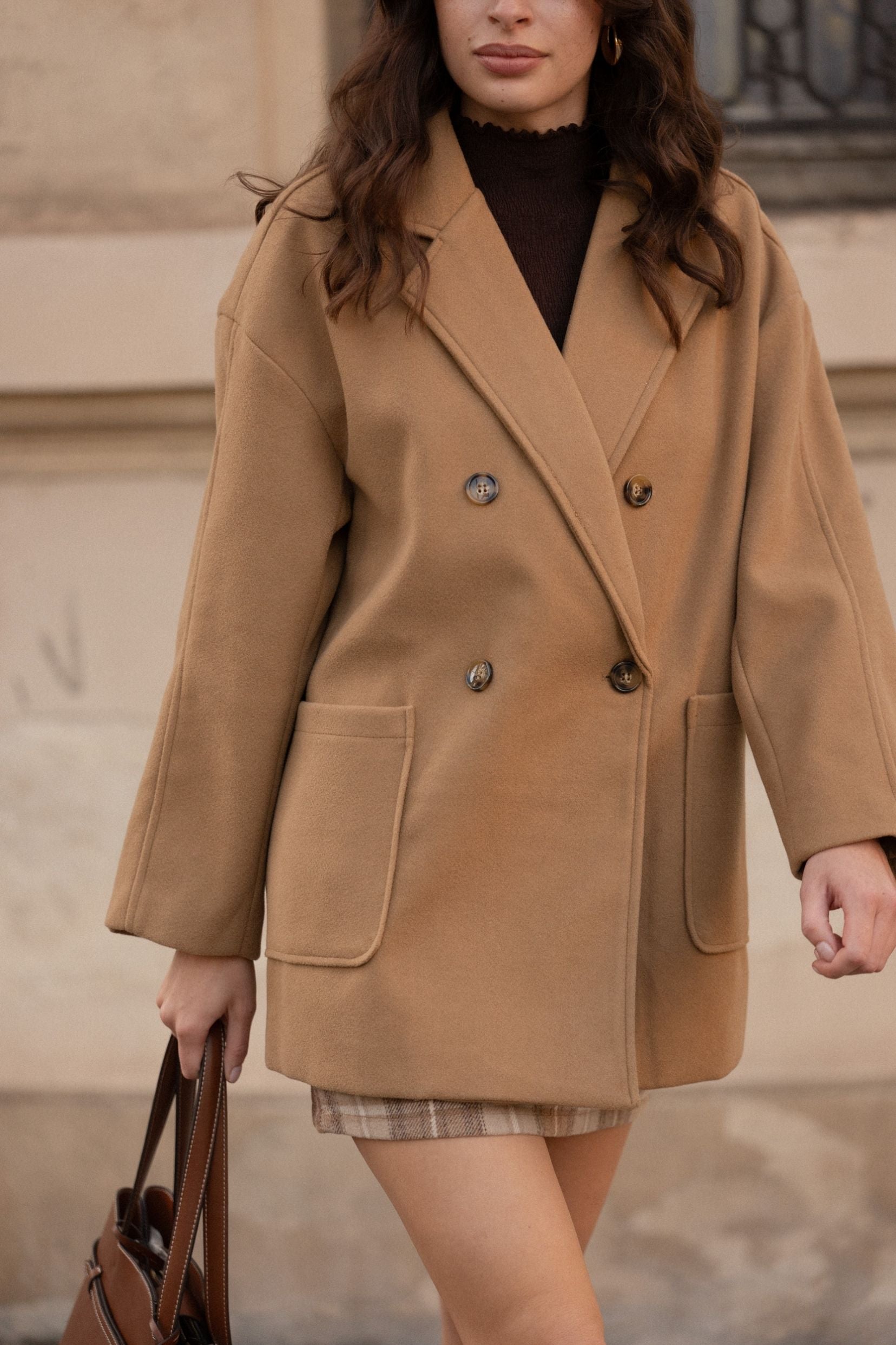 Ce manteau à double boutonnage séduit par sa coupe droite et son col tailleur. Ses poches plaquées soulignent une allure décontractée mais sophistiquée, faisant de cette pièce un essentiel du vestiaire citadin.