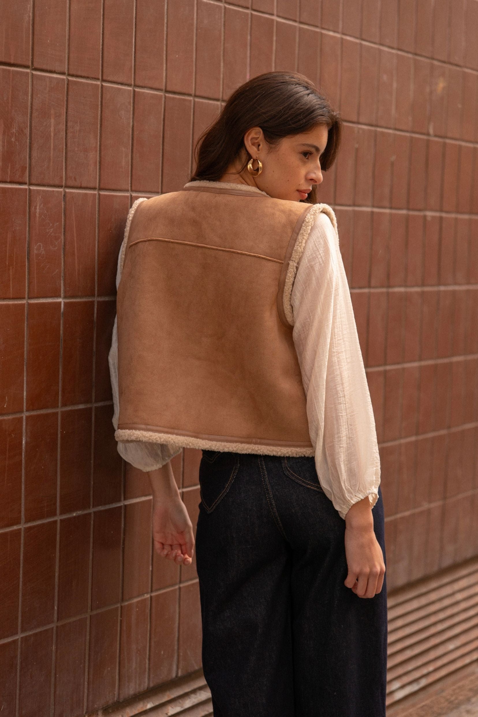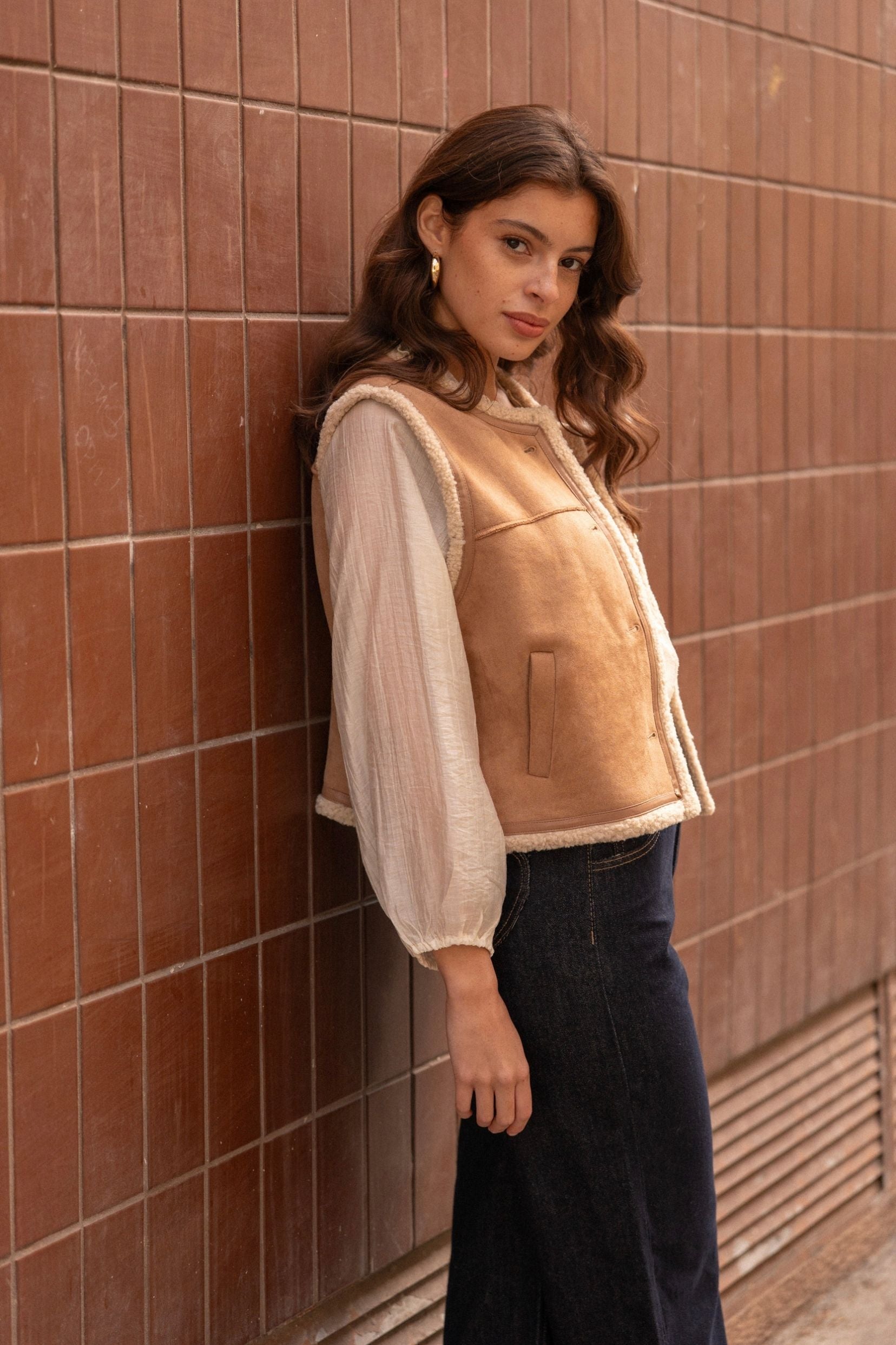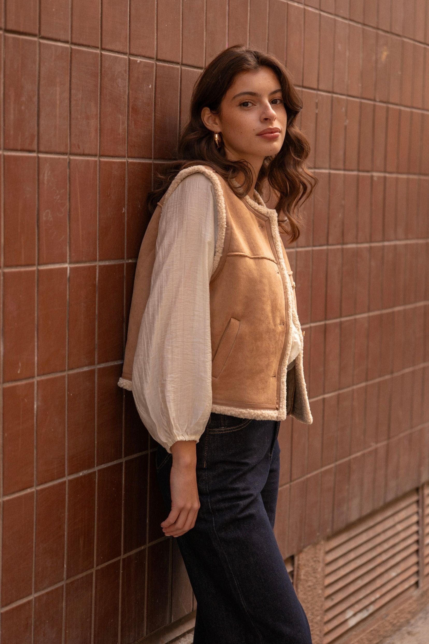 Ce gilet sans manches se distingue par sa matière effet peau retournée et son intérieur doublé sherpa, qui apportent chaleur et douceur. Sa coupe droite et son encolure ronde épurée soulignent une allure casual et intemporelle. Une pièce à la fois pratique et réconfortante.