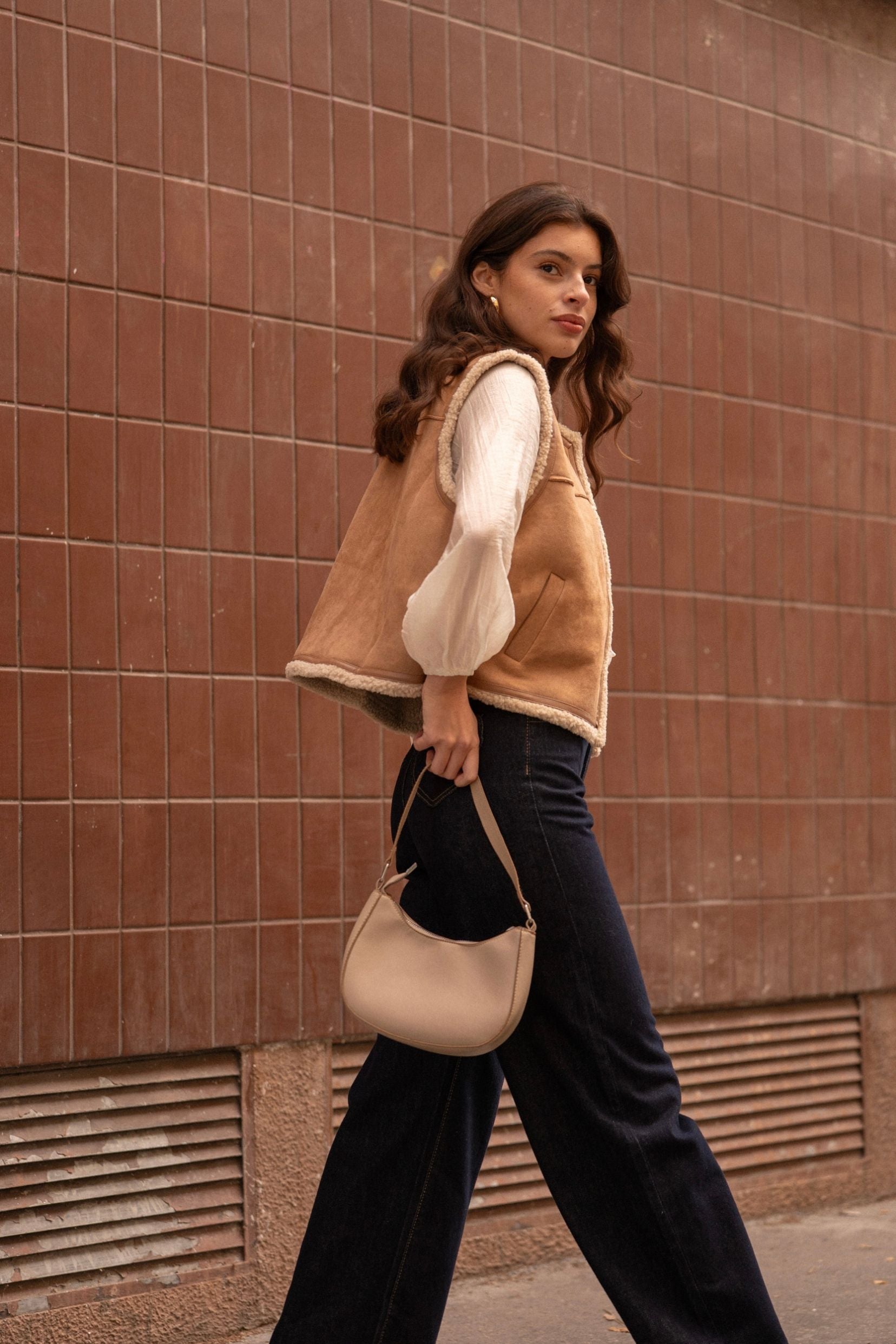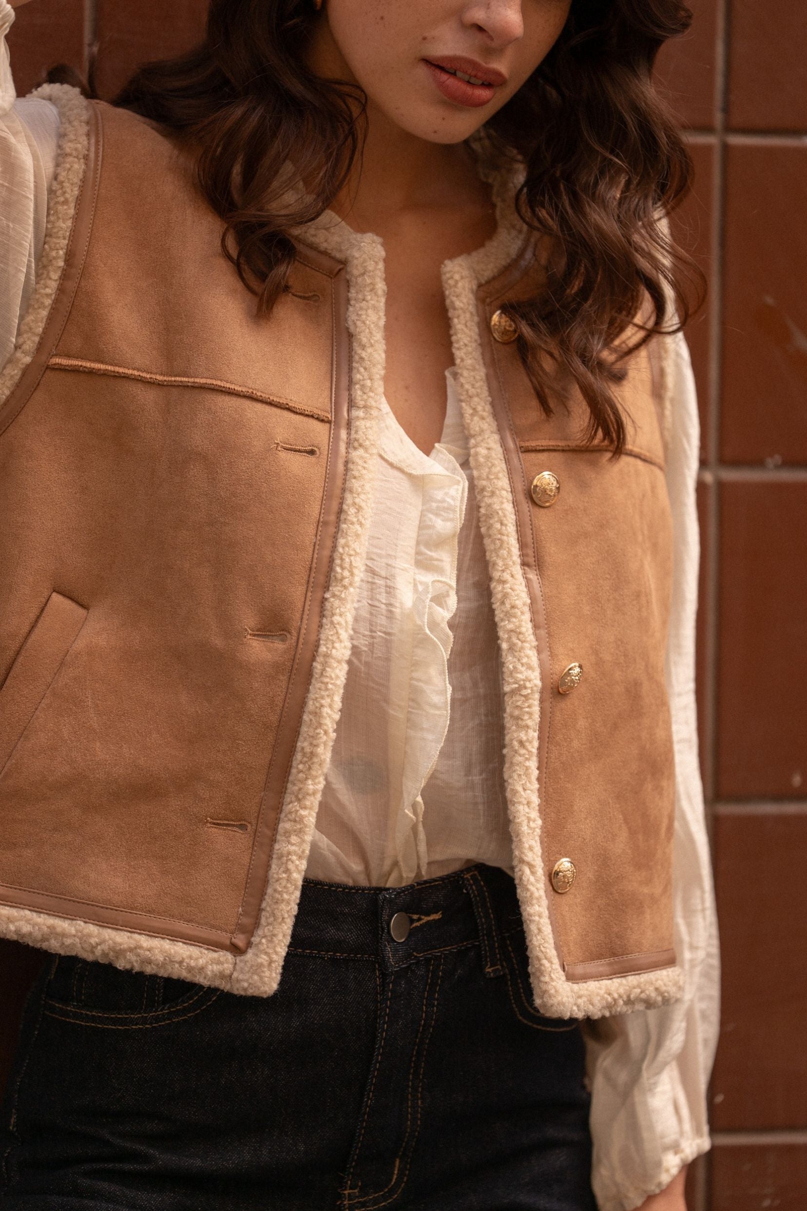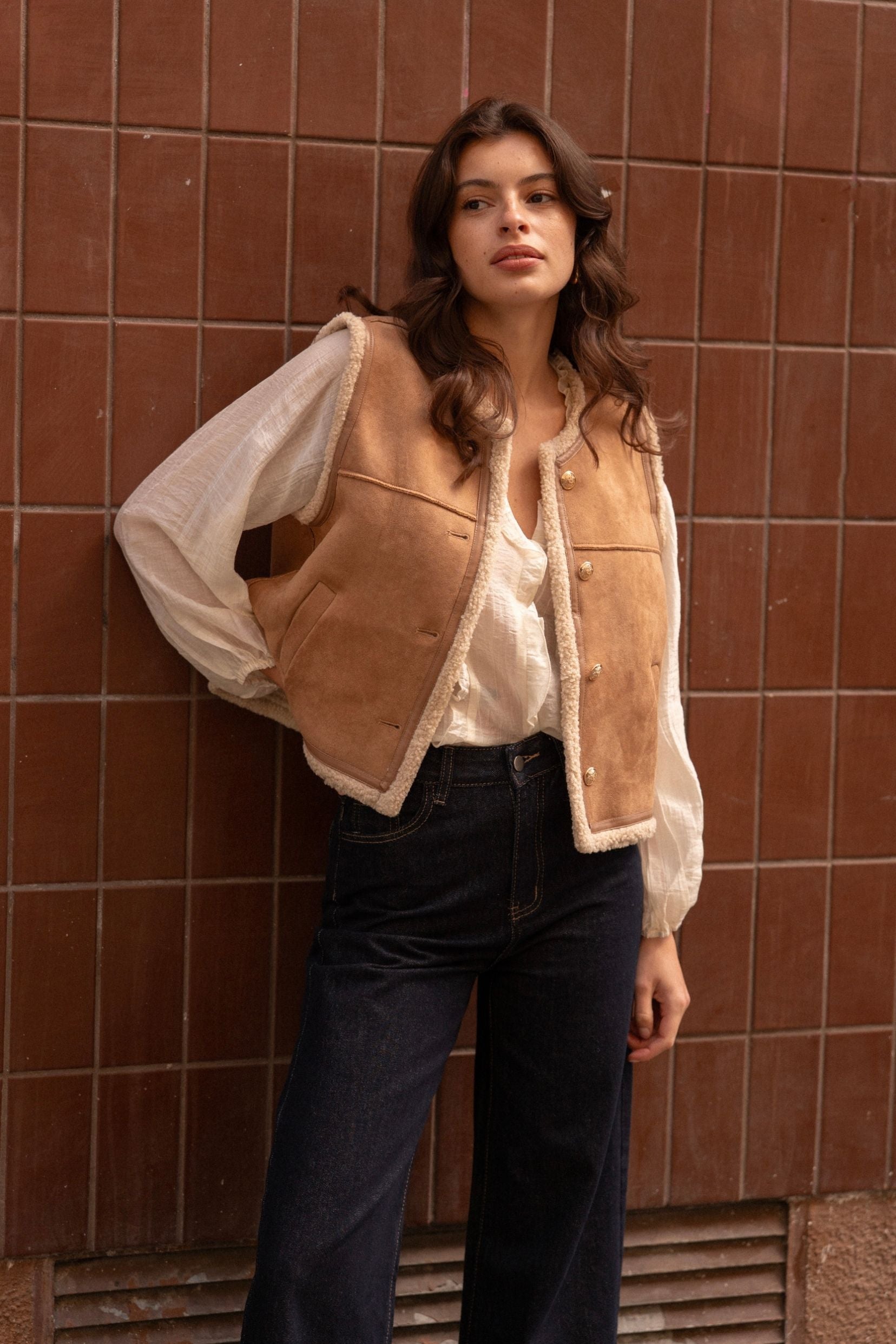 Ce gilet sans manches se distingue par sa matière effet peau retournée et son intérieur doublé sherpa, qui apportent chaleur et douceur. Sa coupe droite et son encolure ronde épurée soulignent une allure casual et intemporelle. Une pièce à la fois pratique et réconfortante.