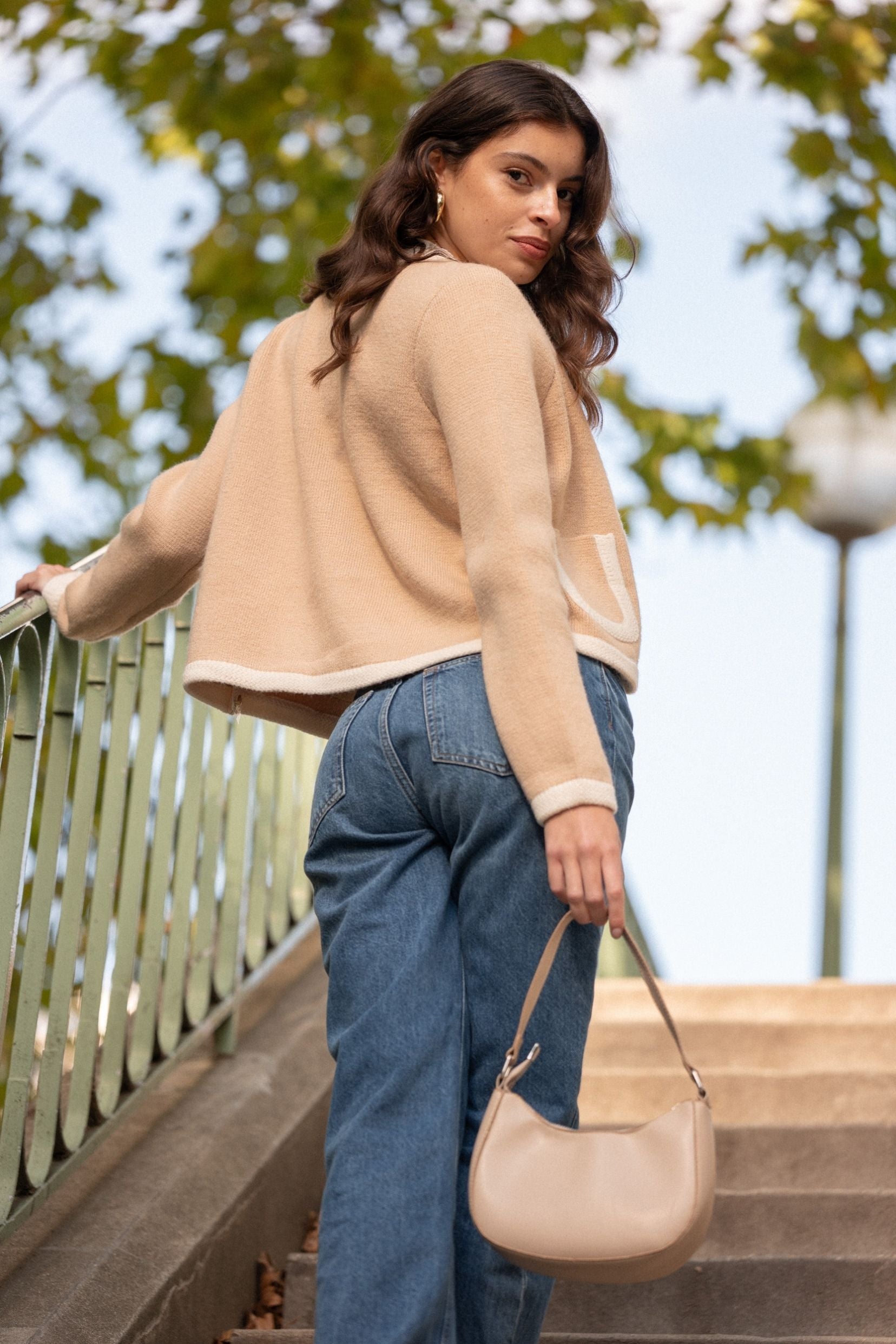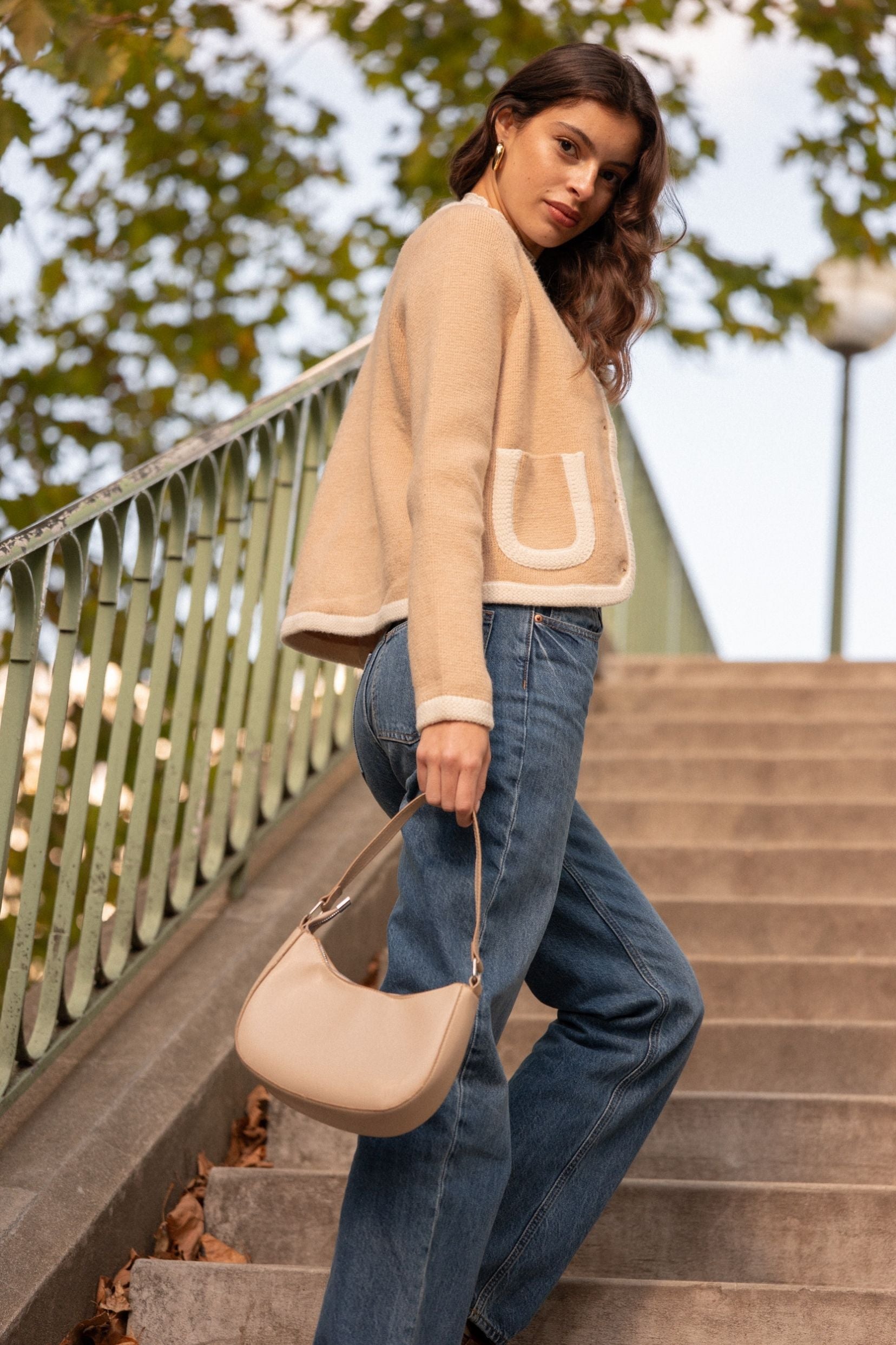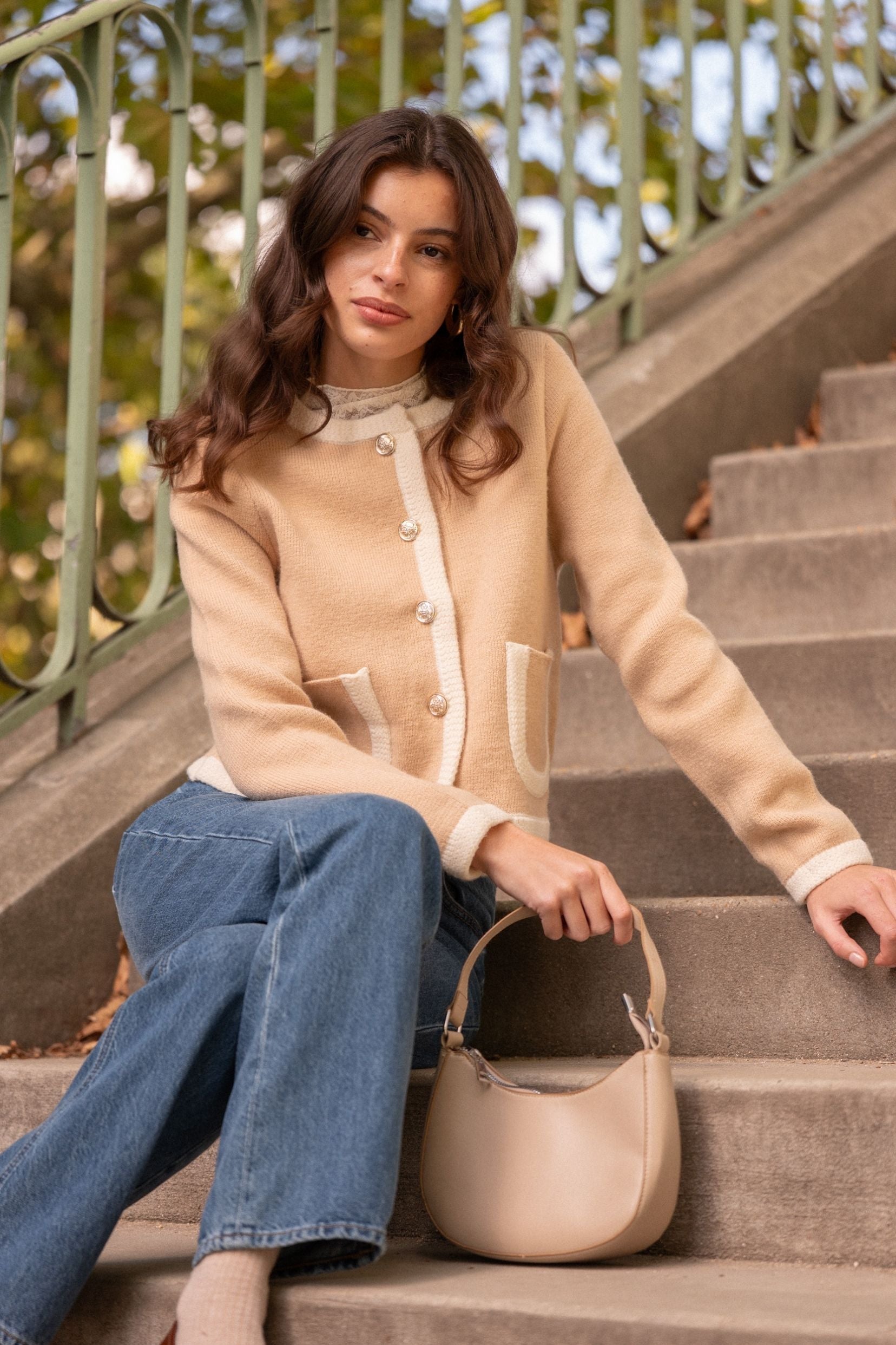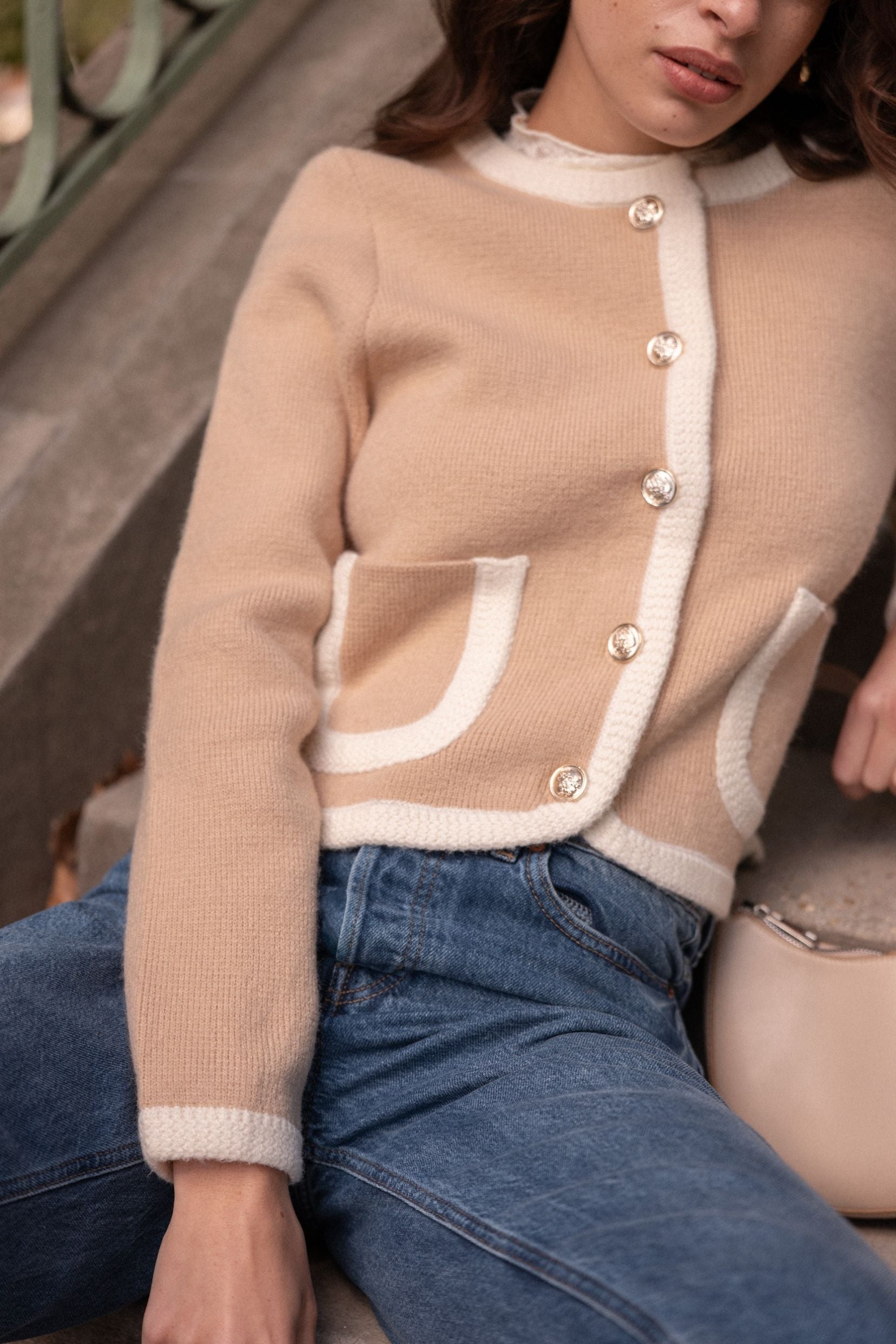 Ce gilet en maille séduit par sa coupe droite et son encolure ronde délicate. Ses bords contrastés, soulignés d’un liseré clair, mettent en valeur la fermeture à boutons nacrés et les deux poches plaquées à l’avant. Une pièce où simplicité et raffinement s’unissent avec justesse.