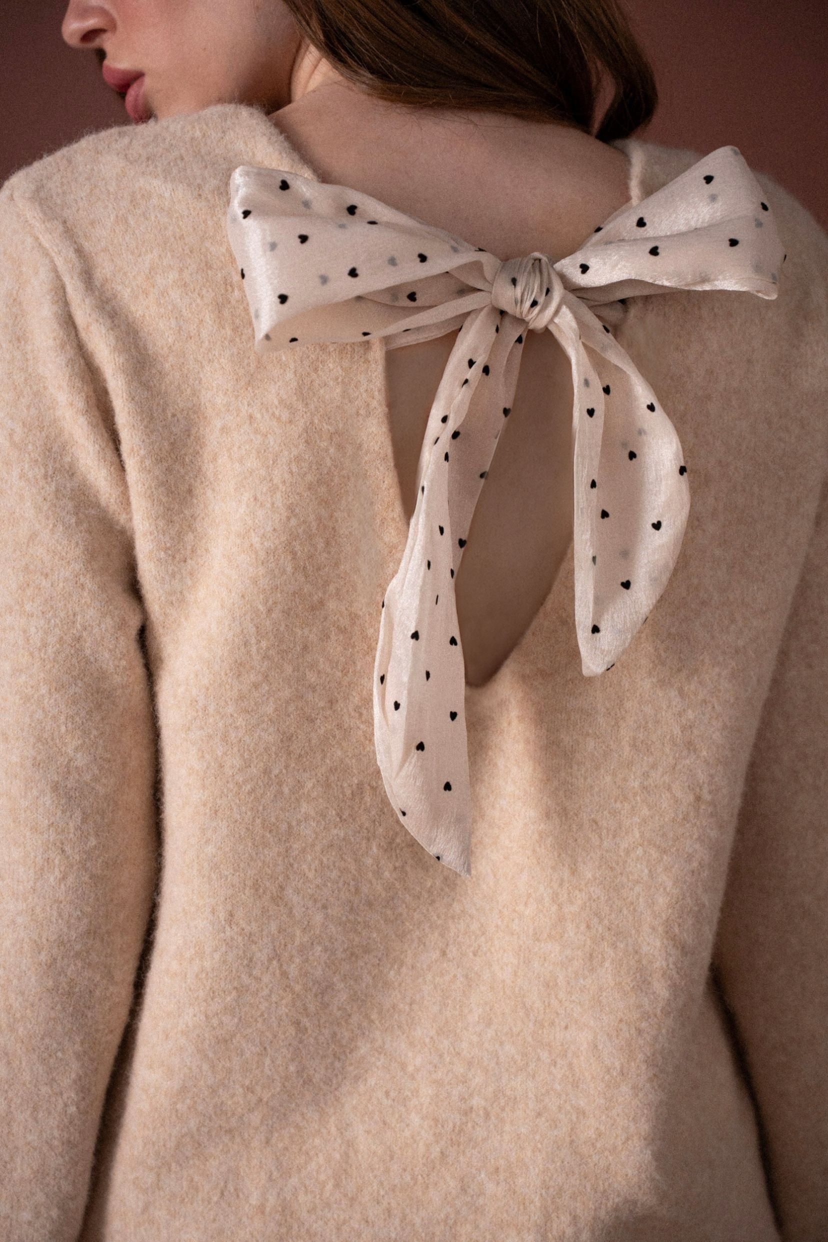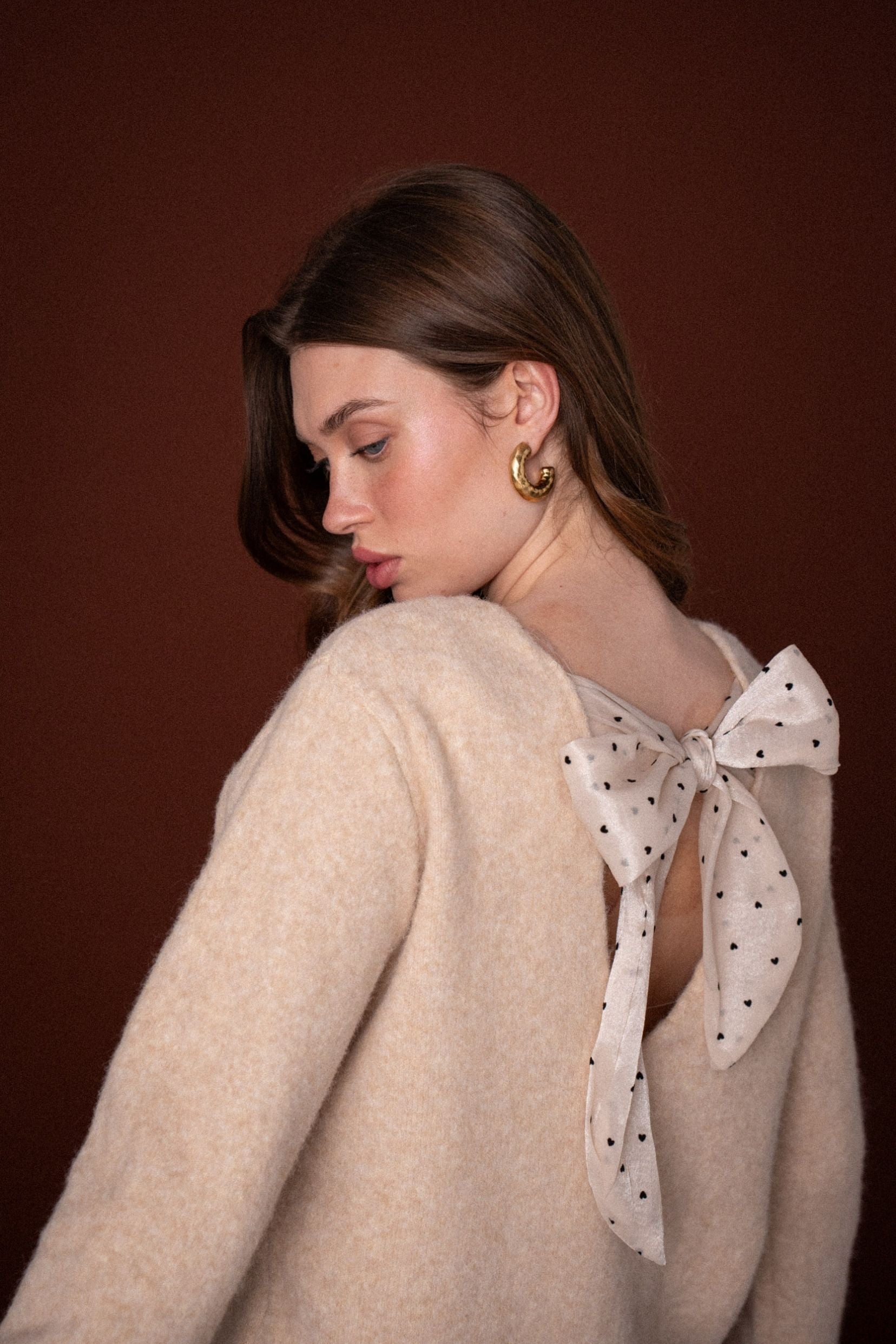 Son grand nœud à pois, noué sur une ouverture subtile, dévoile juste ce qu’il faut de féminité. Sa coupe droite et sa maille douce offrent un tombé fluide et confortable, parfait pour toutes les occasions.