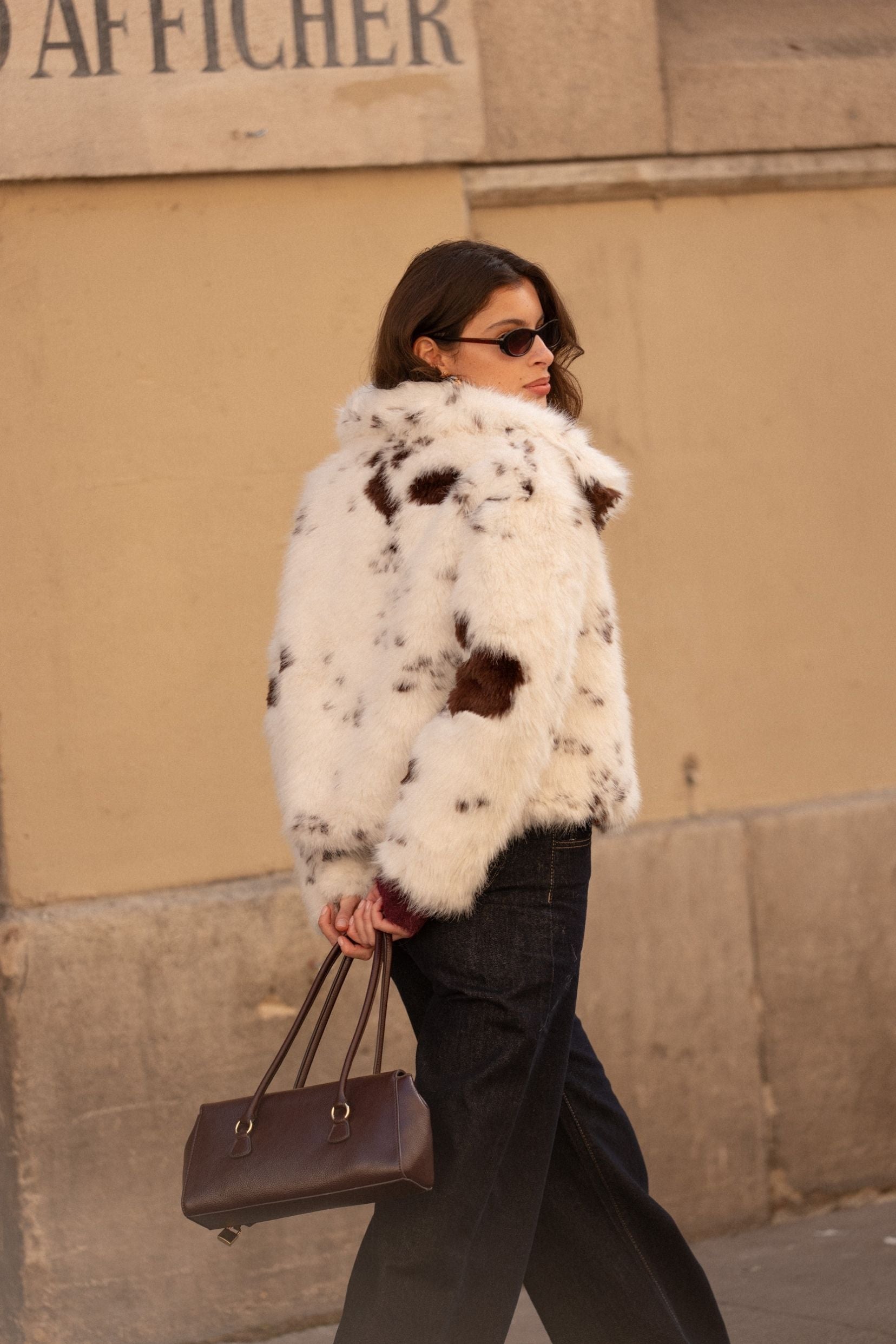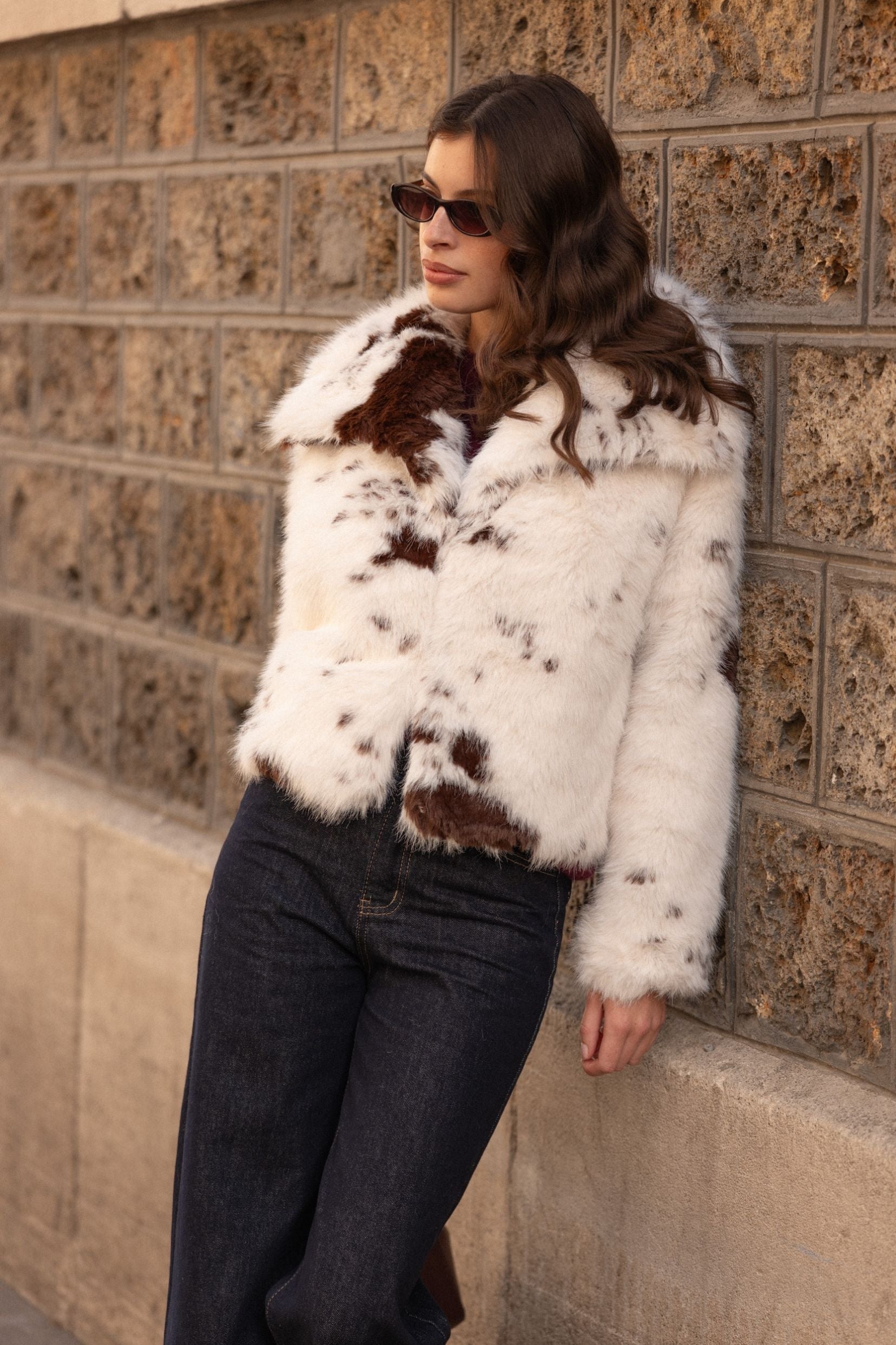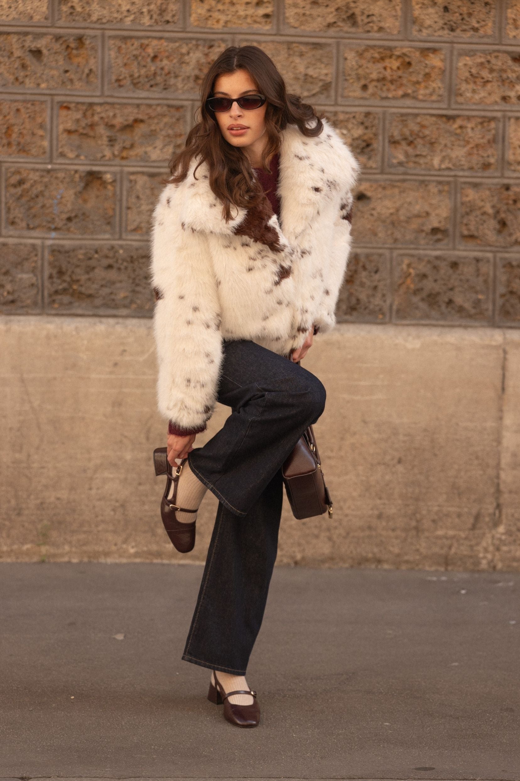 Cette veste en fausse fourrure séduit par son volume droit et son large col à revers. Son motif tacheté lui confère une allure singulière, à mi-chemin entre audace et douceur. Un essentiel statement qui capte tous les regards.