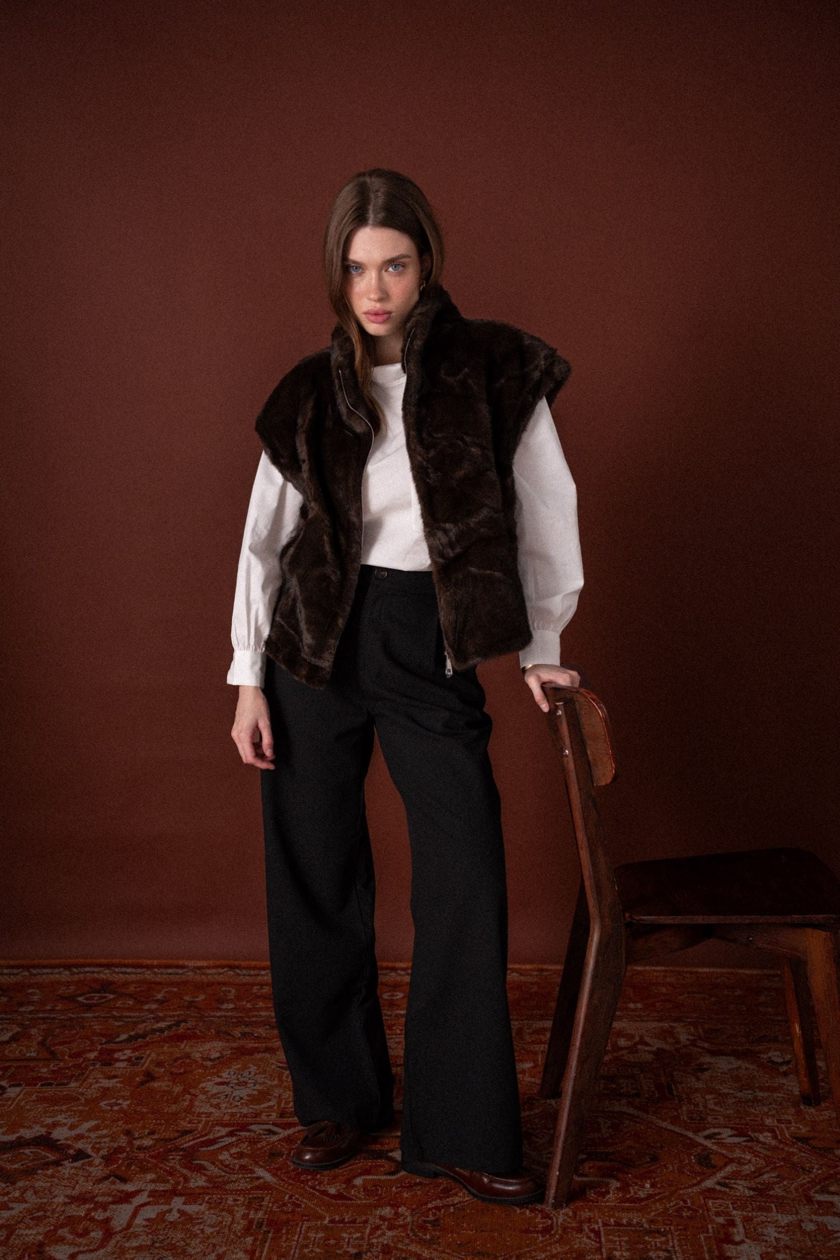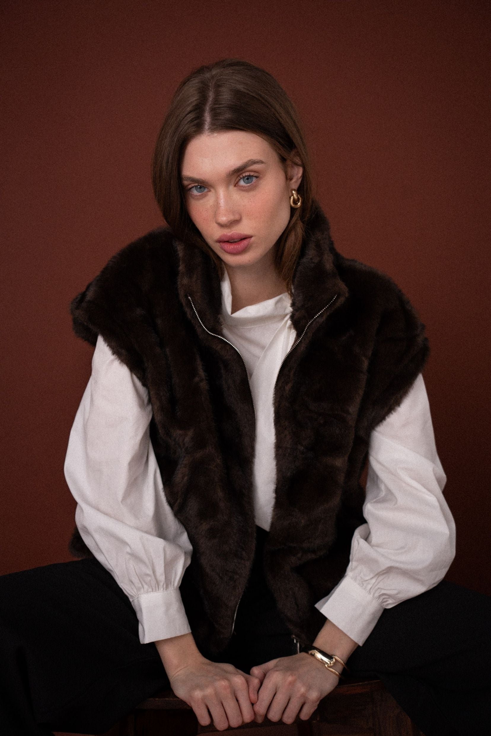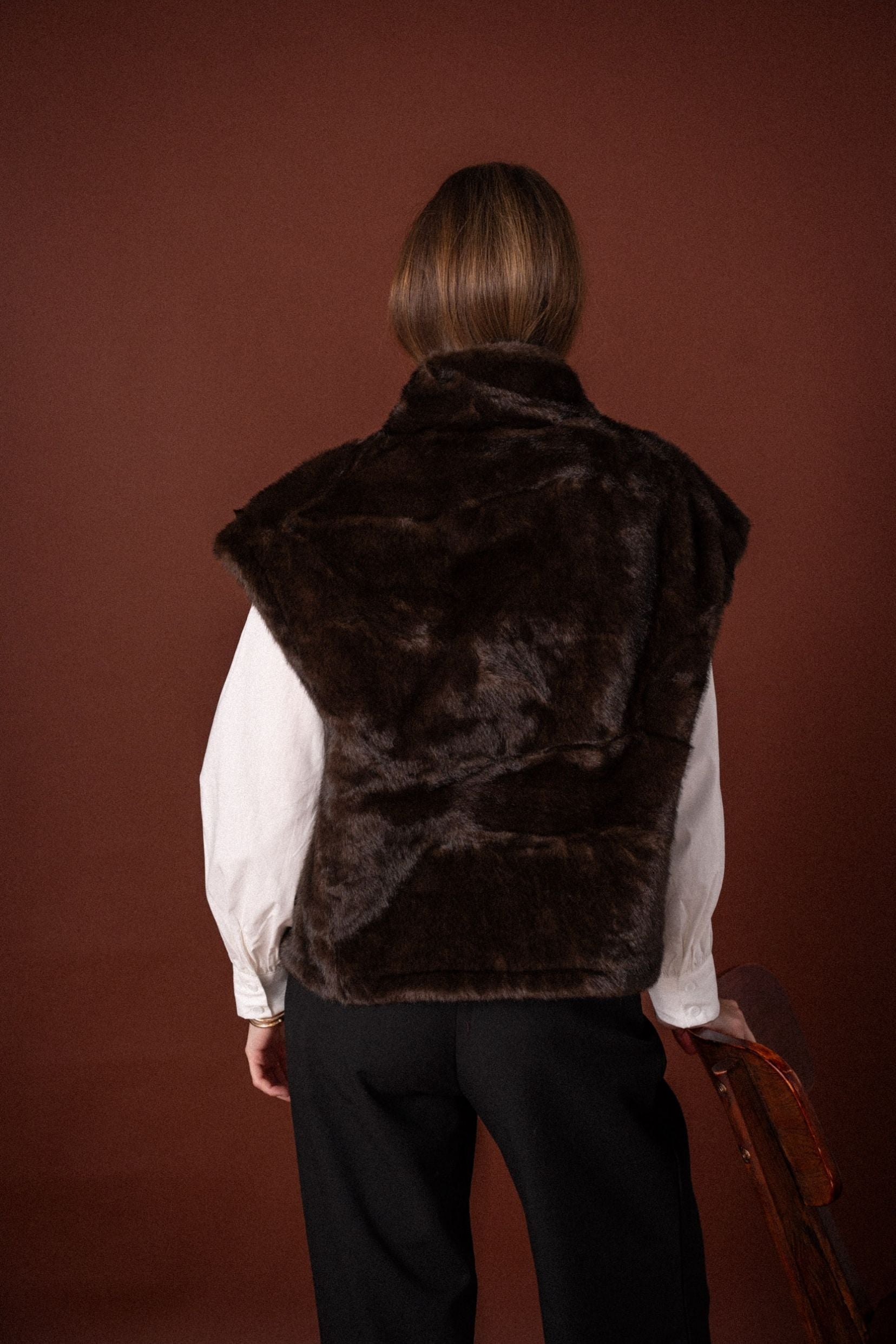 Confectionnée dans une fausse fourrure d’un brun profond, elle allie chaleur et élégance avec une touche vintage. Son col montant et sa coupe légèrement oversize en font une alliée parfaite pour les journées fraîches.