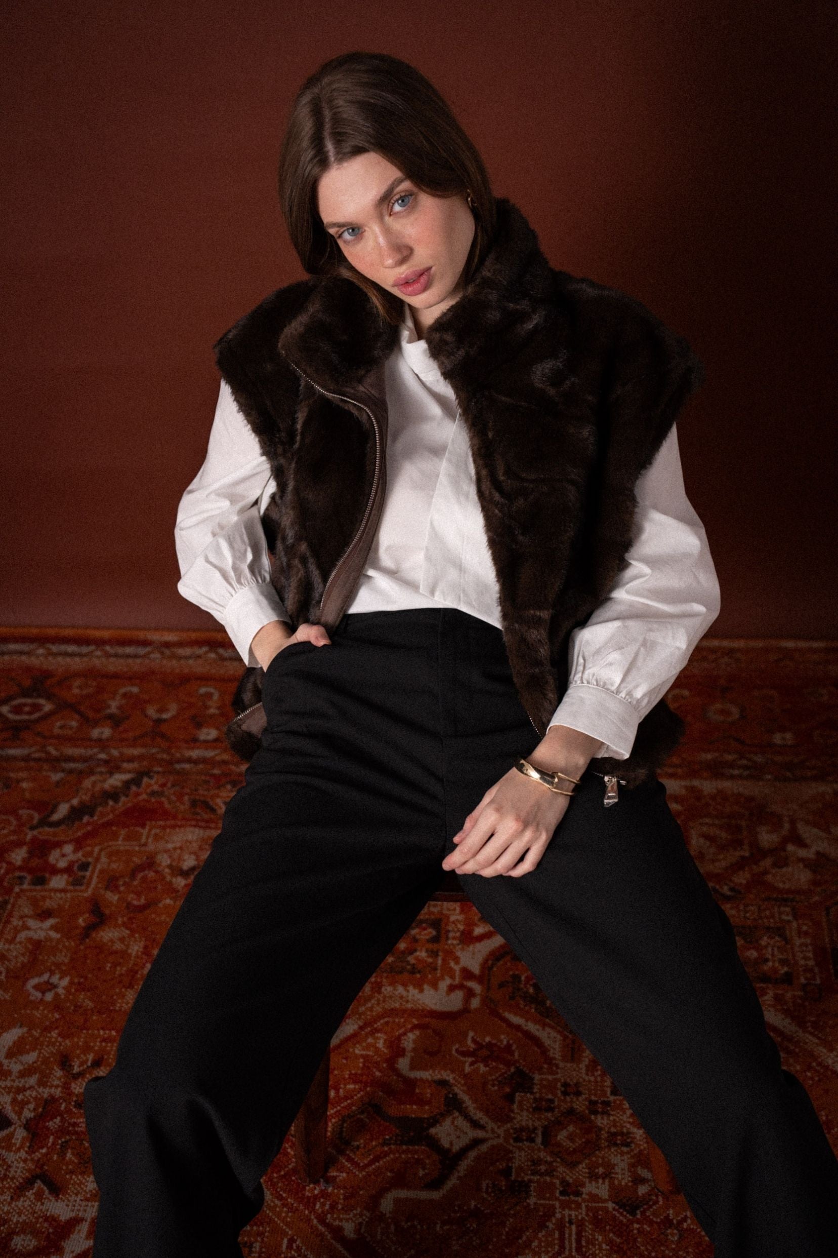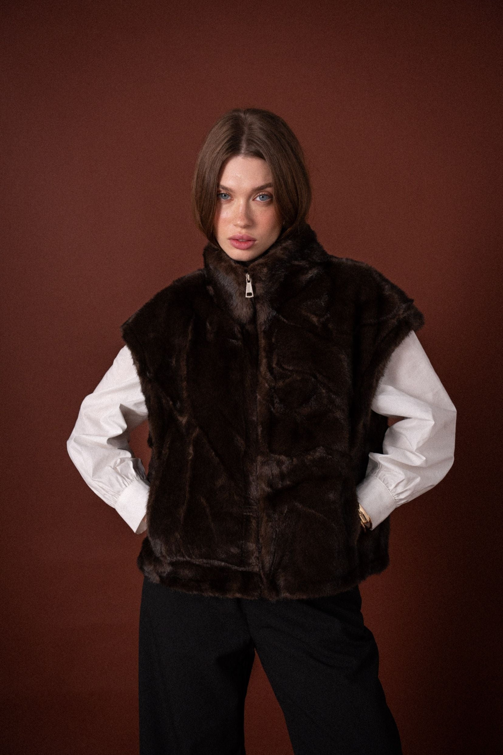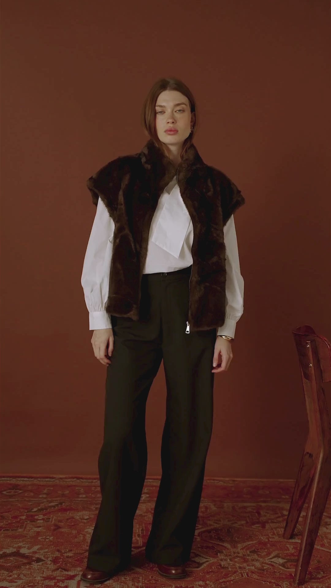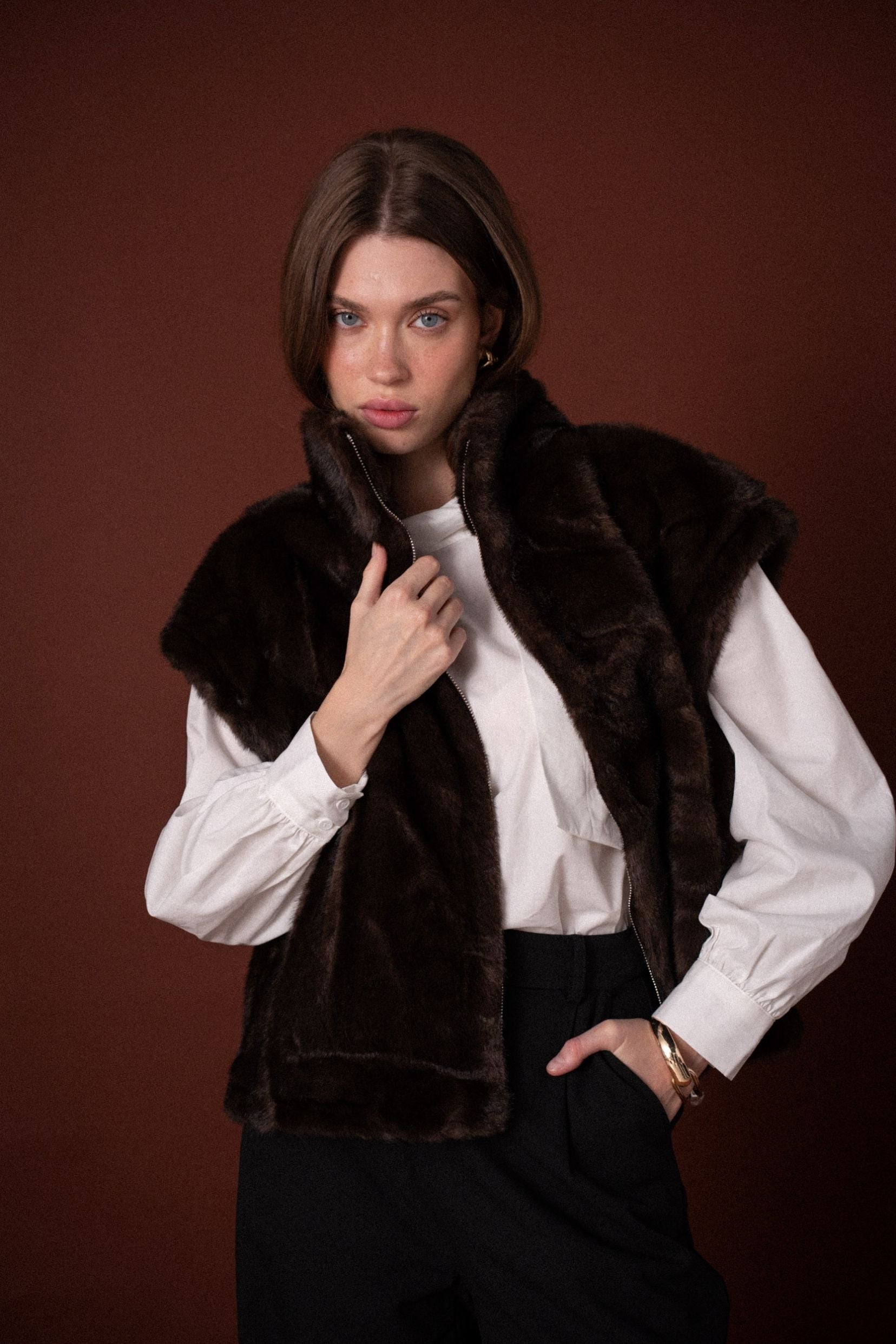 Confectionnée dans une fausse fourrure d’un brun profond, elle allie chaleur et élégance avec une touche vintage. Son col montant et sa coupe légèrement oversize en font une alliée parfaite pour les journées fraîches.