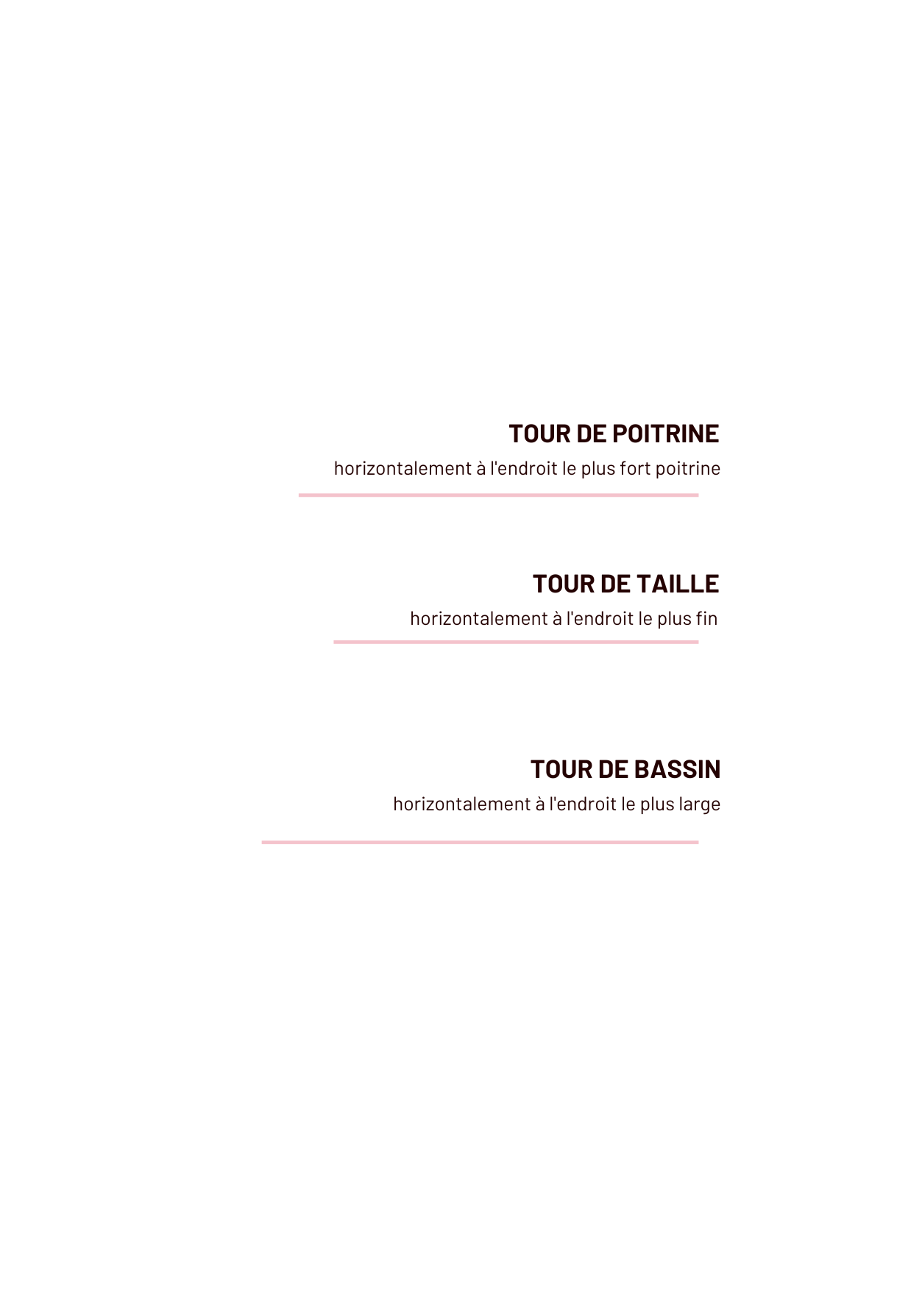 Afin de trouver votre taille, veuillez vous munir d'un mètre-ruban et de prendre les mesures directement sur votre corps, sans serrer.