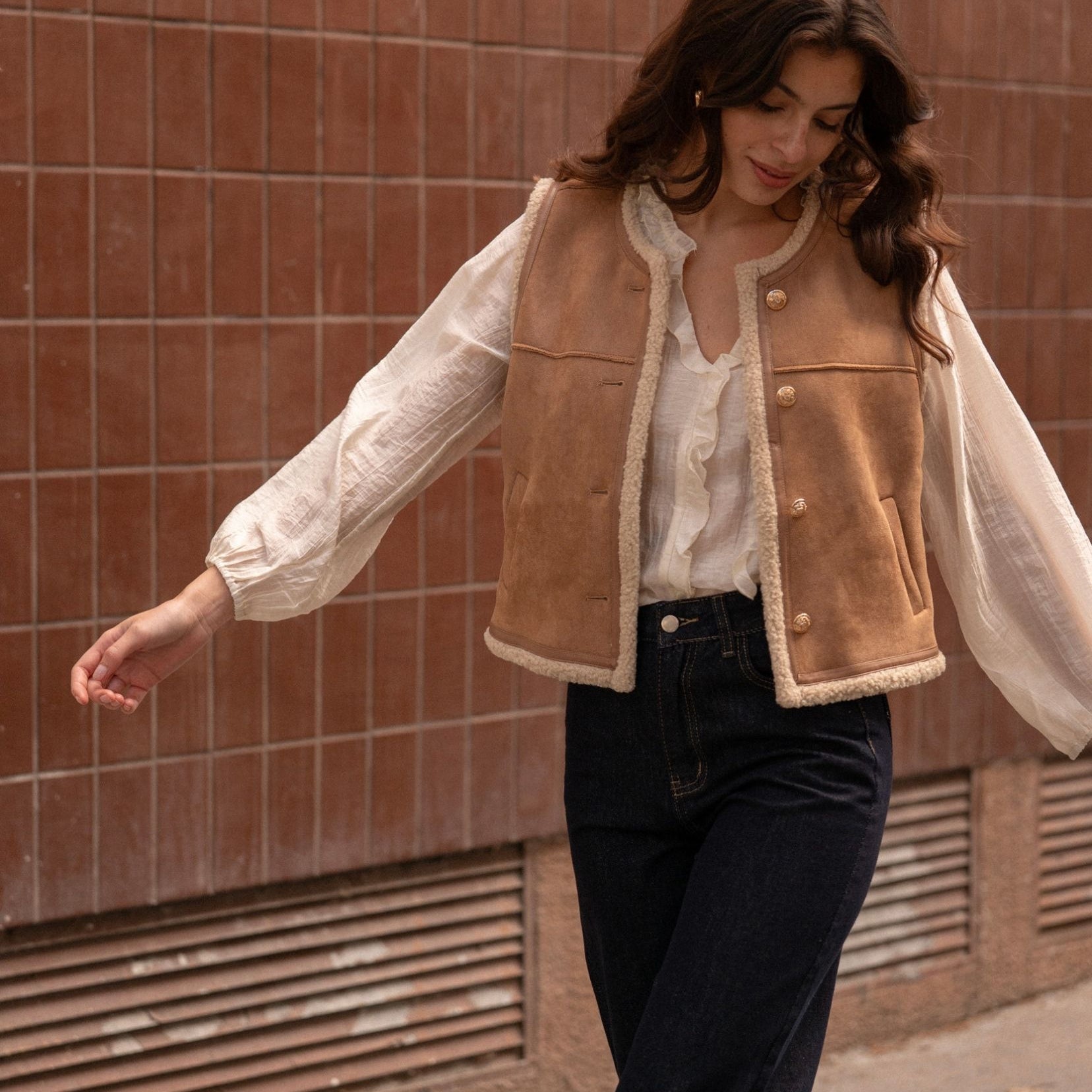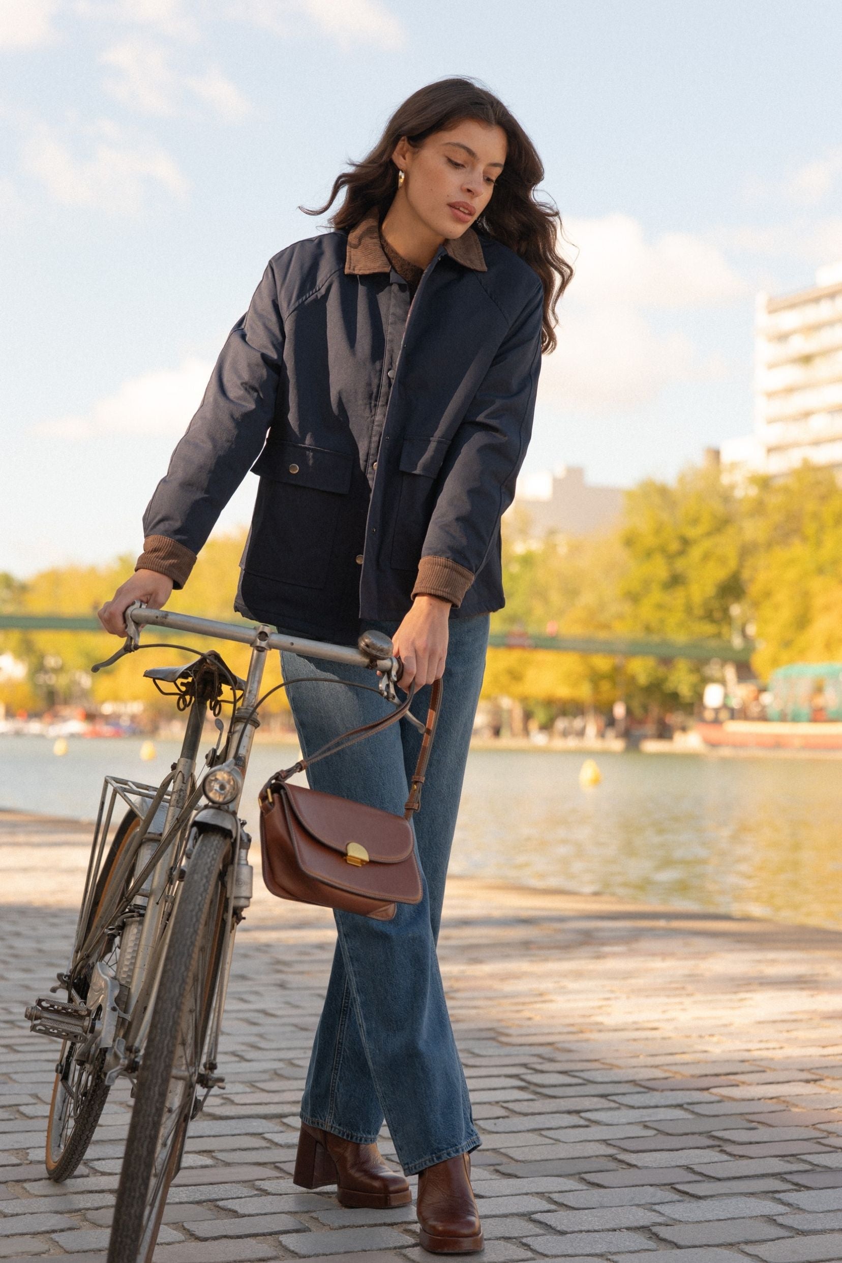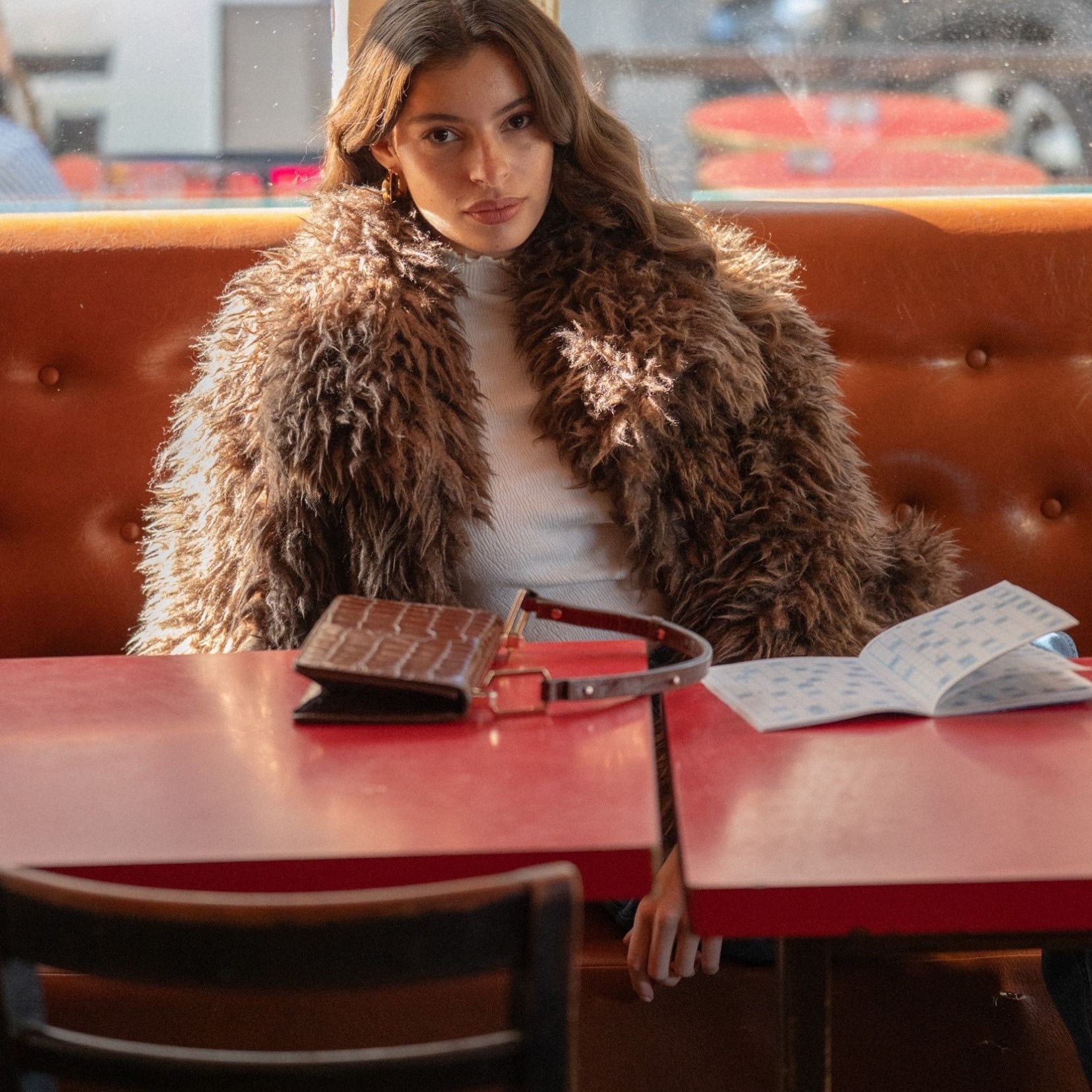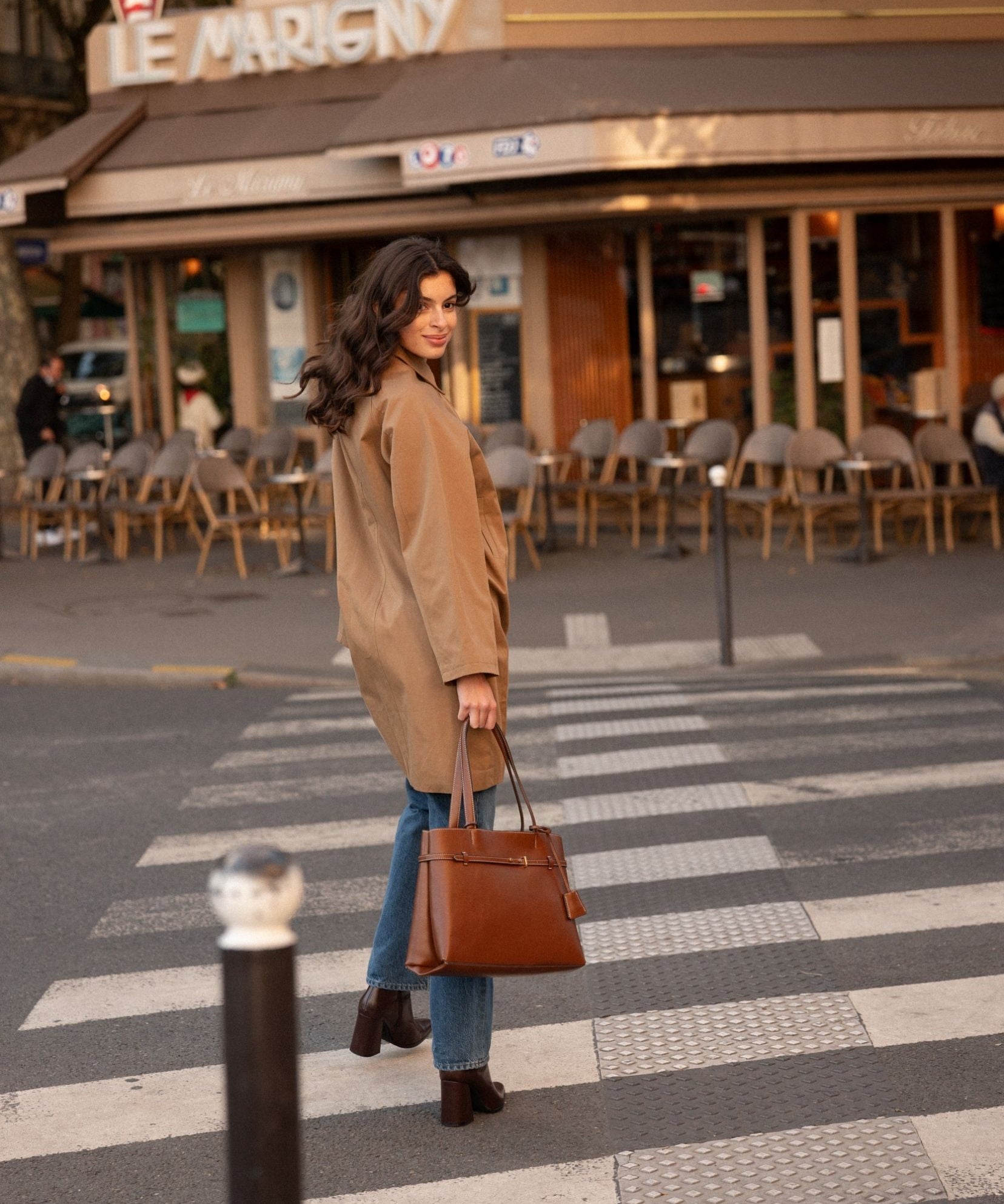 Les trenchs légers s’imposent comme des compagnons de route, les manteaux en fausse fourrure enveloppent les épaules d’une chaleur feutrée, tandis que les mailles, douces comme une étreinte, se déclinent en teintes ambrées, camel ou noisette. Chaque pièce raconte une histoire d’automne Celle d’une Parisienne qui flâne sans hâte, les mains dans les poches, le regard accroché à la lumière dorée qui glisse sur le canal.