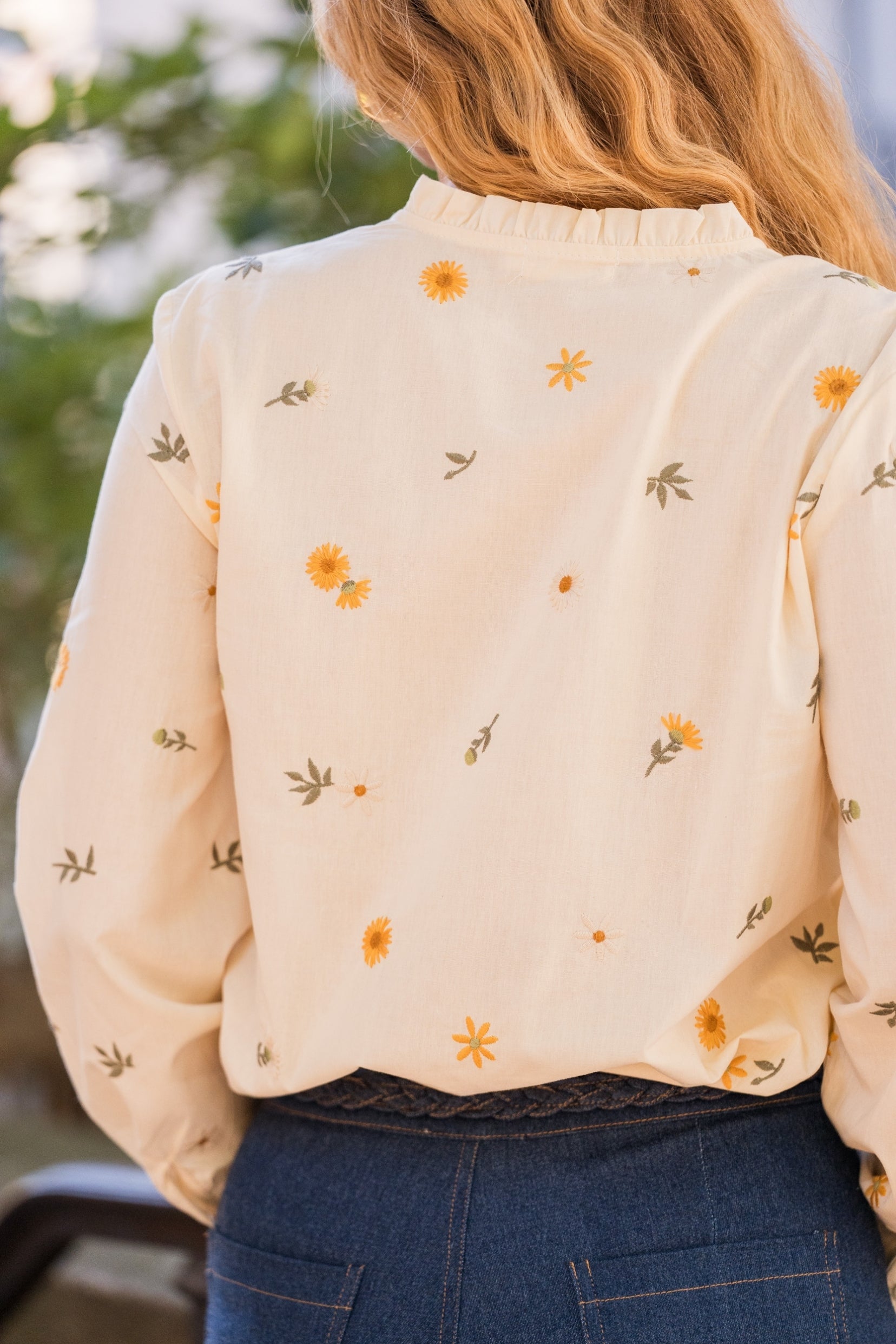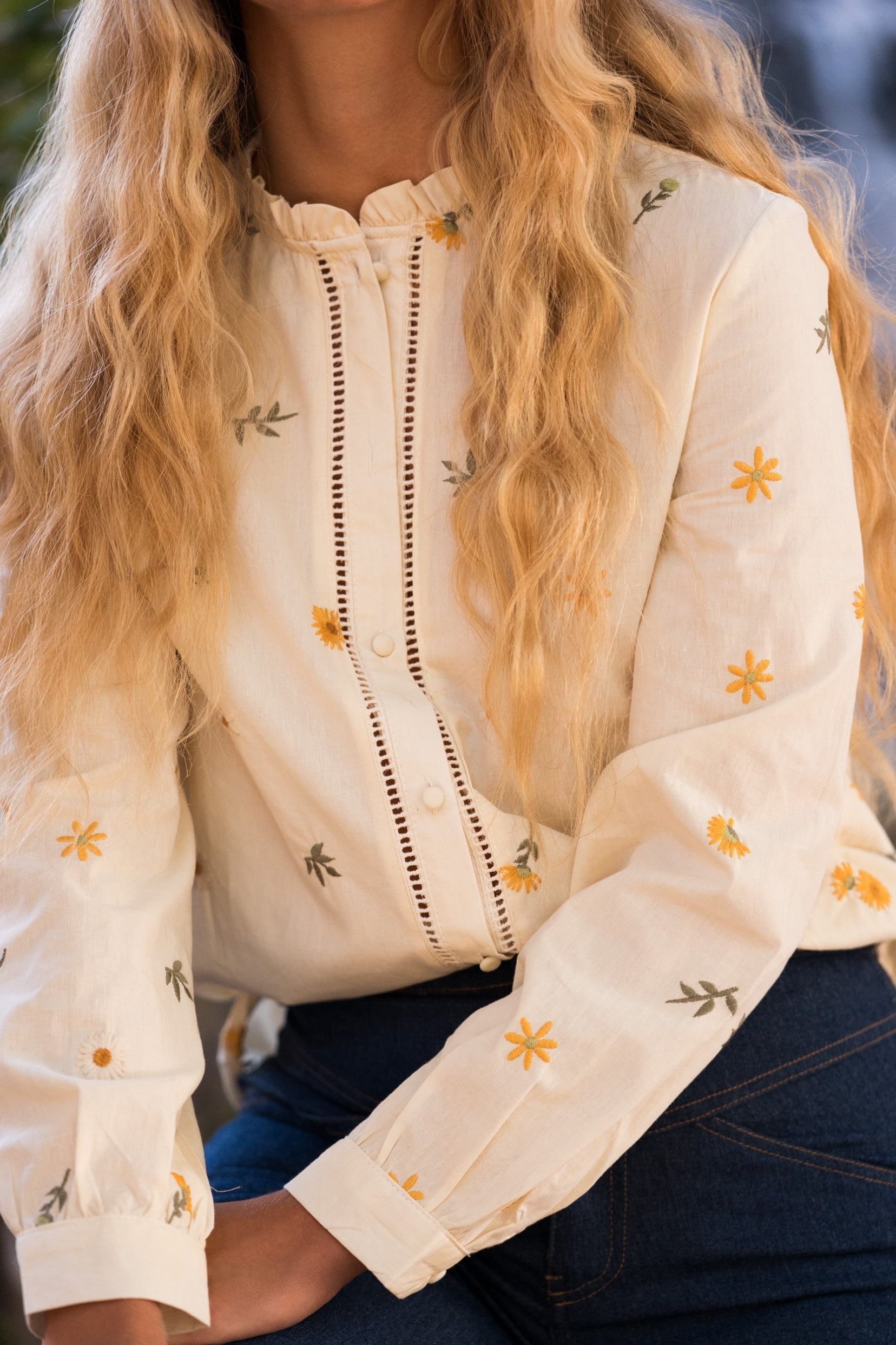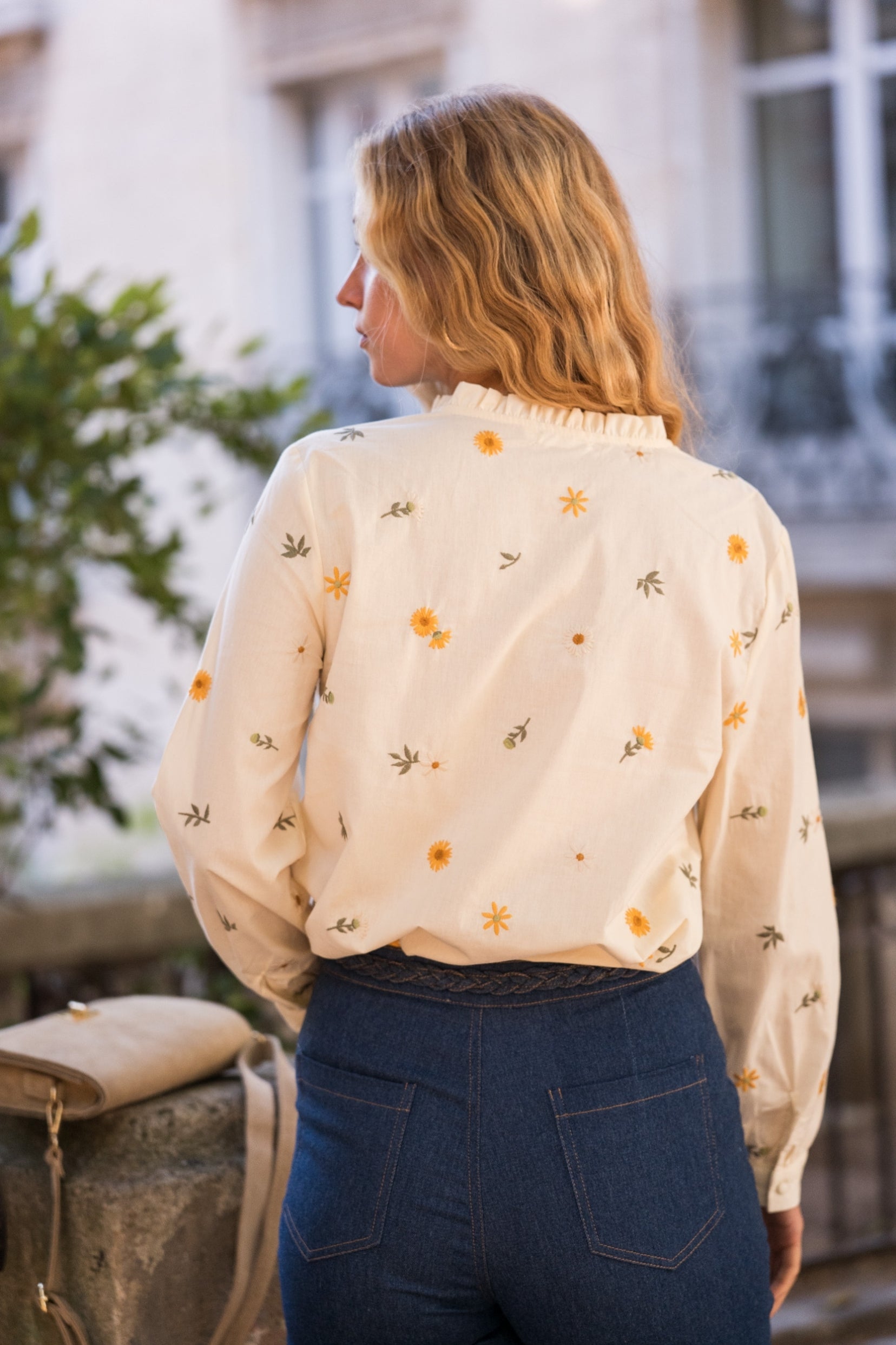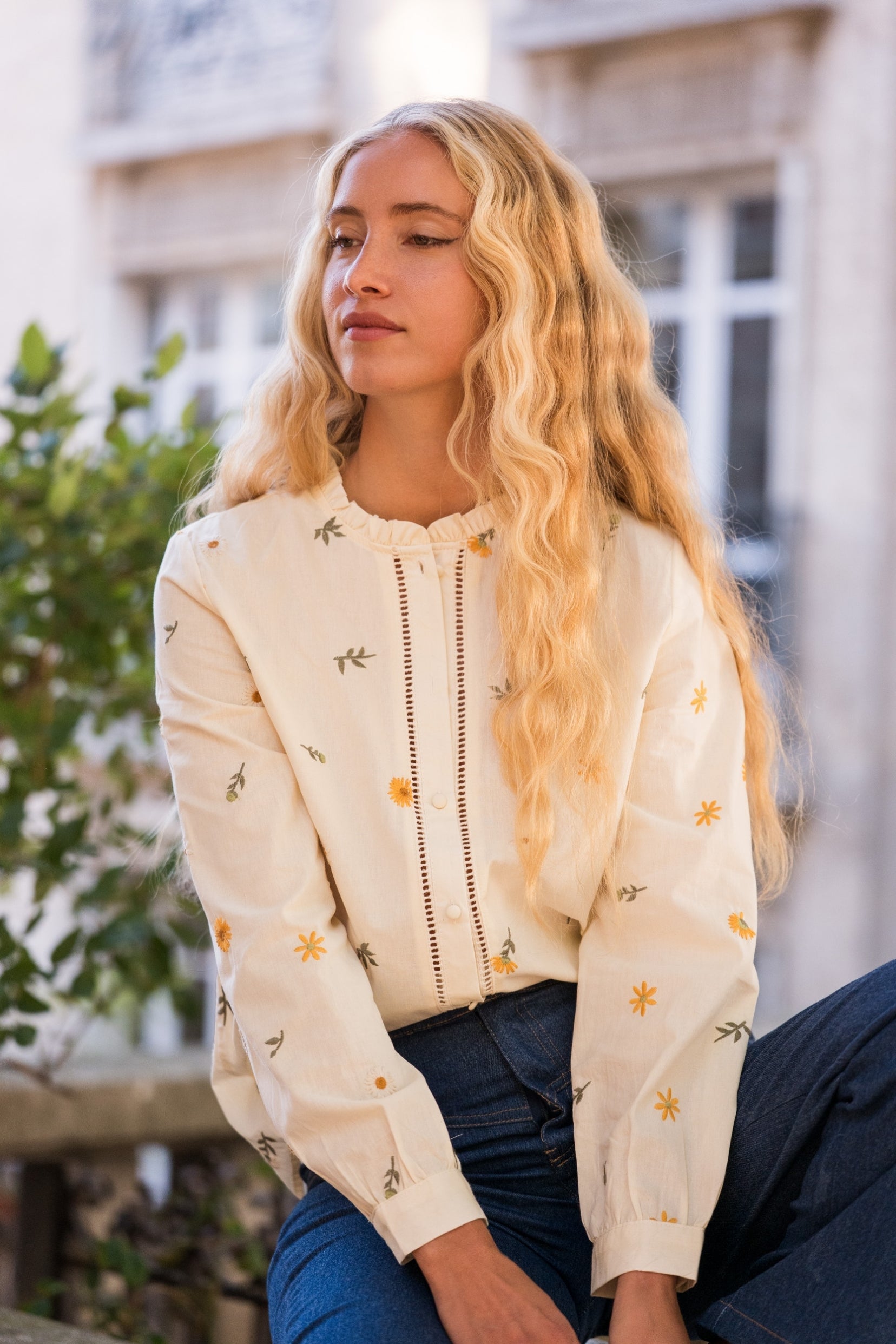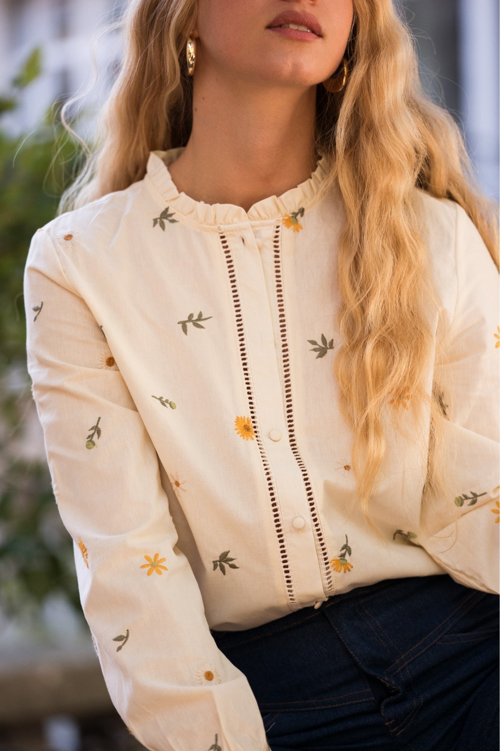 Élégante et facile à associer, la chemise Lilou séduit par ses détails soignés : un col rond orné d’un volant discret, des manches longues boutonnées aux poignets et une longueur standard qui tombe naturellement sur les hanches. Le galon fin qui longe la patte de boutonnage lui confère une touche intemporelle.