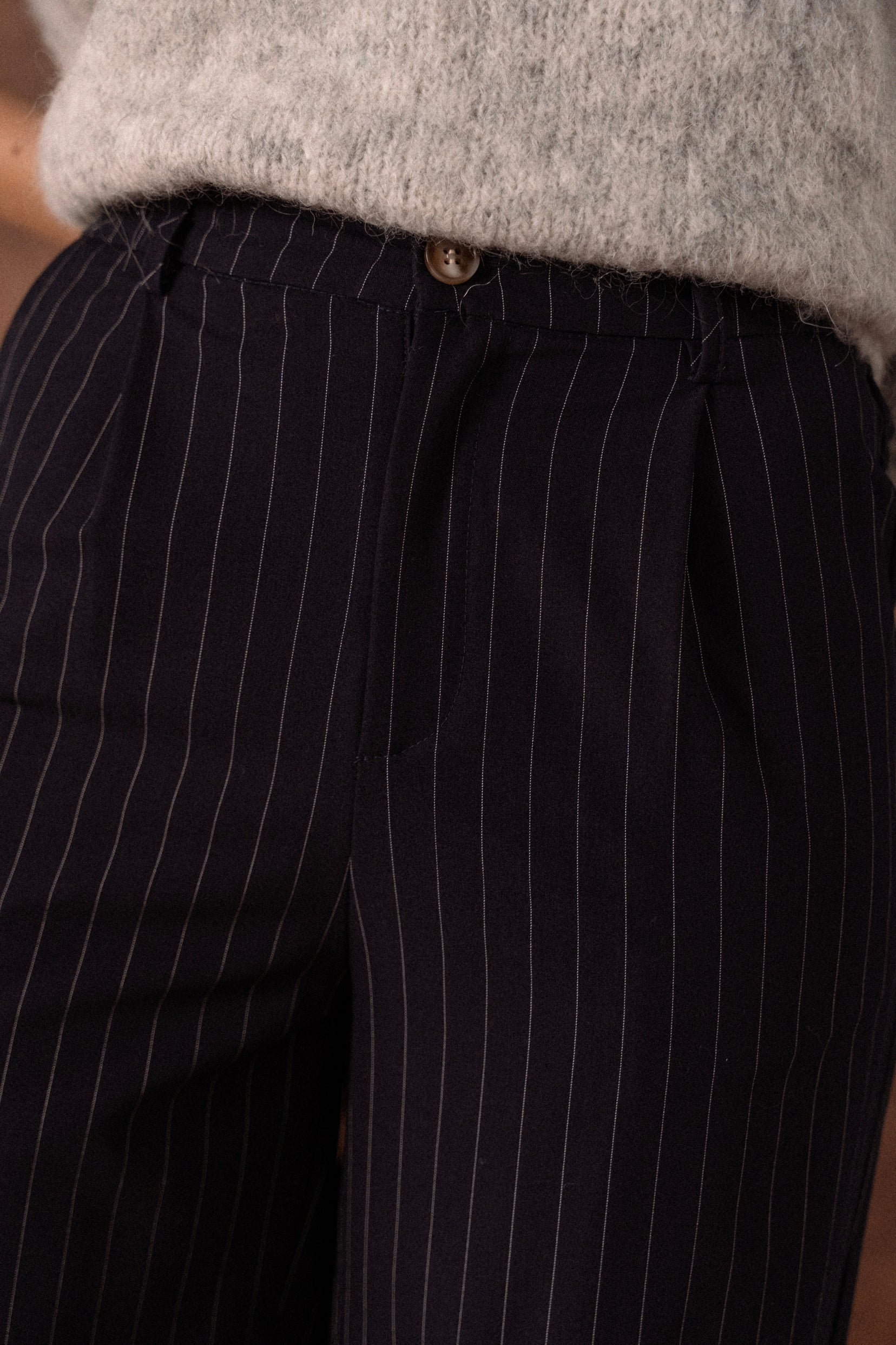 Le pantalon Janine se distingue par son style intemporel et élégant, mettant en valeur une coupe droite qui affine la silhouette. Ses fines rayures apportent une touche de sophistication subtile, tandis que ses poches latérales ajoutent une praticité discrète.