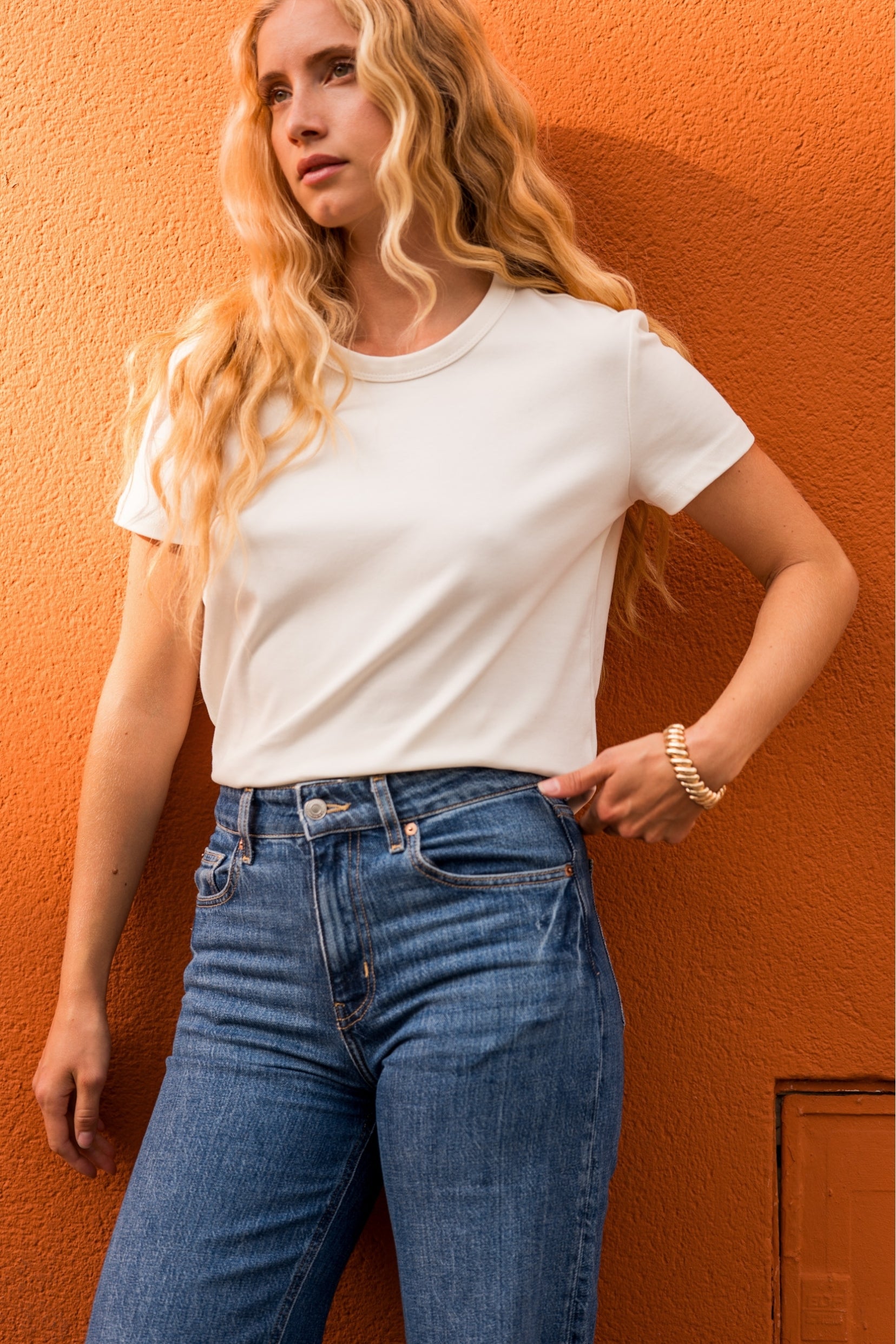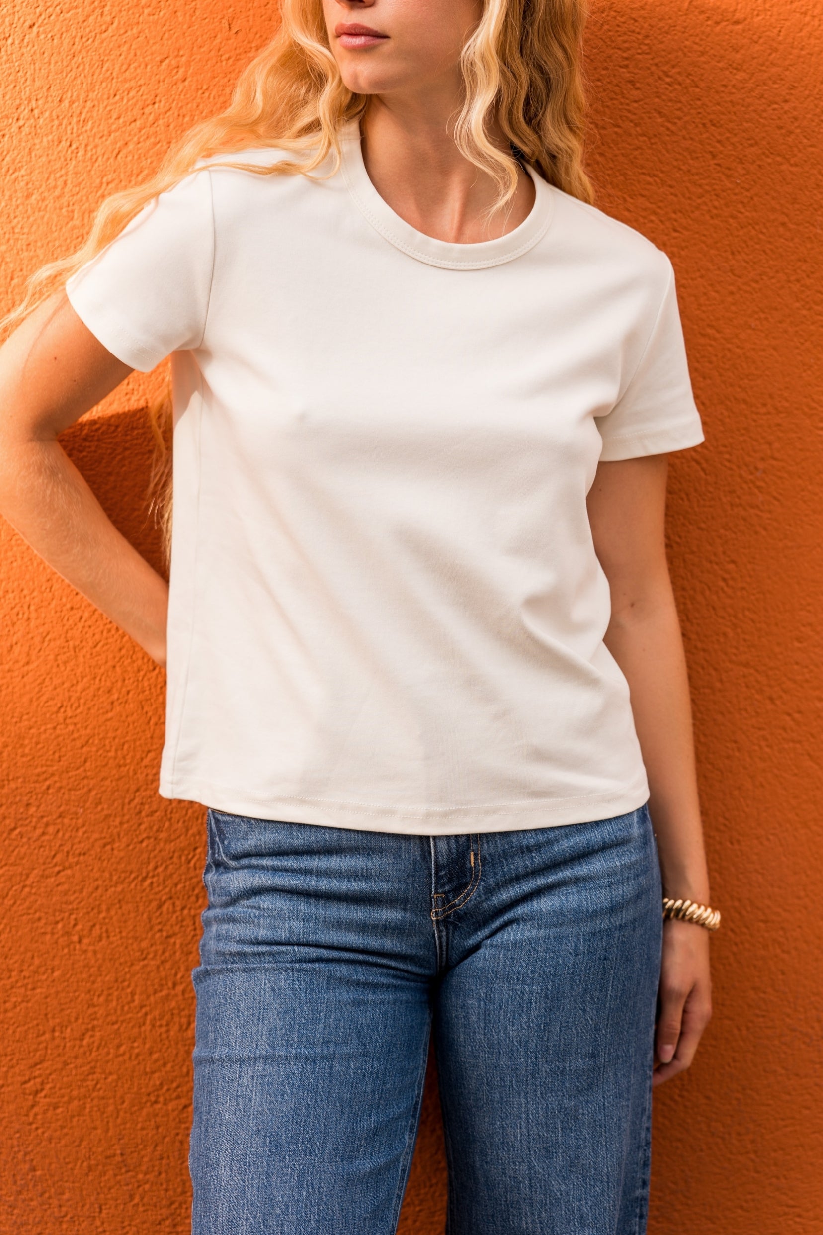 Le tee-shirt Émilie séduit par sa coupe droite et sa longueur standard, parfaite pour un tombé naturel sur les hanches. Ses manches courtes et son col rond classique apportent confort et simplicité, tandis que les ourlets discrets soulignent une finition soignée.
